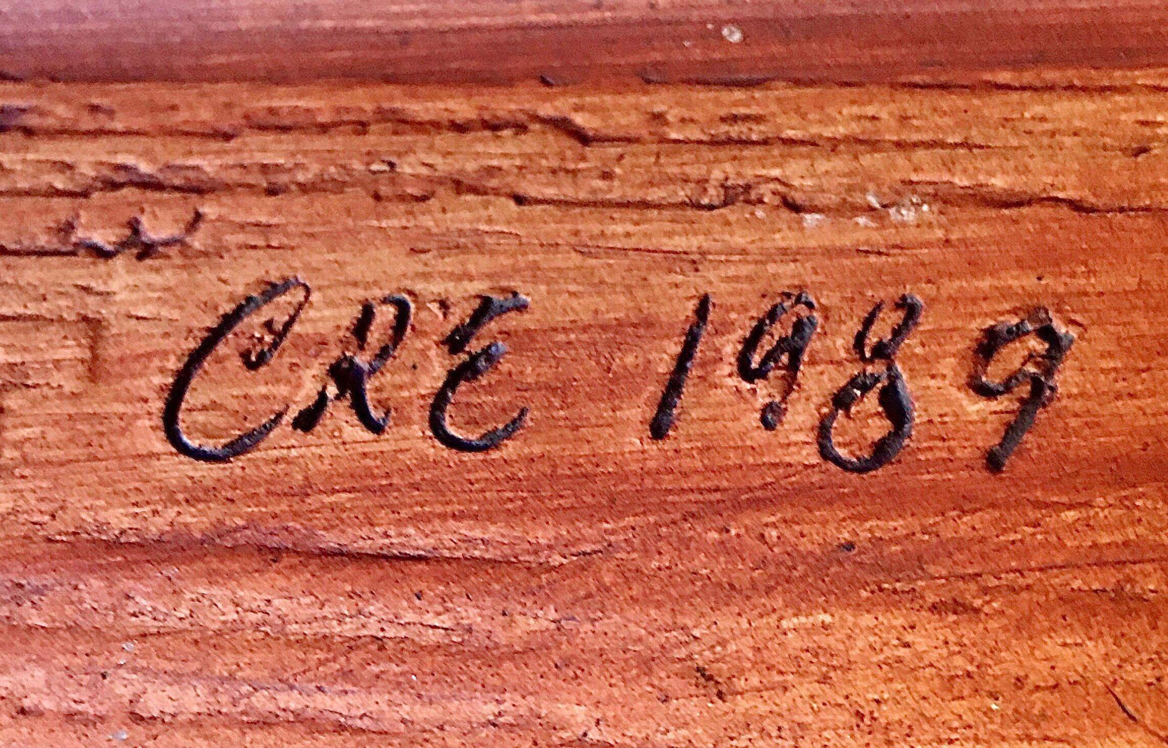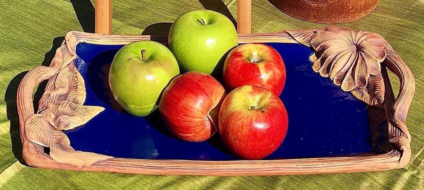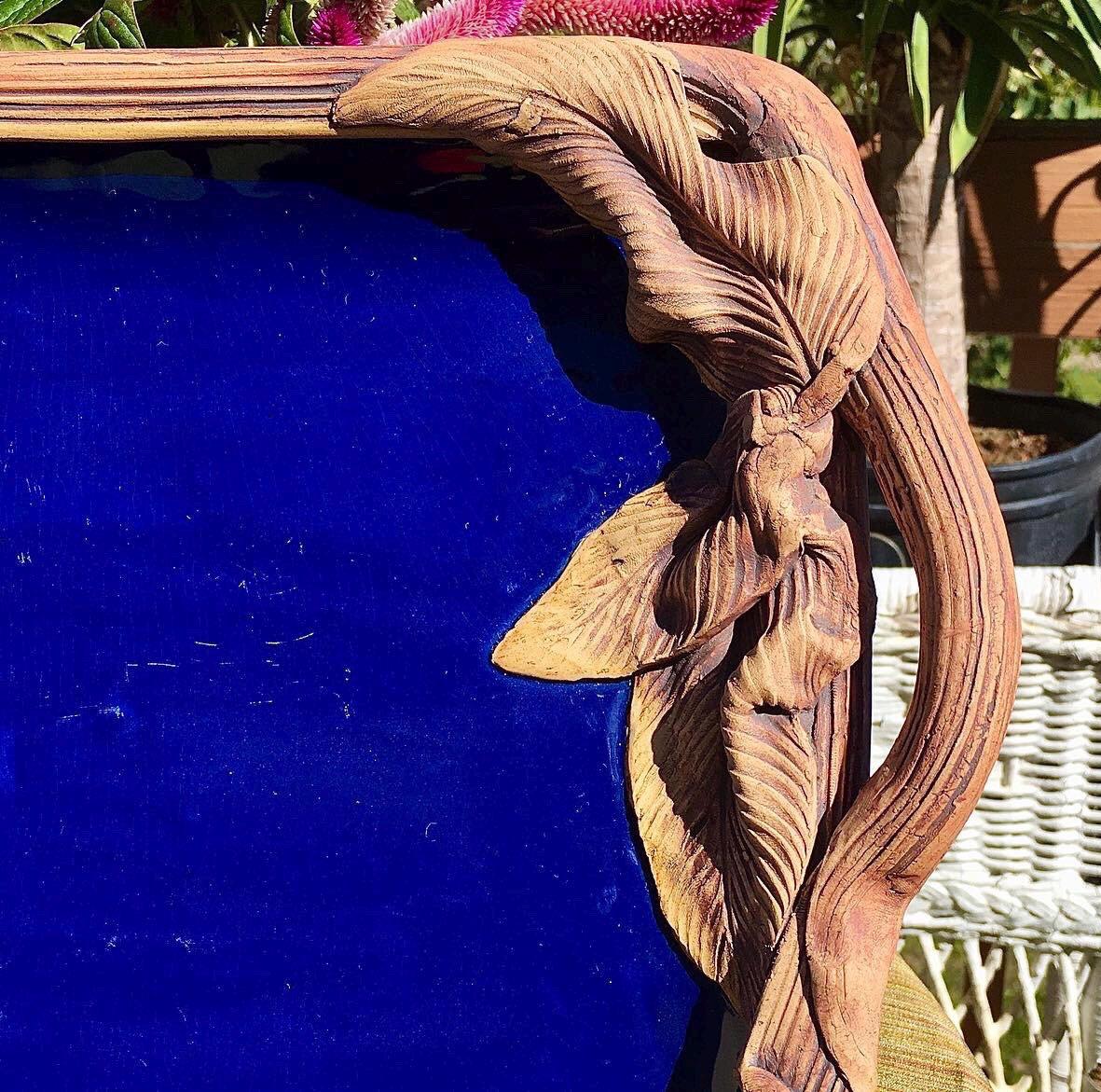 Exclusively TruffleandFig, Terra Firma Pottery. Beautiful Arts and Crafts Design handmade pottery detail’s are exquisite. Signed and dated by the Artist, this gorgeous vibrant blue glazed center and faux bois branches, with vines and flowers, make a stunning vintage centerpiece or charcuterie board. Halloween candy tray, perhaps. Option’s are endless, with this amazing Americana pottery. In excellent condition.
