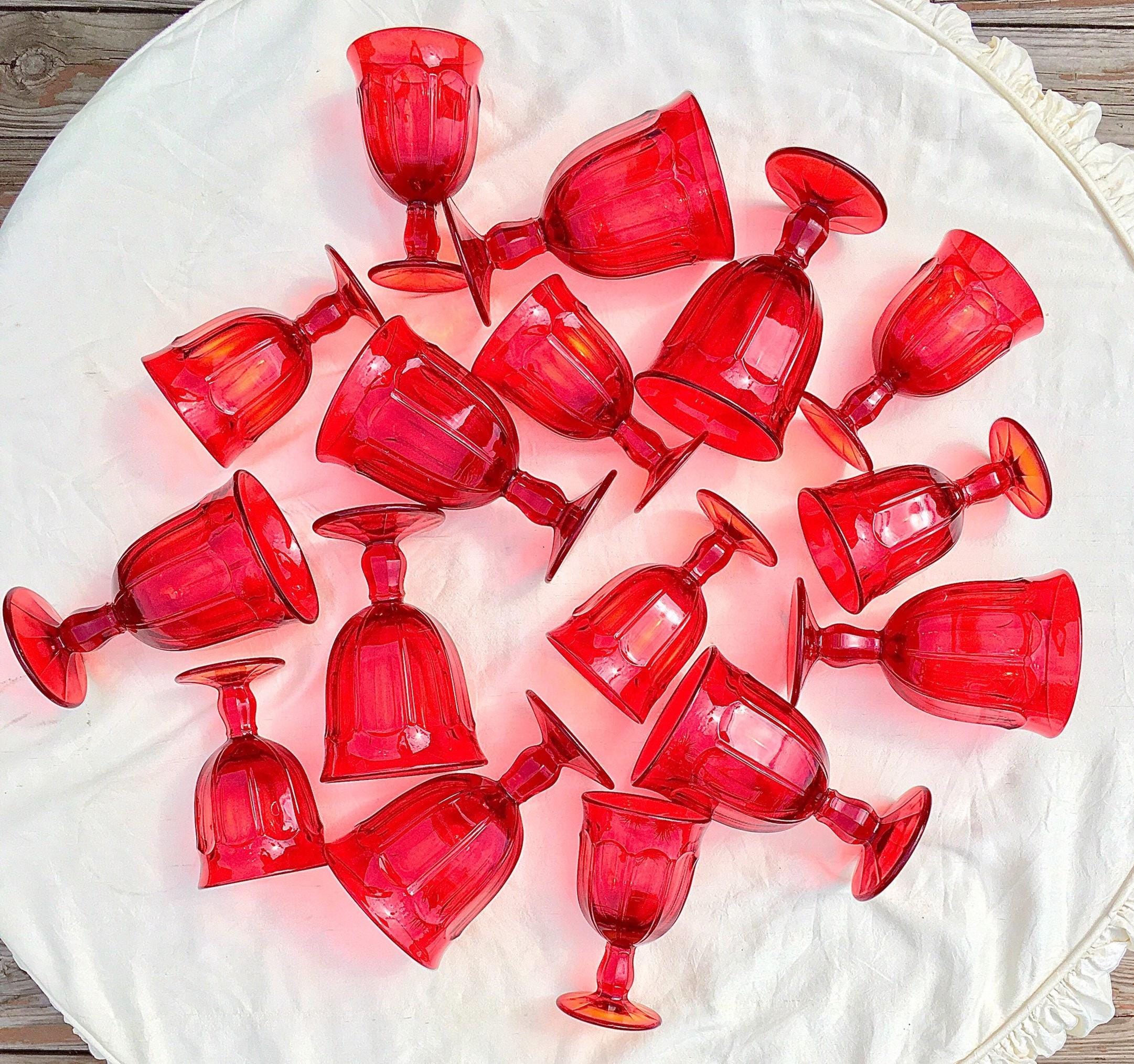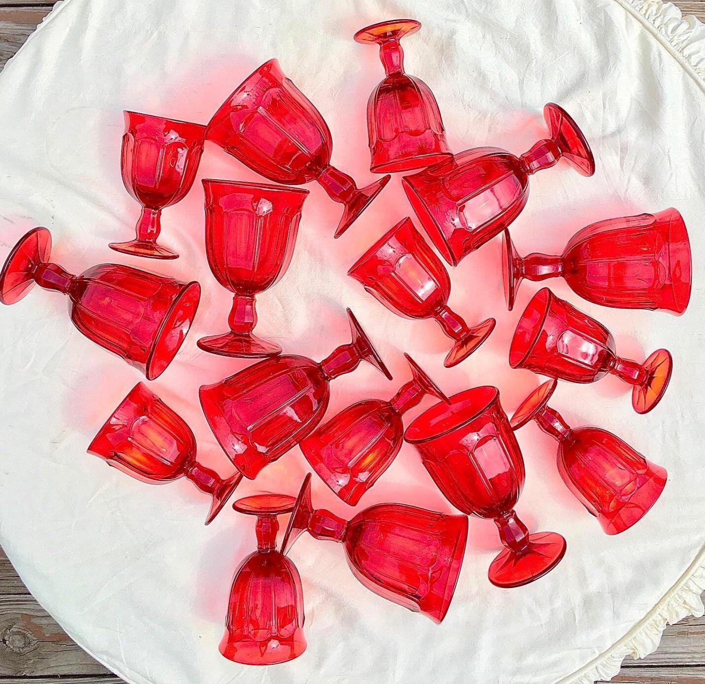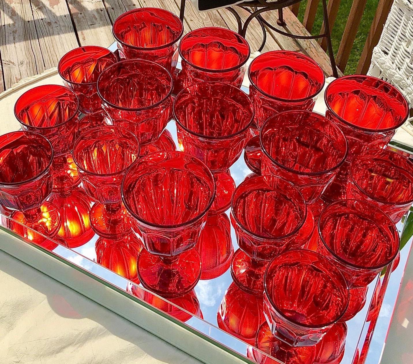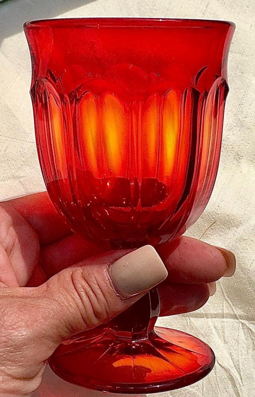 On Fire & burning up for the love of Amberina Glass. Phenomenal Set’s, yes Set’s! In the coveted Dalzell Amberina glass, in “Arlington” by vintage Viking Glass. Amberina Glass is literally a glow of glorious Ruby red and ombré of flaming orange yellow. This glow is obsessed with light, where one may appreciate these the most. This is perfection for the Holiday season and Holiday entertaining. Sensational year round.
