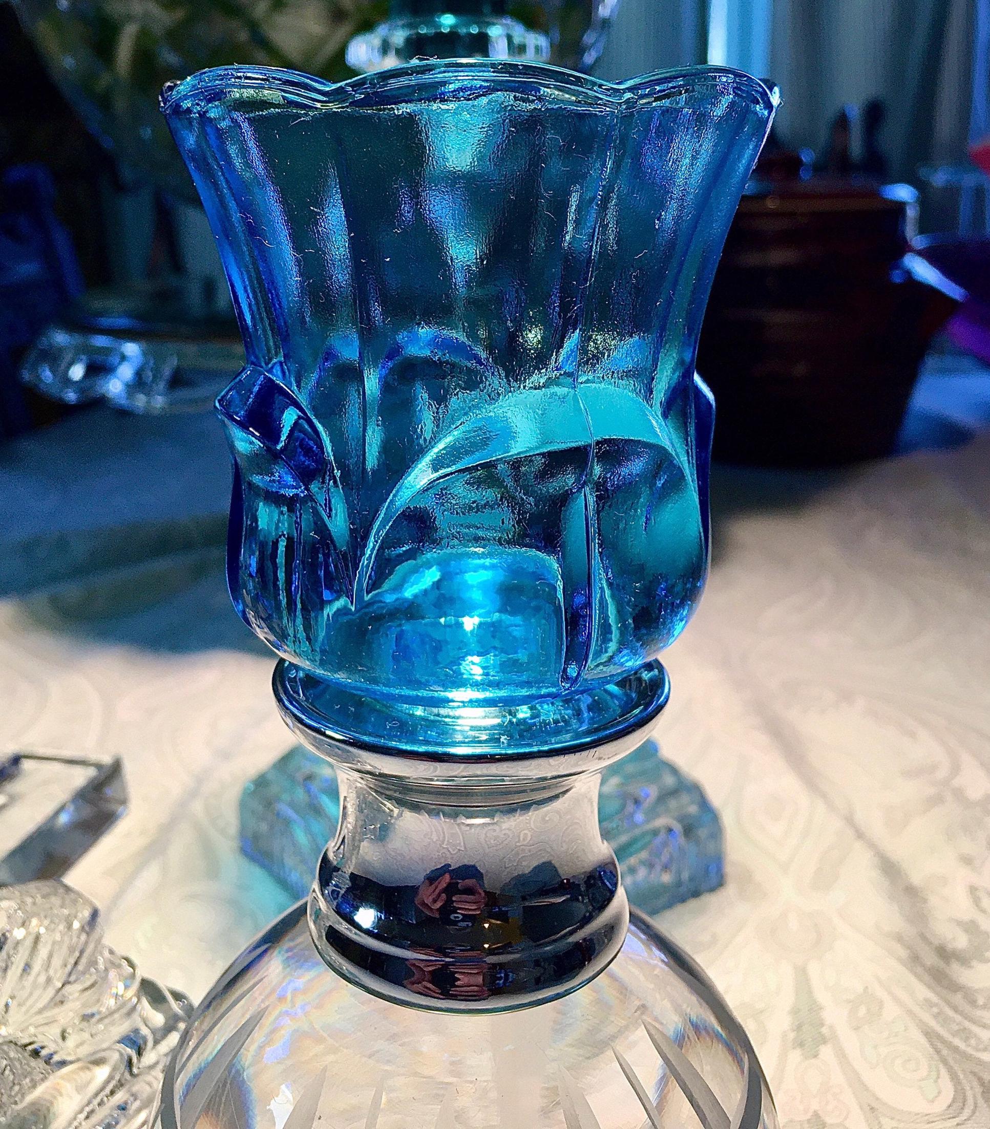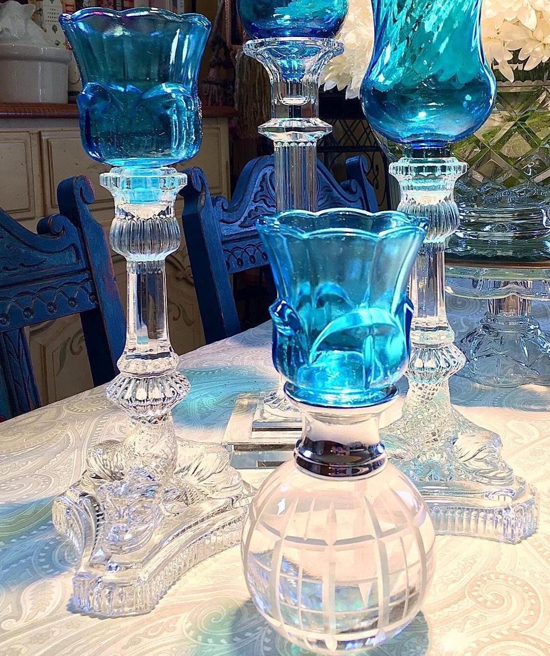 Take your candlelight to new heights. Gorgeous vintage votives or hurricane’s, in amazing blue topaz. Each pristine set possesses rubber gaskets for sturdiness (which may be removed for smaller taper’s). By vintage Homco in a tulip, and swirl glass.