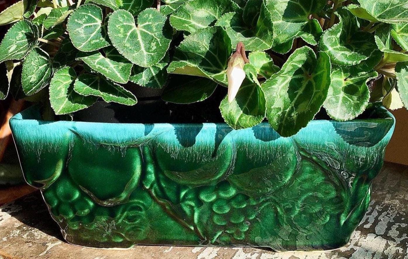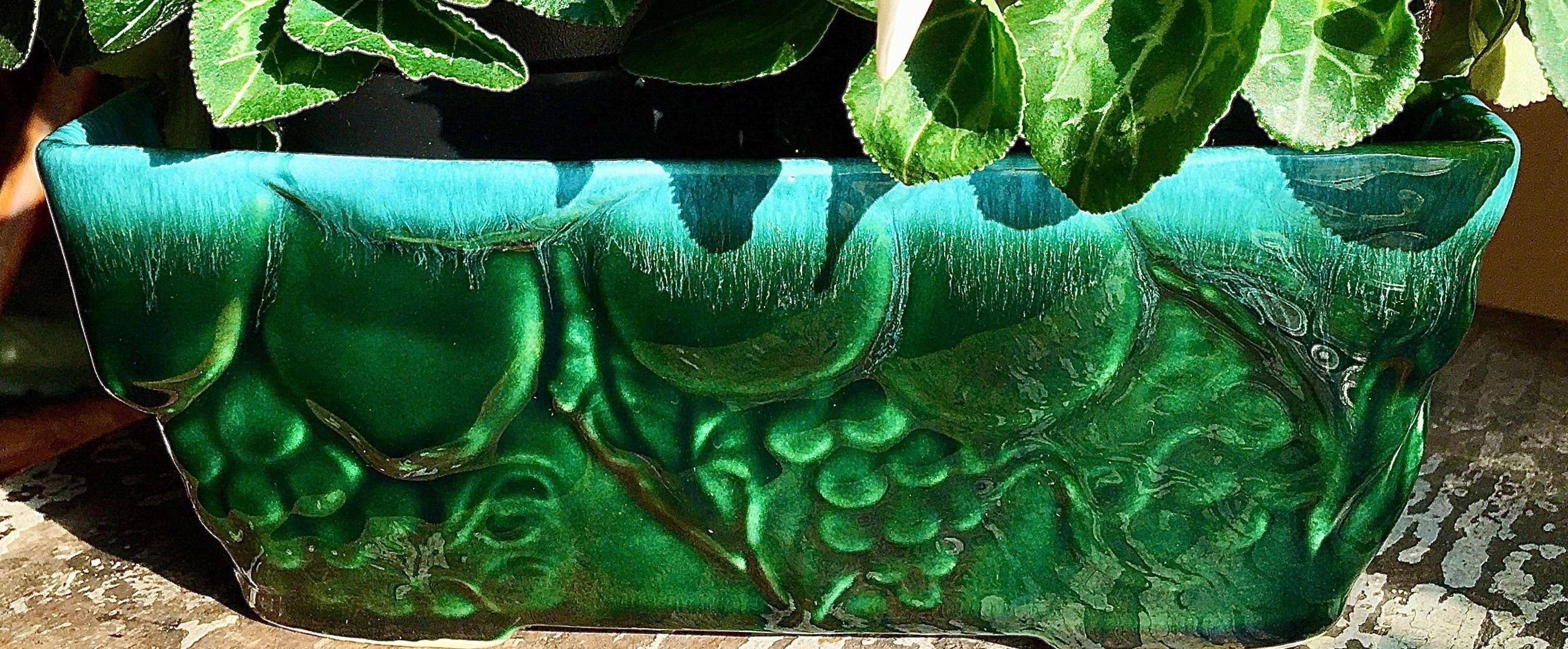 Vibrant green drip glaze by Hull pottery USA. So sublime with a celadon merging into emerald greens, Beautiful surrounding grape and vine relief. In pristine condition.
