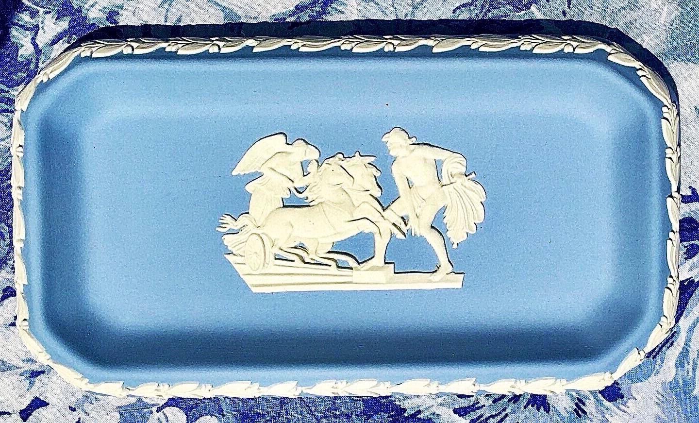 Wedgwood Blue vintage trinket dish. Adorned with typical Wedgwood Roman figures of angel, horse, and leaf trimmed edges. Fabulous for the vintage vanity, powder room, or wherever a little Wedgwood Blue is desired.