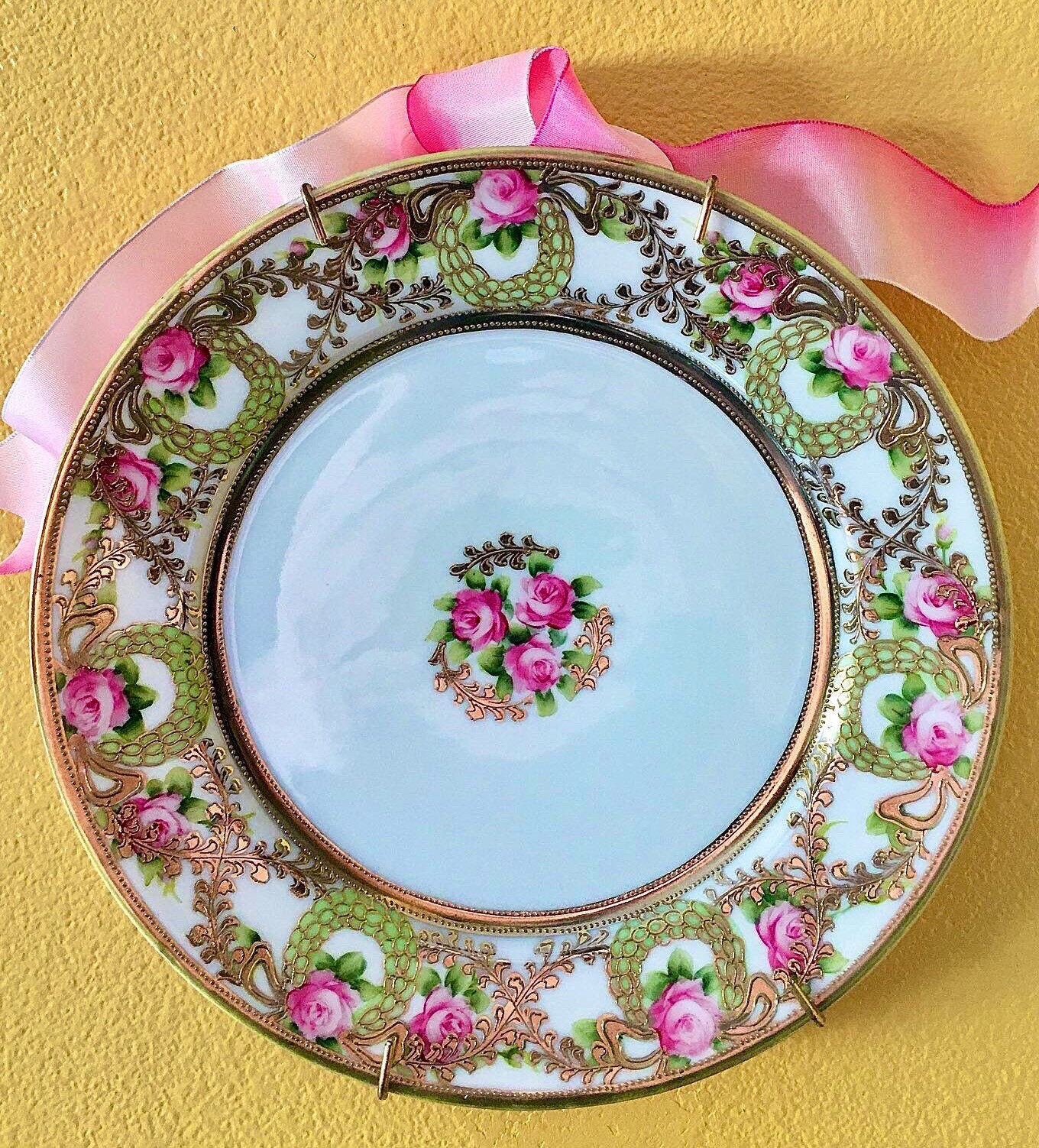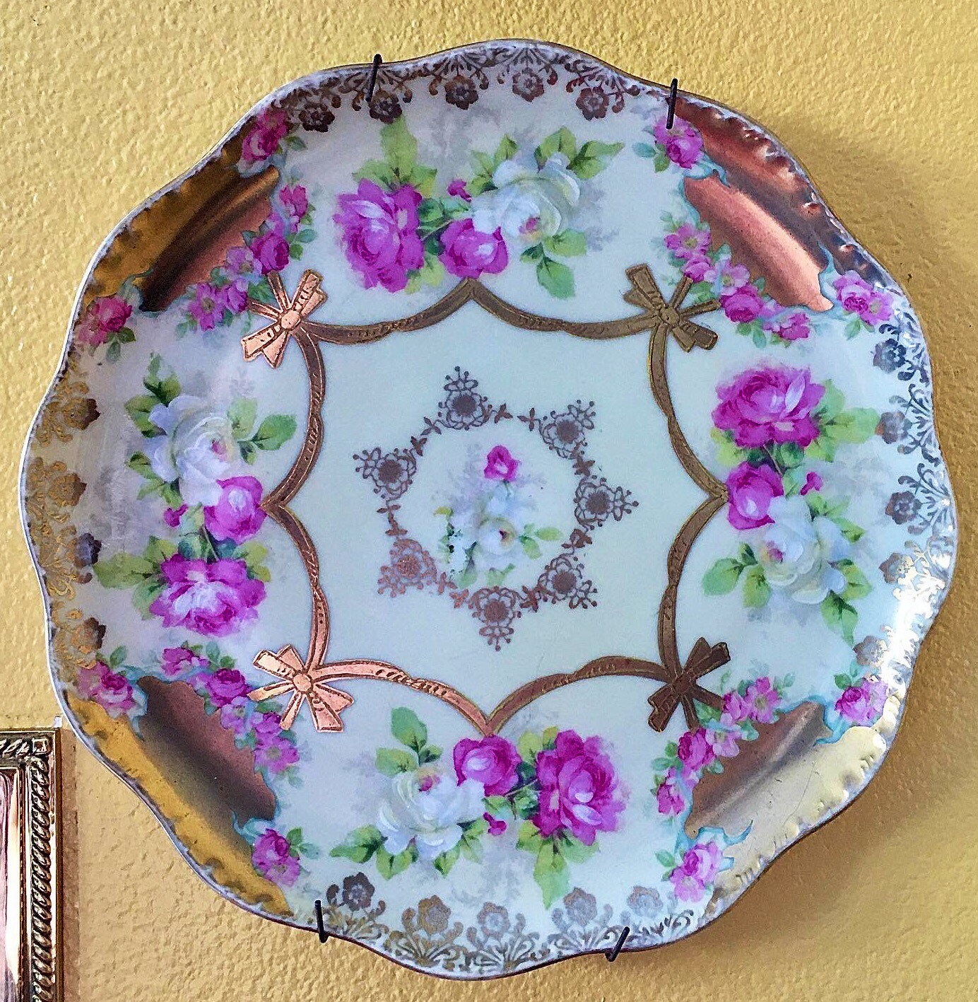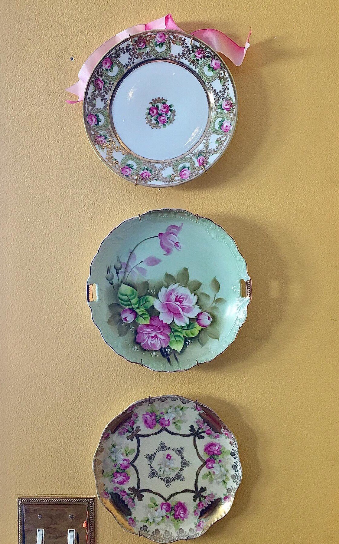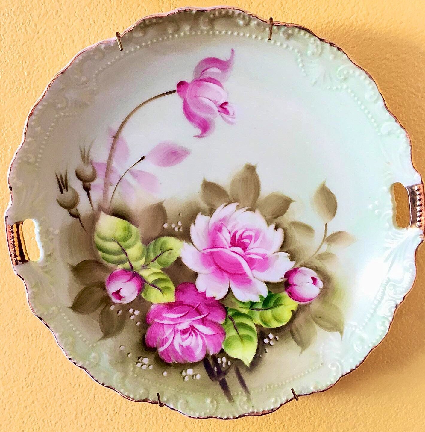 Pink and green forever! In a trio of vintage hand painted and 22k gold detailed plate’s. By Lefton, Nippon, & Wheelock. So cottage core chic Perfection together for plate wall style, or gorgeous alone. Plate hanger included.