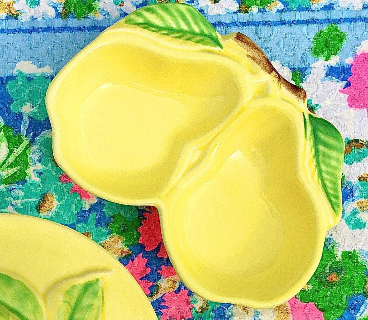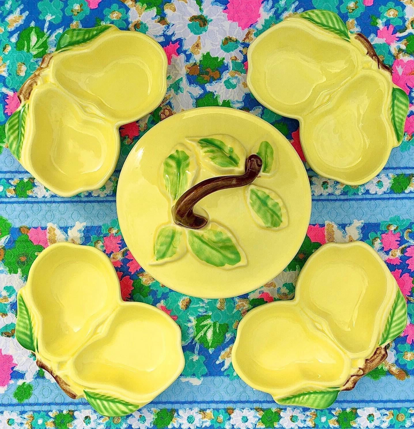 Fabulous Slim Aarons style…A bright sunshine lemon with green leaves, and a brown twig lidded bowl. This pristine vintage chip and dip is carrying summer vibes beautifully. Belmar of California, is perfect mcm pottery for any soirée. In the shape of pears she brings nothing but happy vibes.