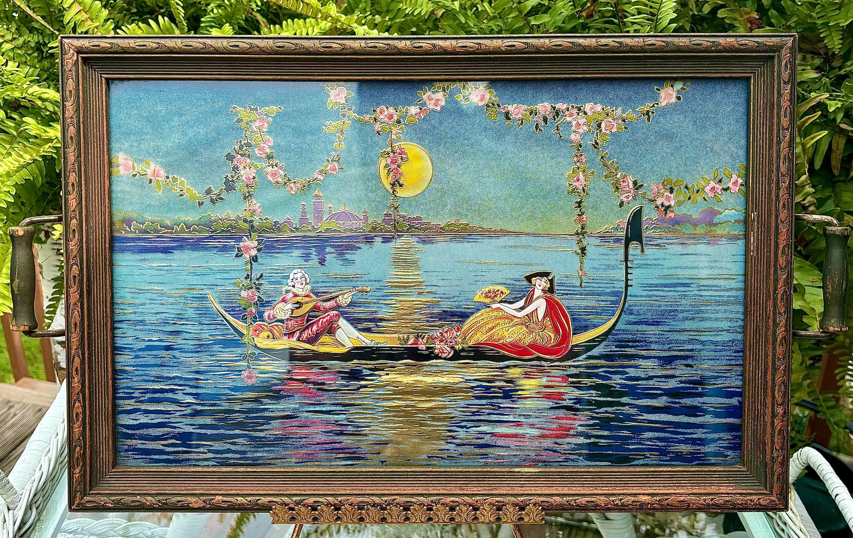 Exquisite Art Deco AntiqueTray. A romantic scenery of two lovers in a gondola. A lady fanning herself, whilst paramour plays the lute. Gorgeous under the moonlight and Cherry blossoms. This beautiful piece of vintage art, is under seeded glass, and framed in beautiful carved wood with handles. Exceptional for the vanity with perfume and baubles. Fabulous for vintage glassware and more.
