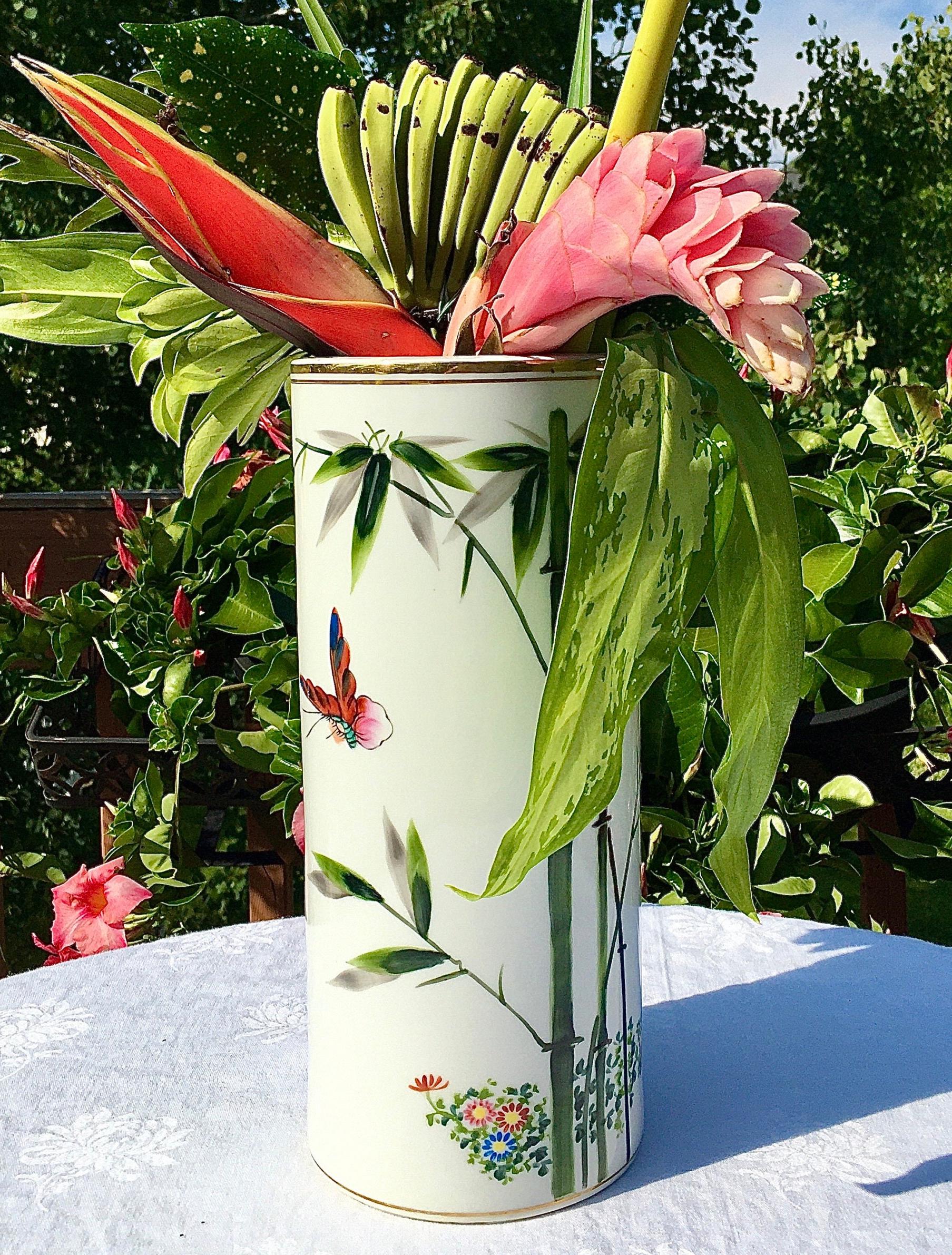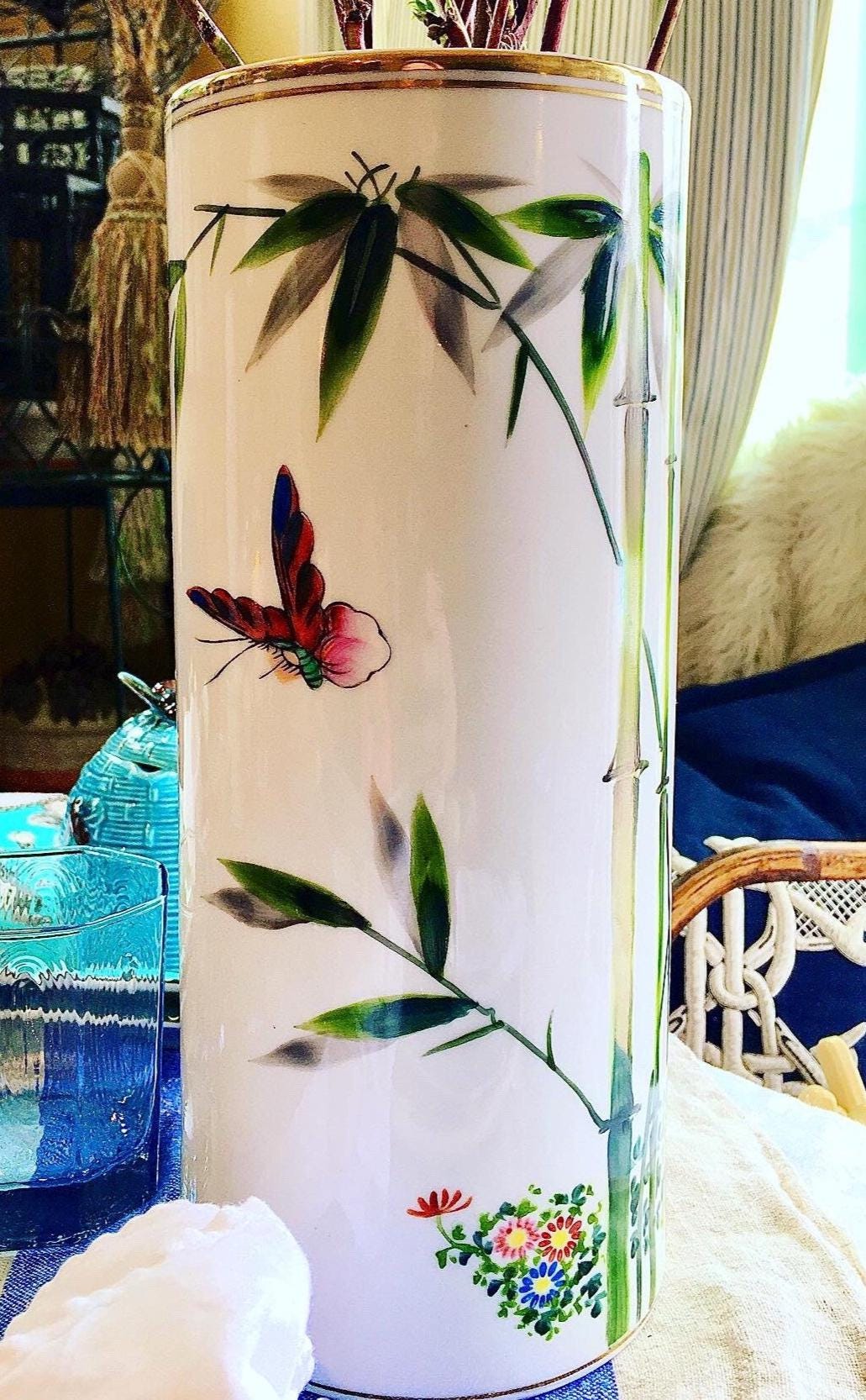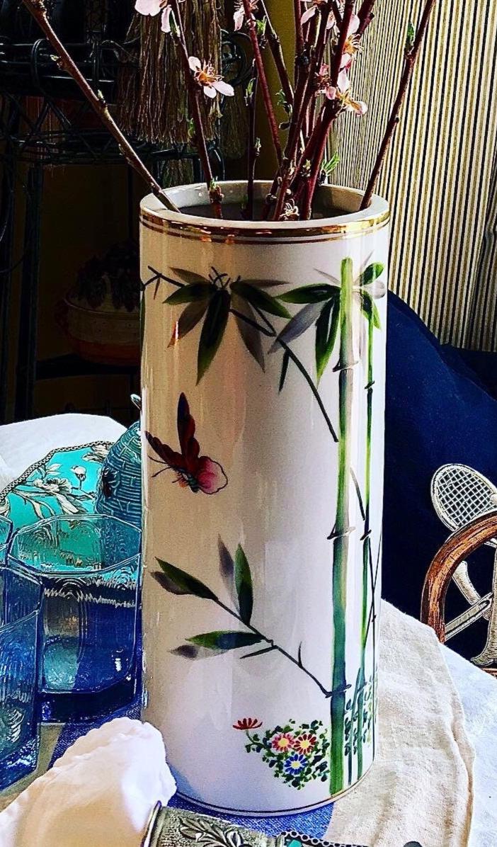 Exquisite porcelain vase of hand painted bamboo, butterfly, floral design, and 22k gold trimming’s. This pristine porcelain vase is a “tall drink of water” at 12”H.