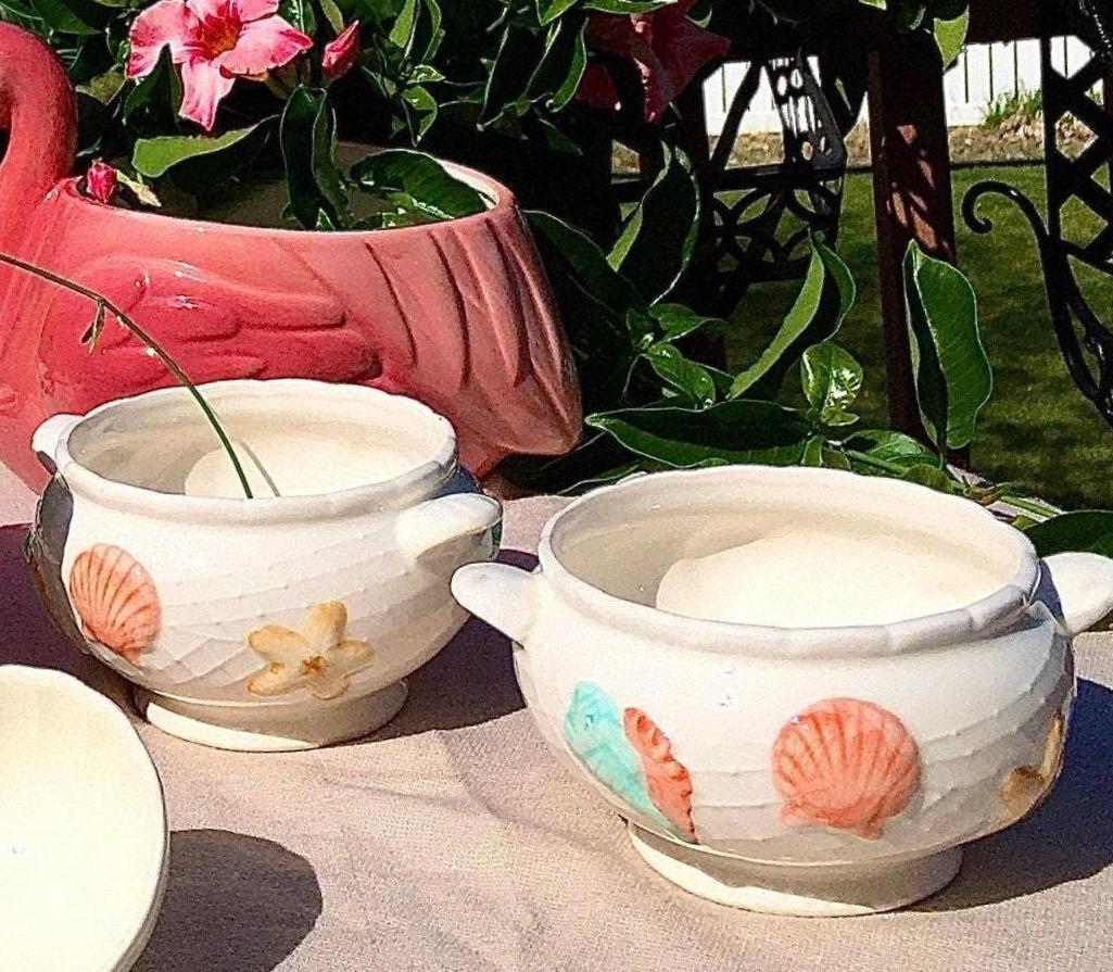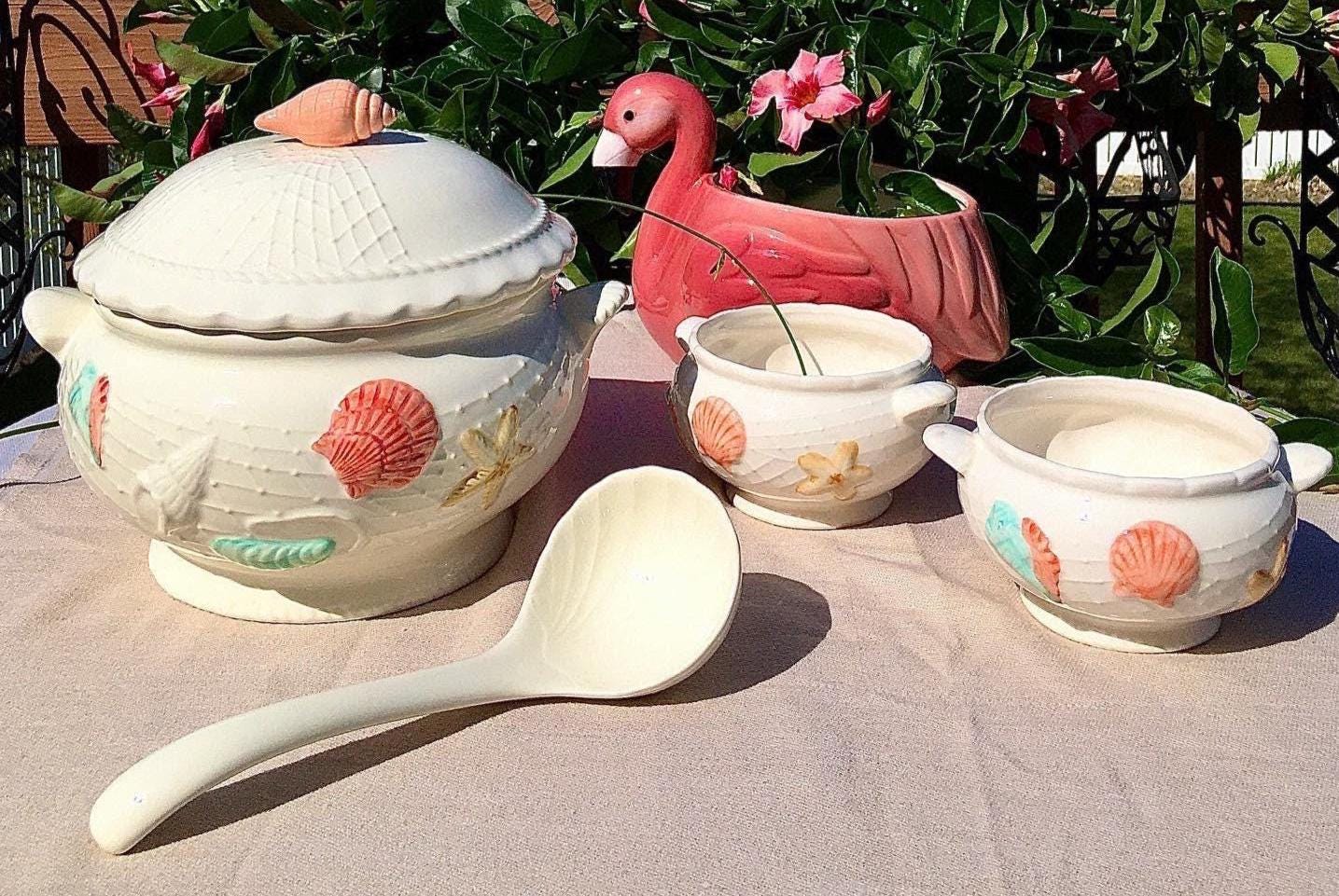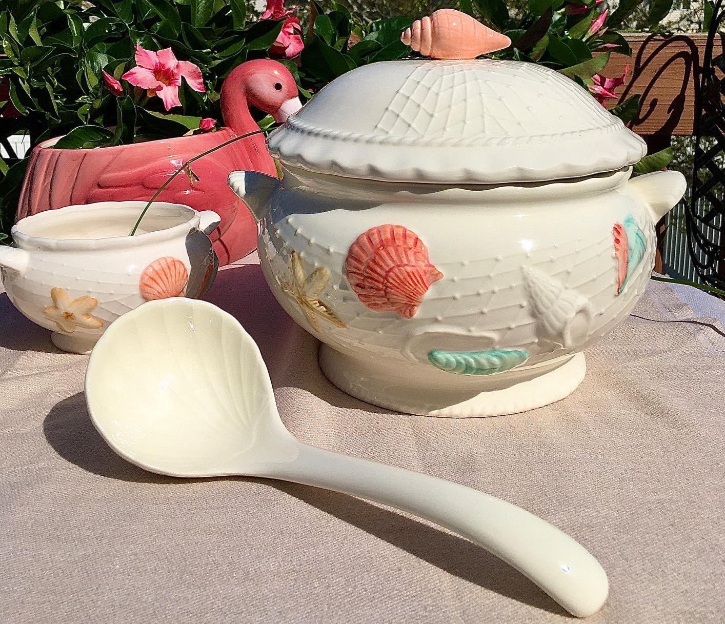 Seaside dream’s, in a vintage 5 piece tureen set. Beautifully embossed with sea life. In color's of corals, turquoise, and sand. Backdrop is a serene creamware with embossed fishing nets throughout.