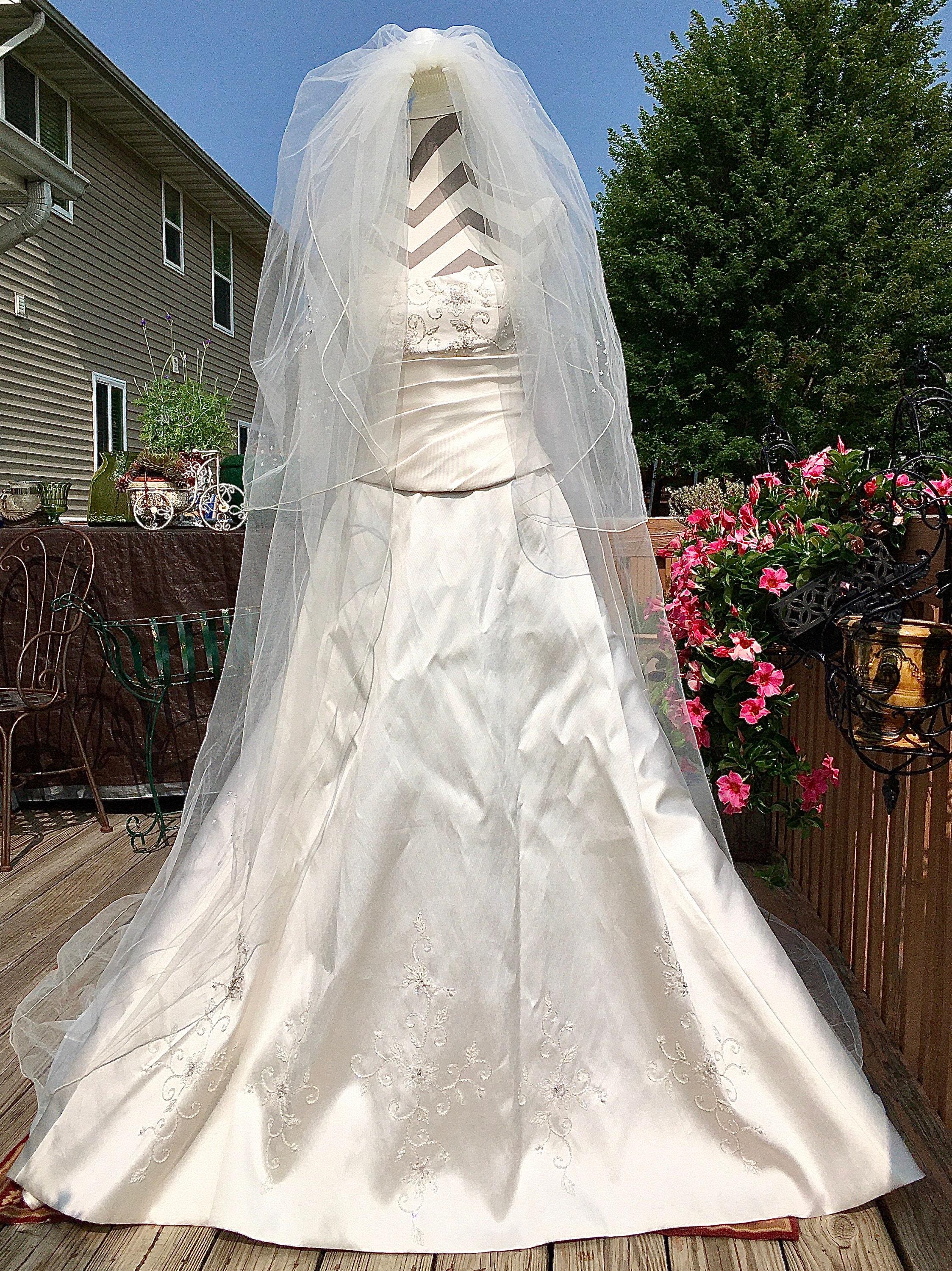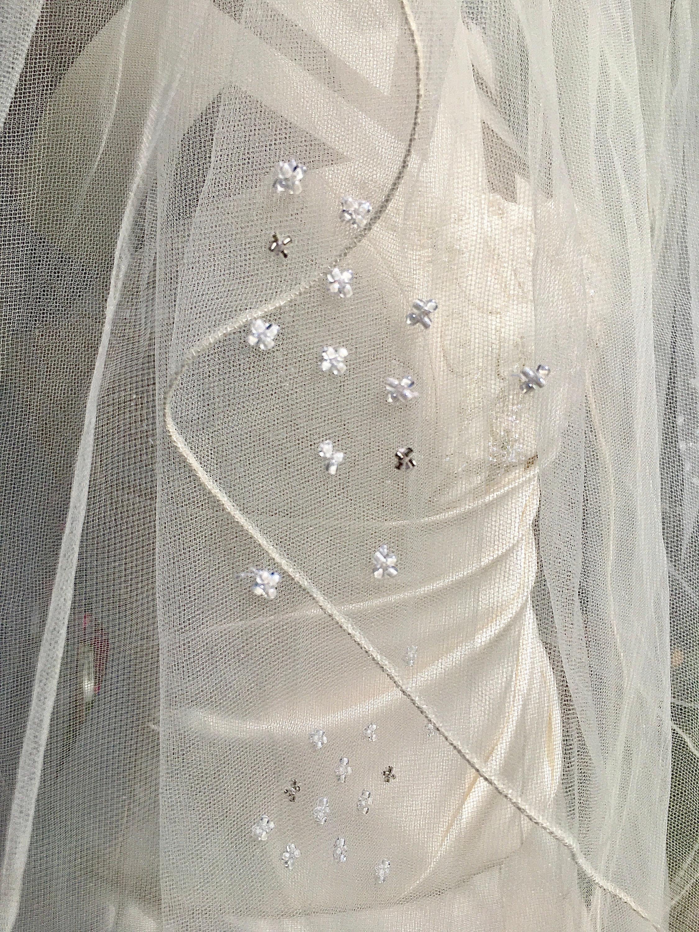 of Swarovski crystal and beads, are highlighted throughout the gown and veil.