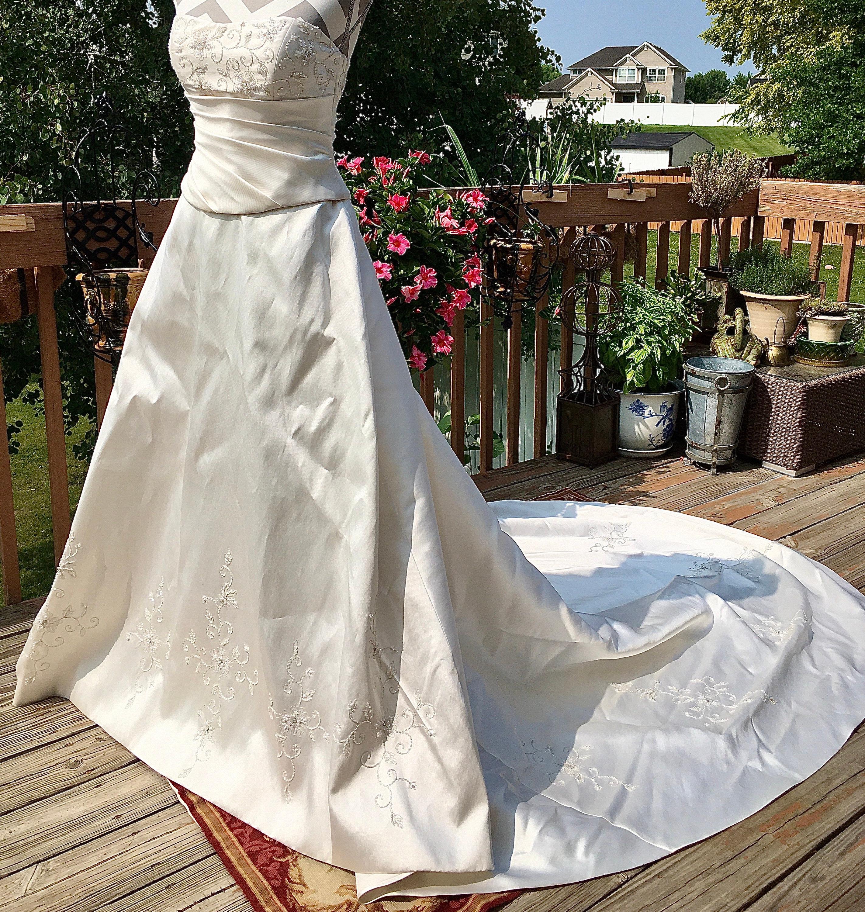 A spectacular English bustle, also known as an American bustle, the tiny button’s & hook’s, which starts from the back, to the middle of the 84” bridal train.