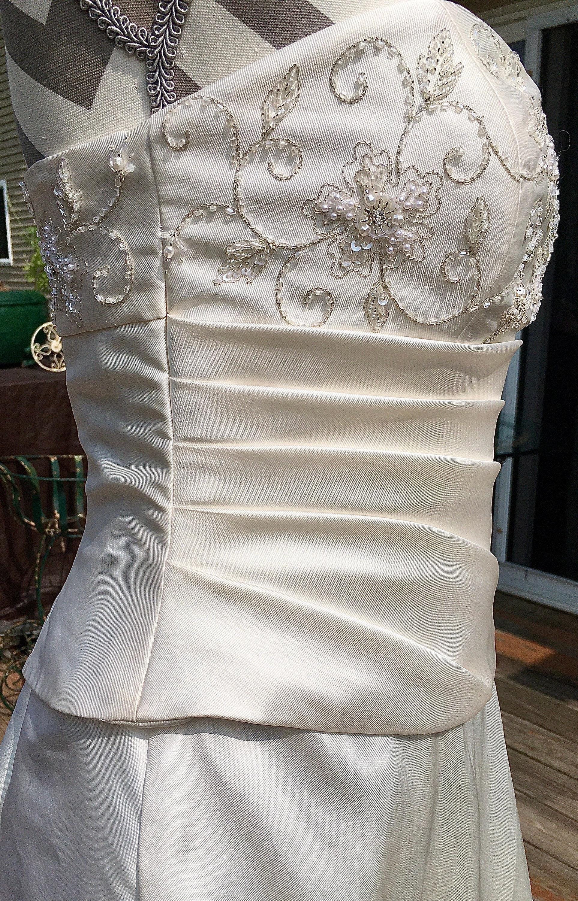 A ruched tuxedo bodice, with a strapless sweetheart neckline