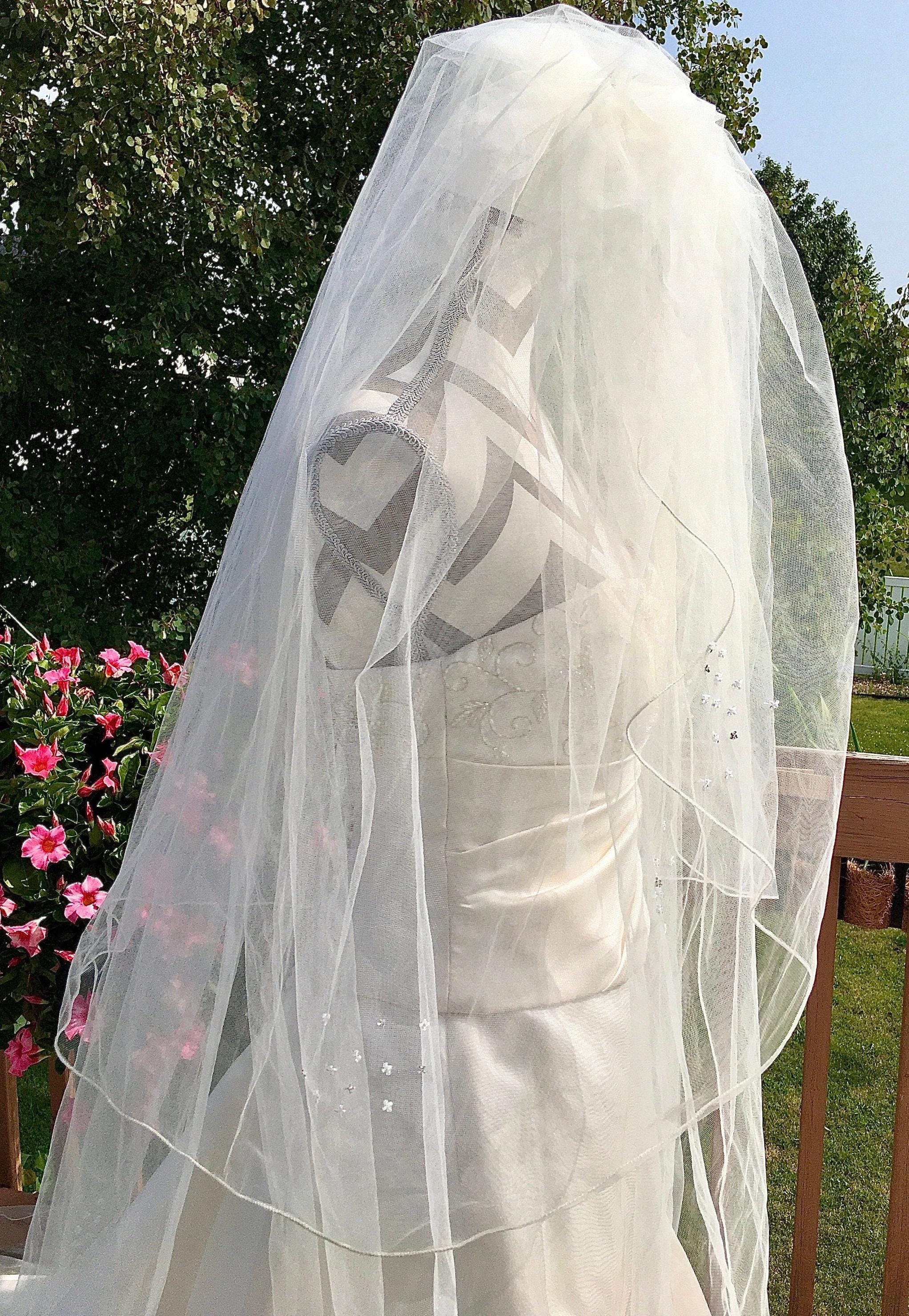 is a hair comb fastener, with detachable tulle train are rolled edges. Matching floral crystals & beading.