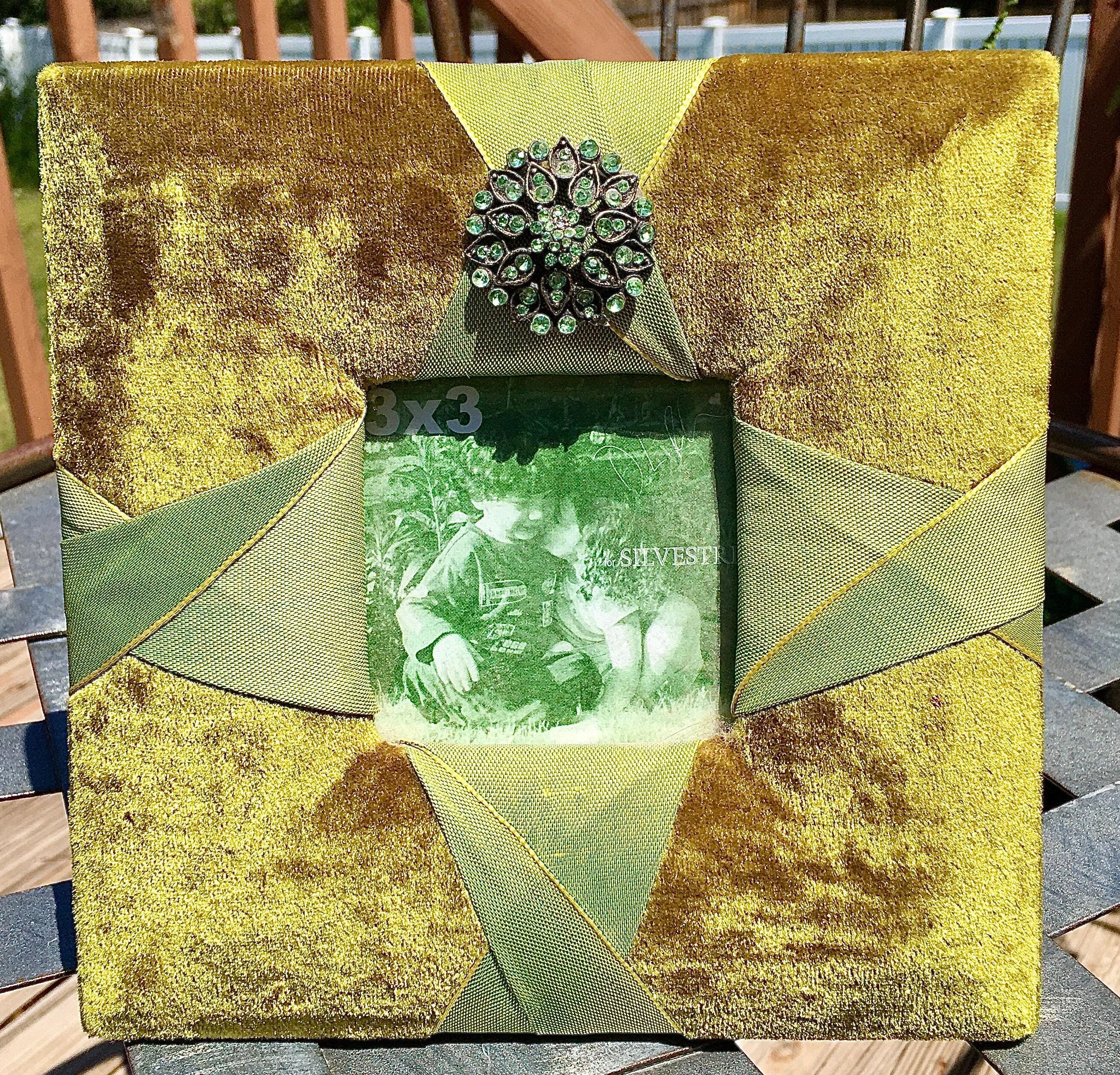 velvet, French ribbon details, and topped with a vintage brooch of peridot crystals. Has an additional hook for wall display, besides table.