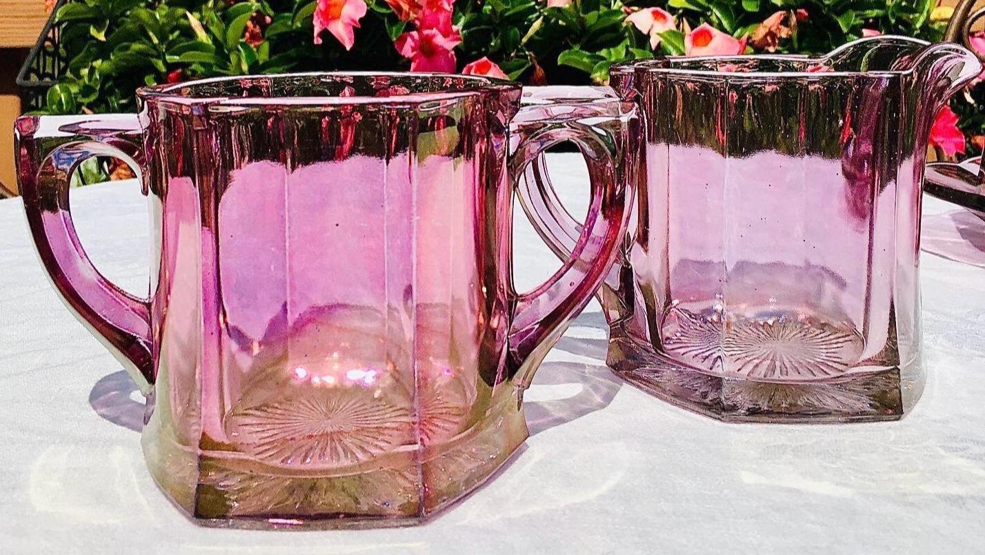 Delicious plum pink depression glass, by Bartlett and Collins. This set is gorgeous!