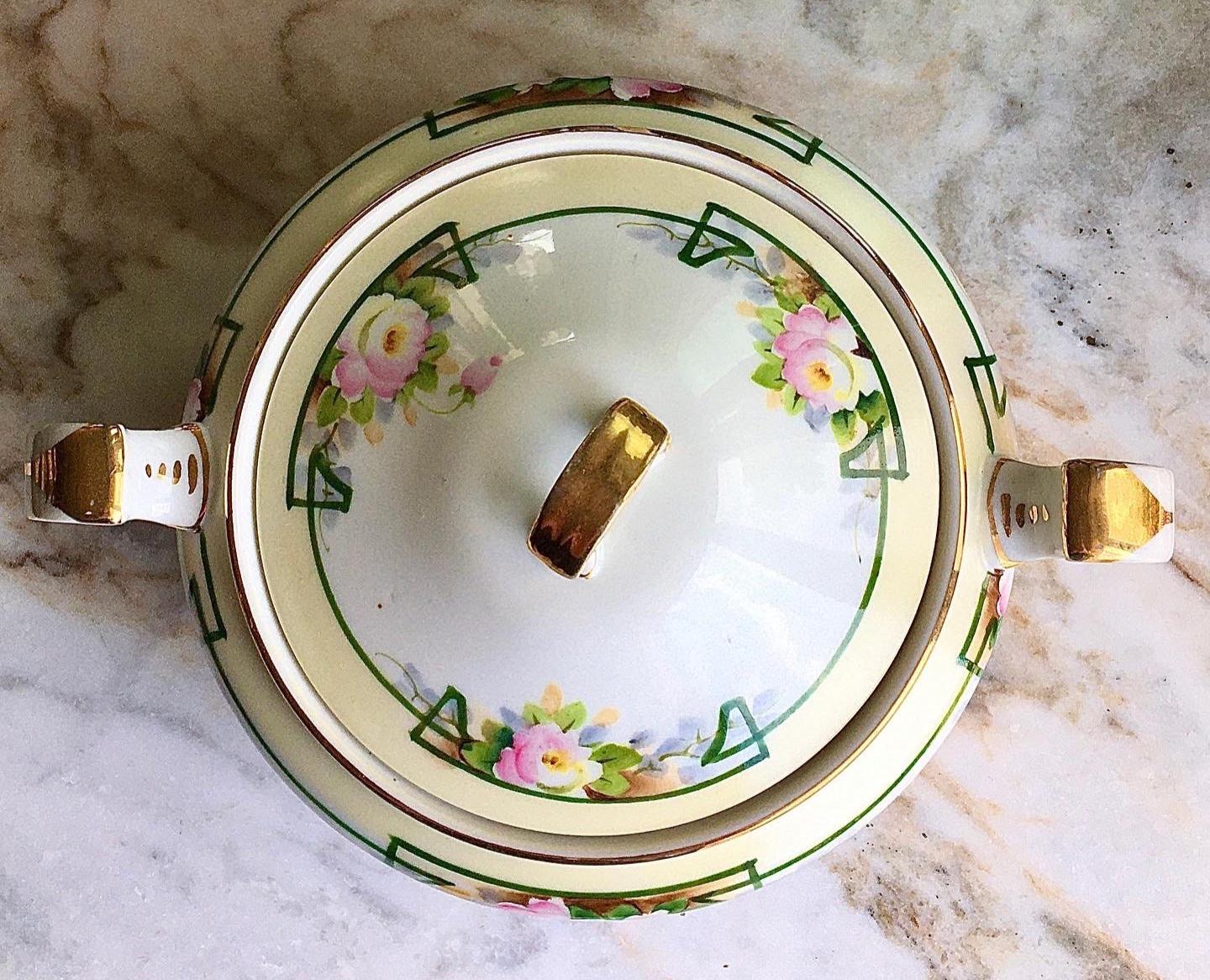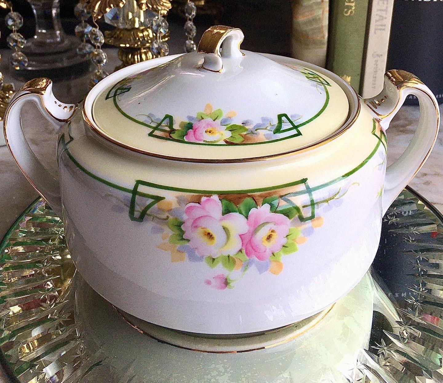 Exclusively at TruffleandFig, handpainted Nippon, lidded, vintage biscuit jar. Beautiful pink and green floral, trellis design. Accents of 22k gold.