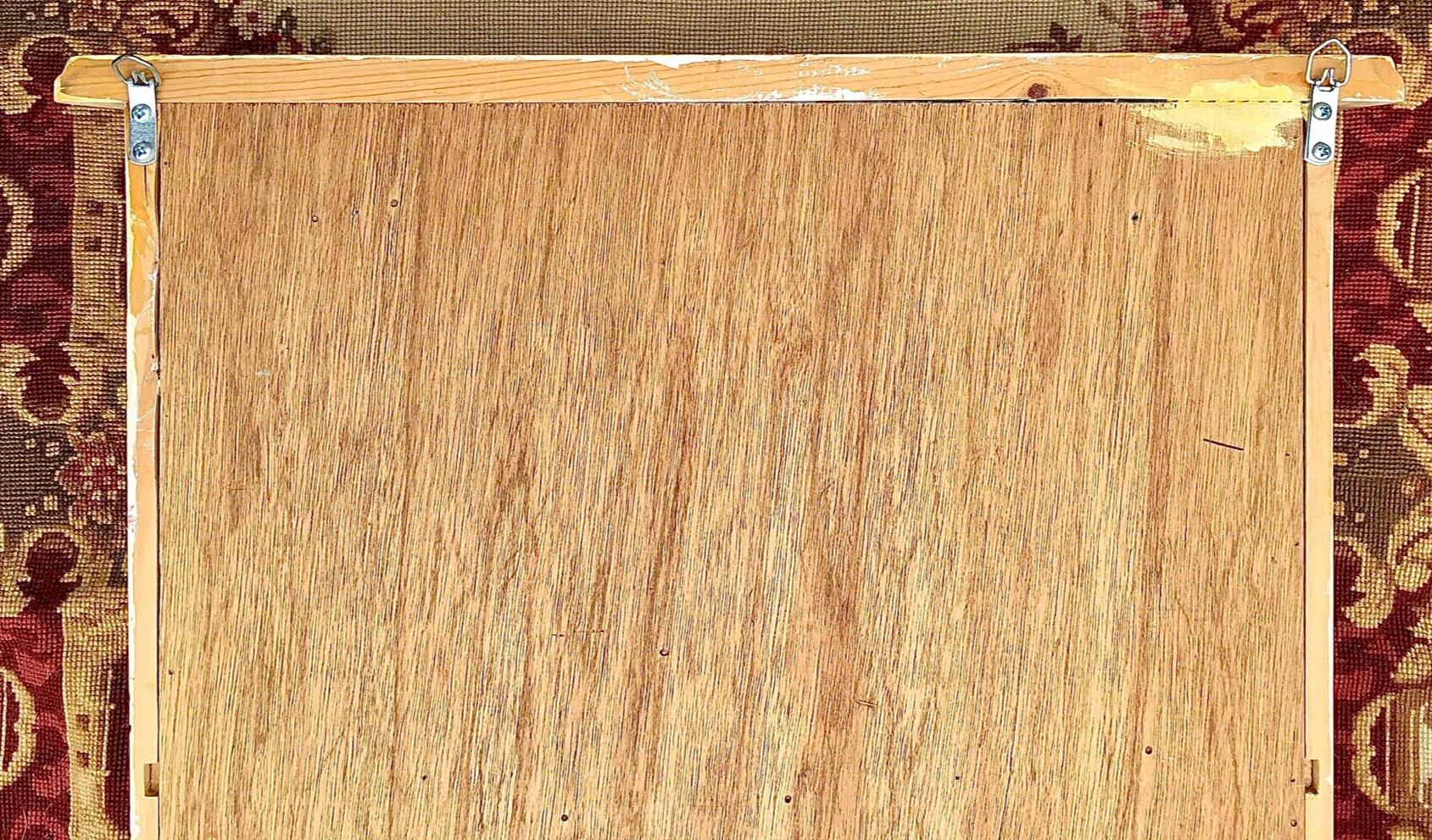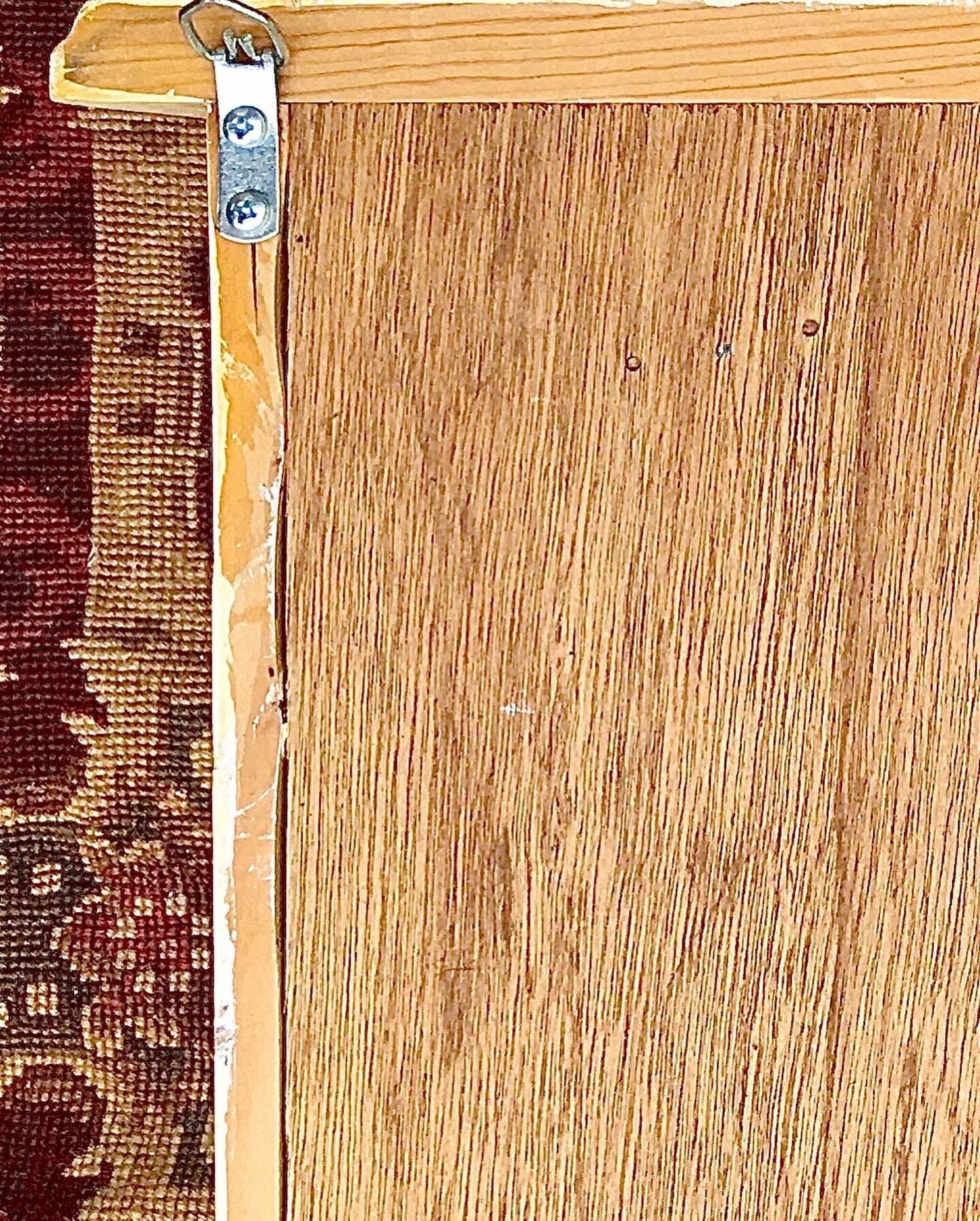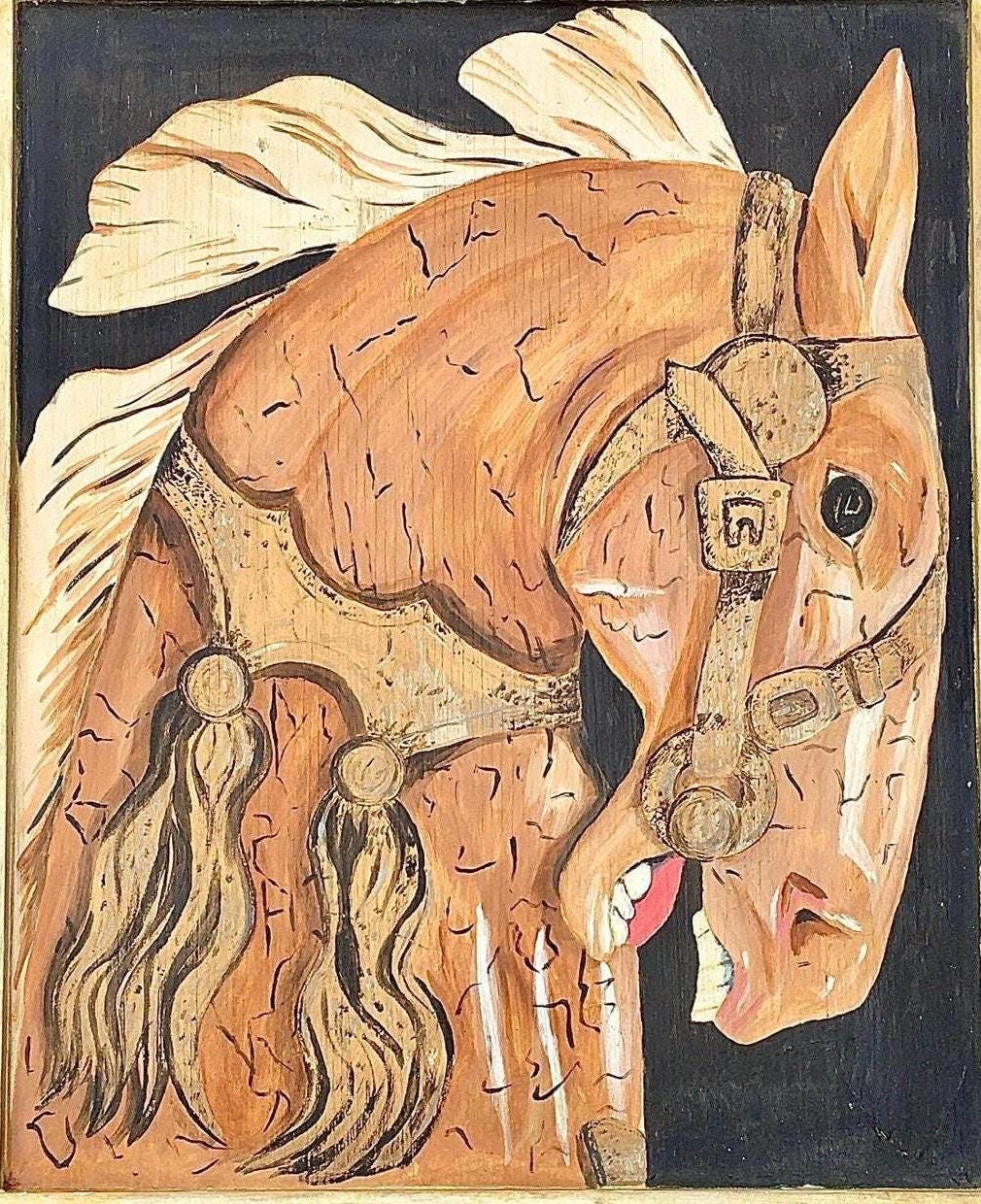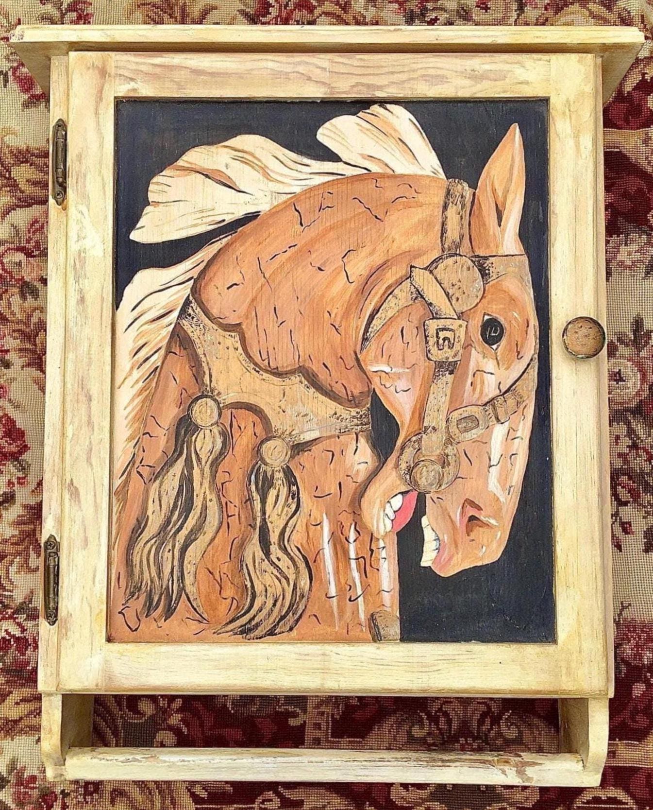 Against a striking black background, an exquisite horse dressed in formal horse tack, of tassels and horse bridle. Surrounded by a beautiful buttery blonde wood. Inside…shelf space, and bar. Two hook’s in back for hanging. In excellent condition. Perfect for the foyer with leashes, and other necessities.