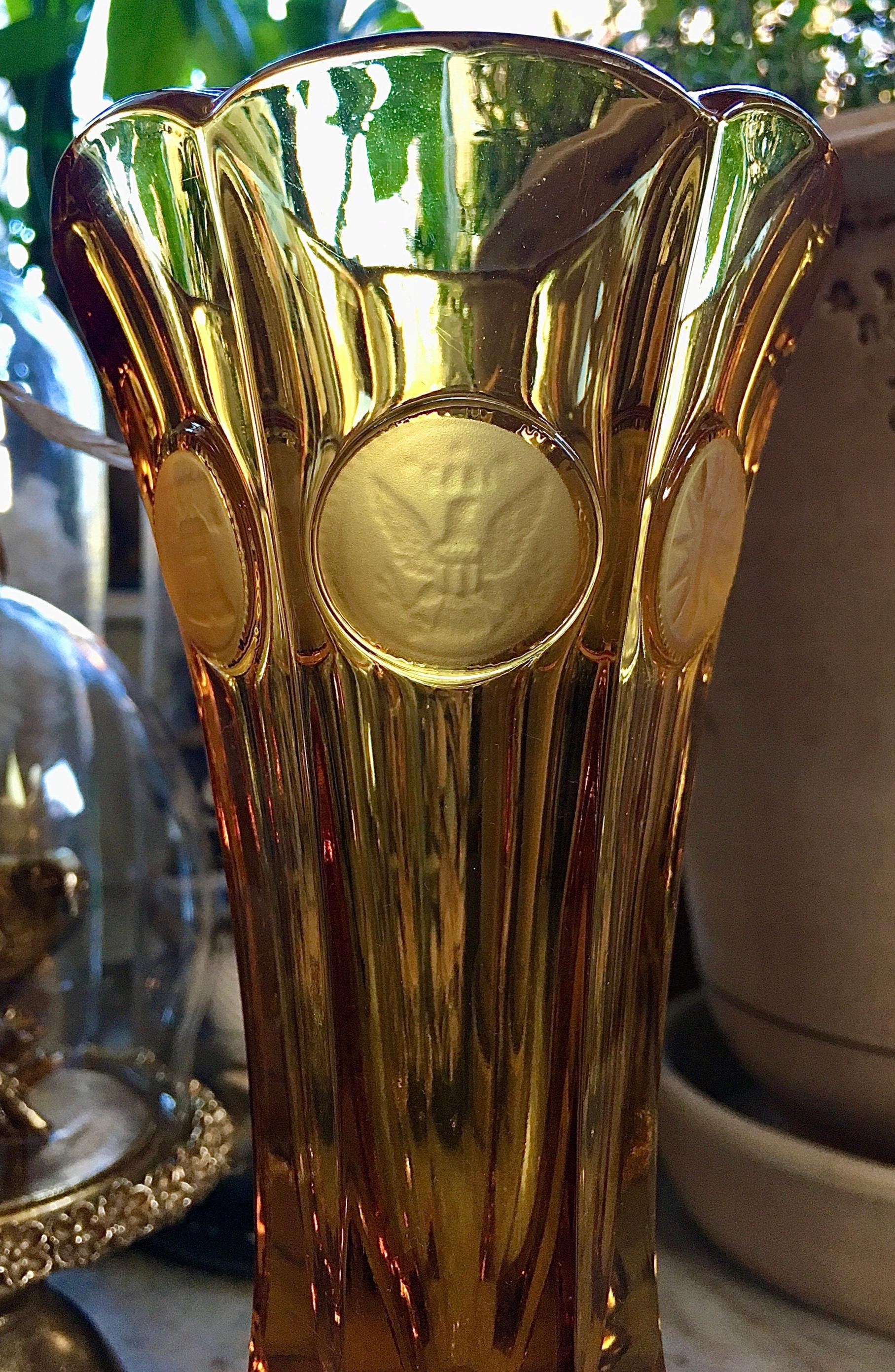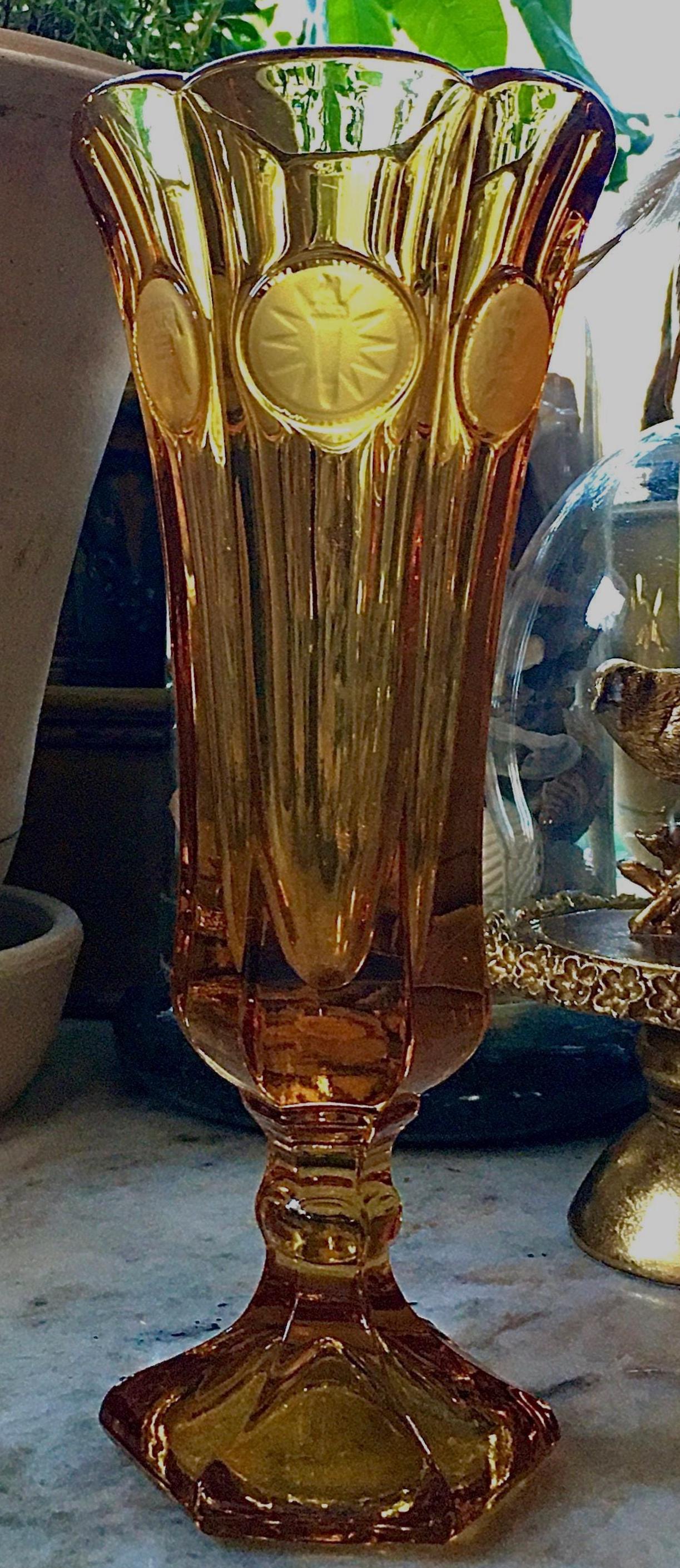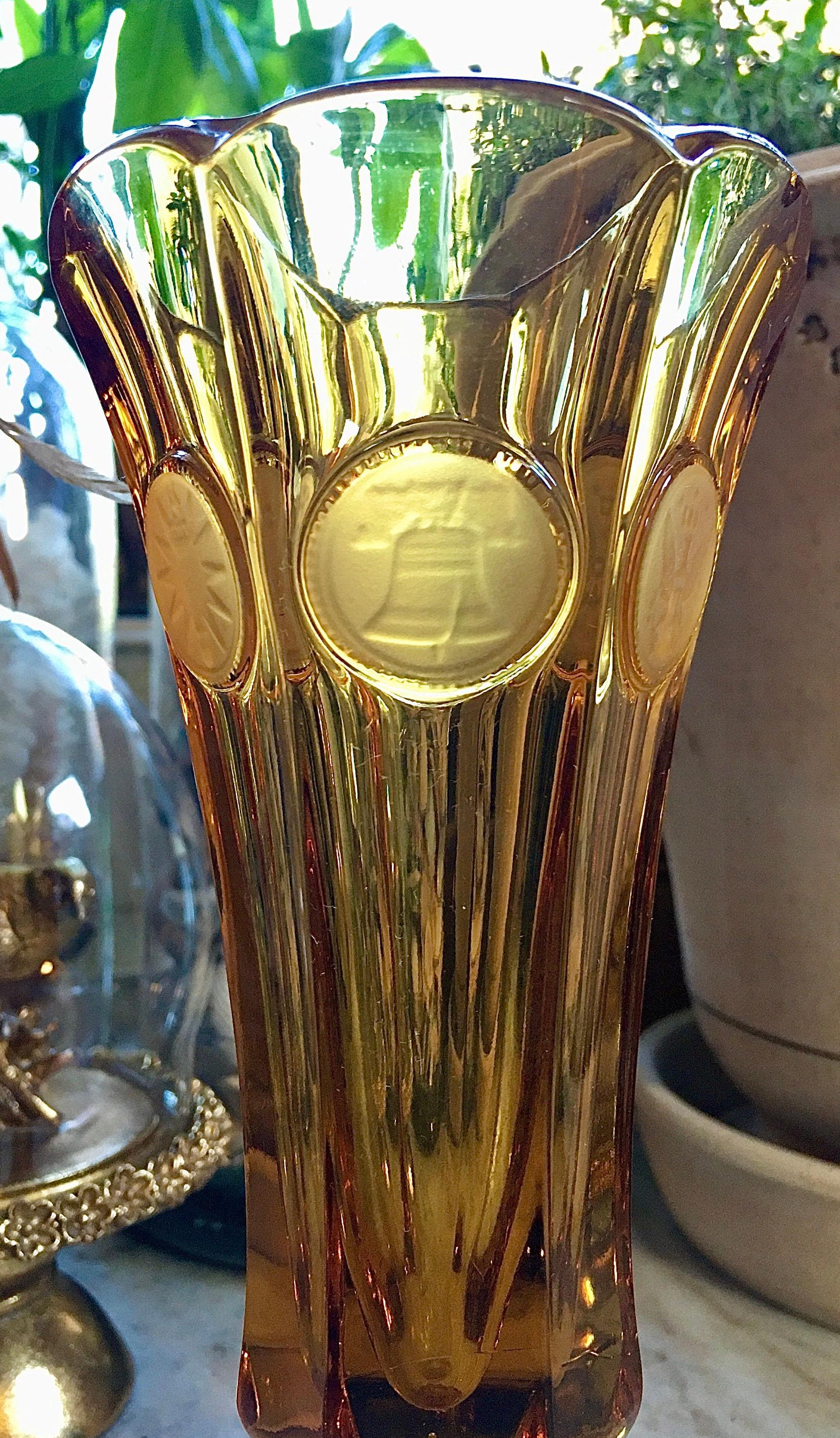 Bejeweled Amber Fostoria glass bud vase. In it’s Bicentennial Coin Collection. Beautiful trophy style vase, with linear fluting, and satin glass coin’s atop.