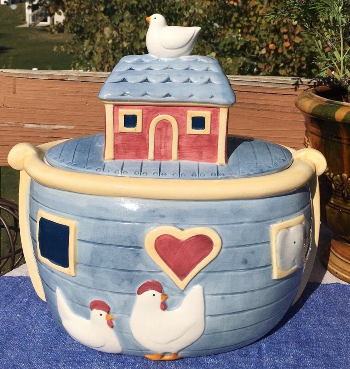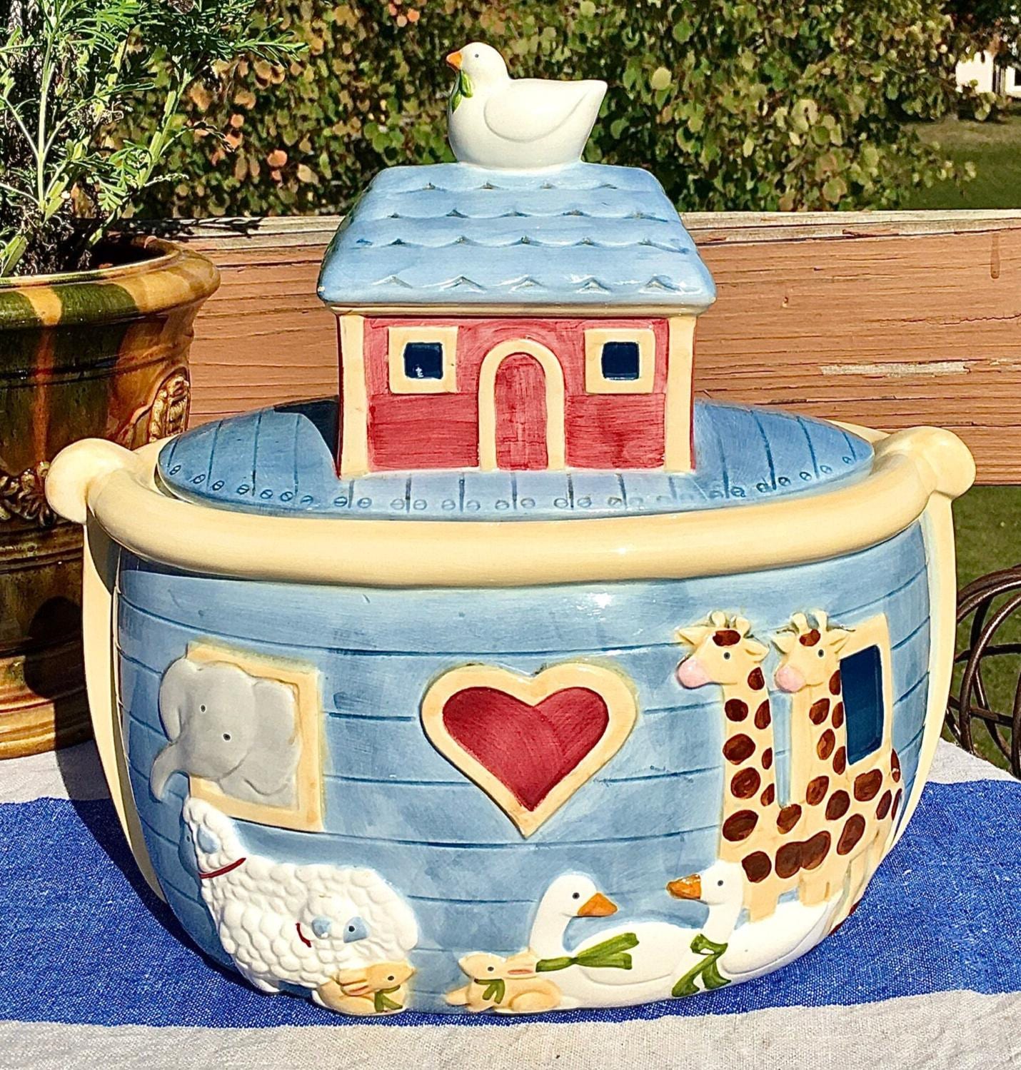 Full of whimsy and hopefully cookies! A nostalgic vintage cookie jar by Sue Winget. This pristine, Noah’s Arc cookie jar, has the charm