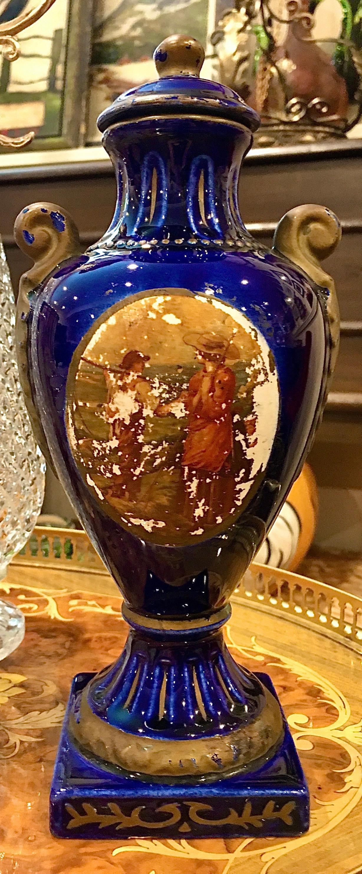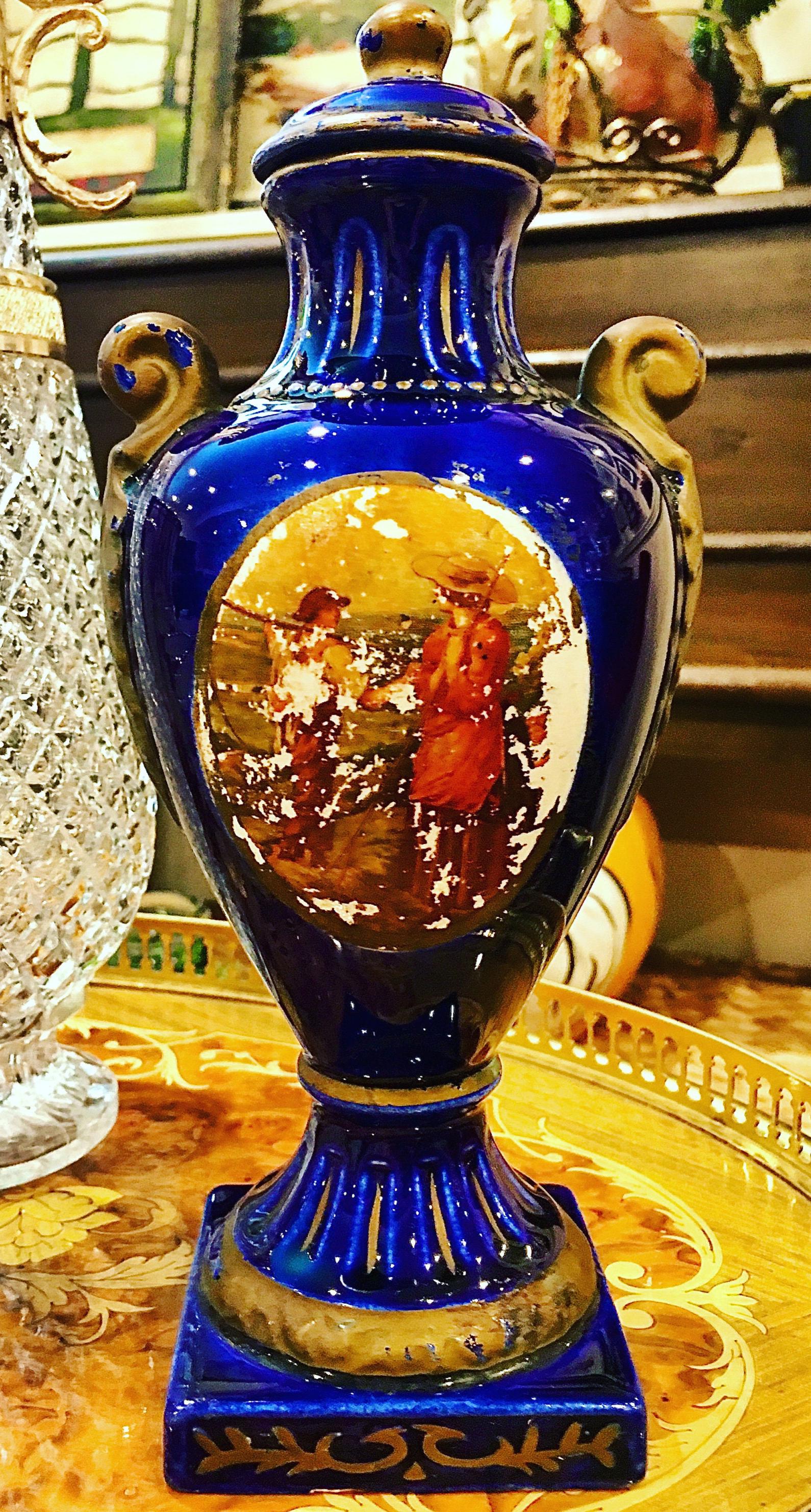 Rare and royal blue antique German decanter. Perfect patina with a depiction of a “seaman’s life”, left in the center. This antique decanter, or trophy urn, is a gorgeous cobalt blue. A stunning, rare and unique piece.