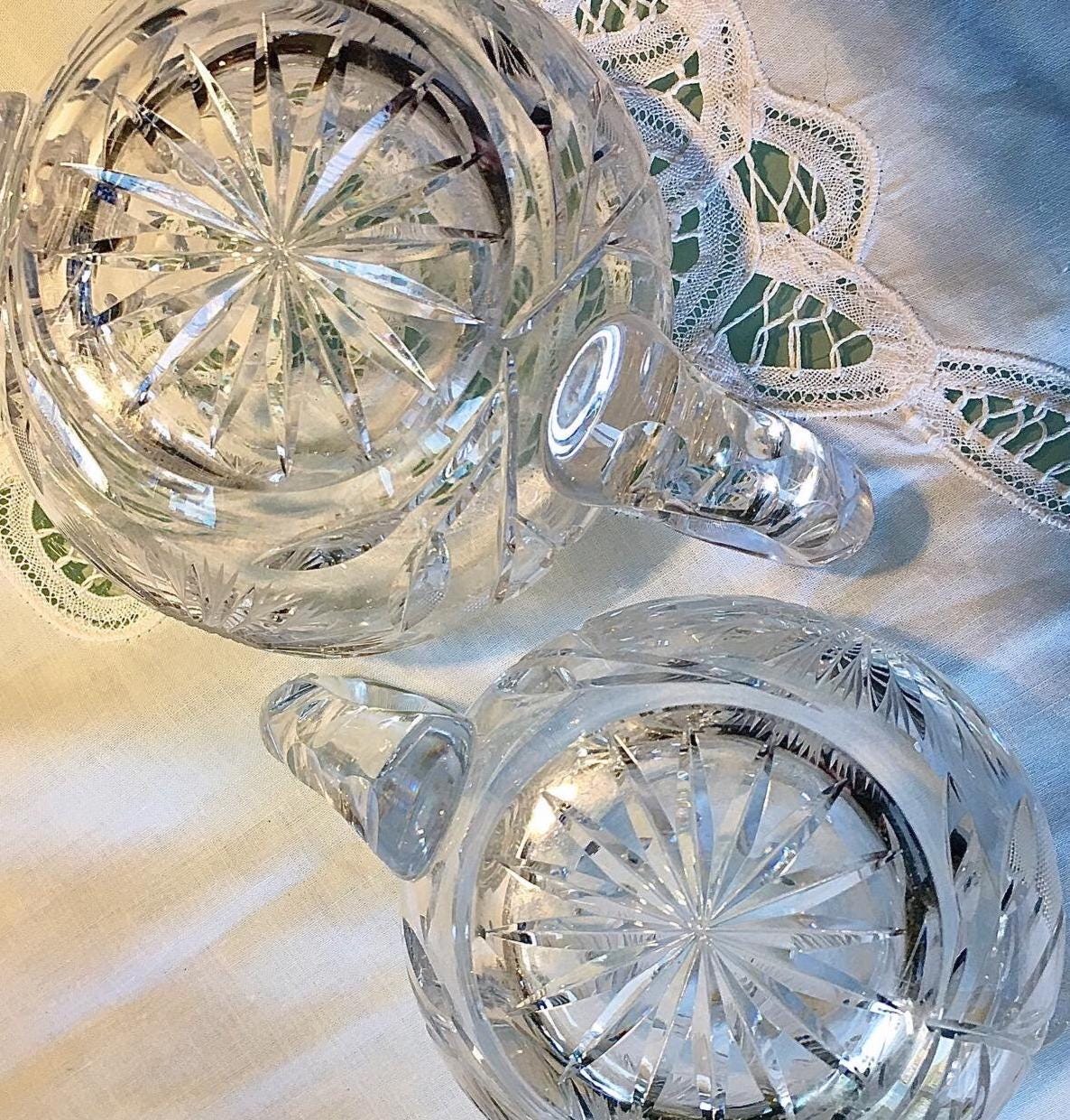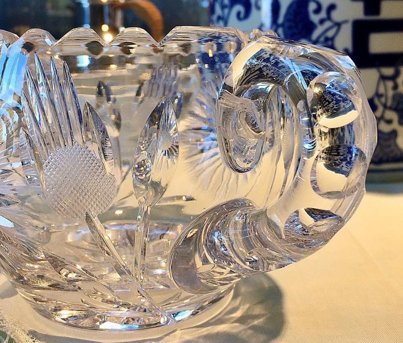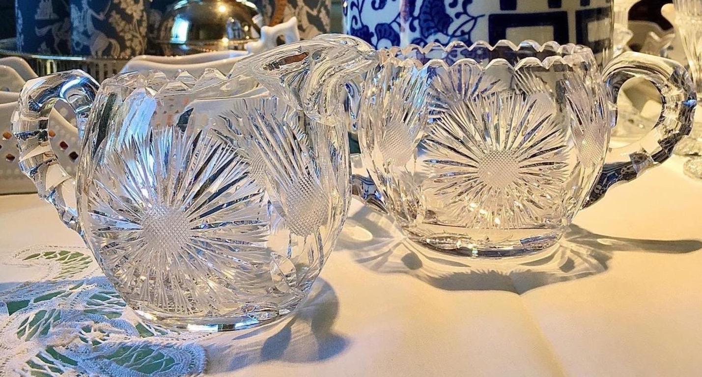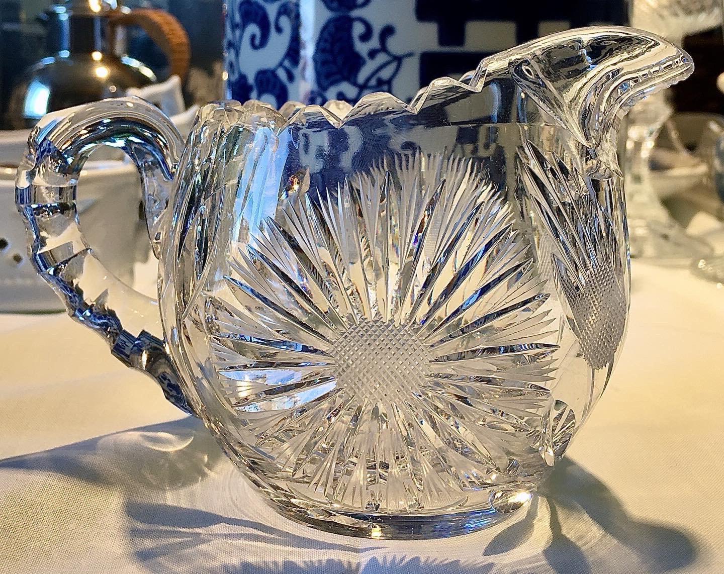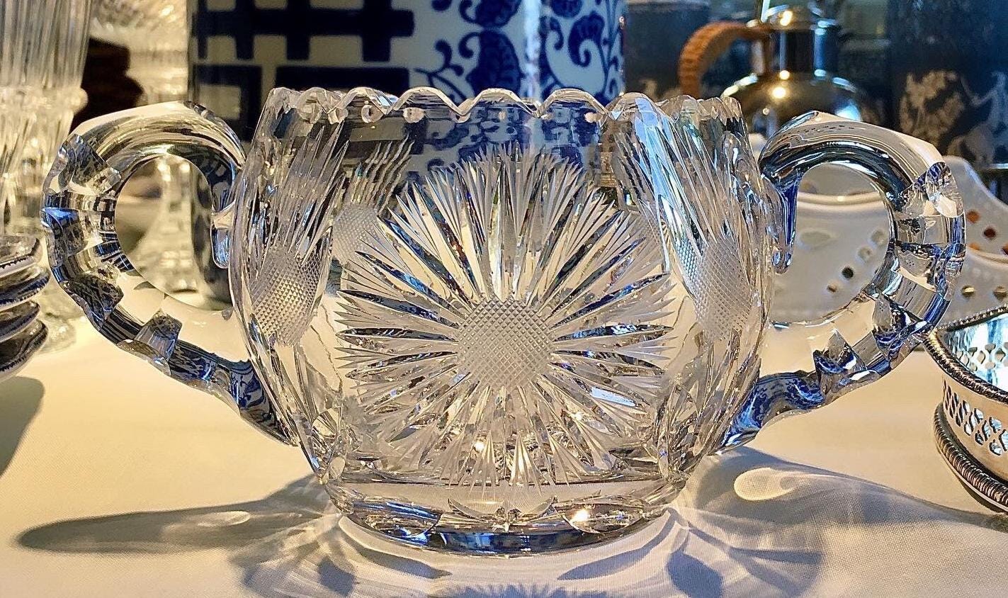 With exquisite dahlia and thistle design, sawtooth edges, faceted handle’s, and starburst base.
