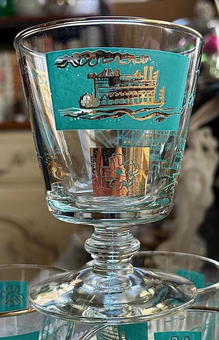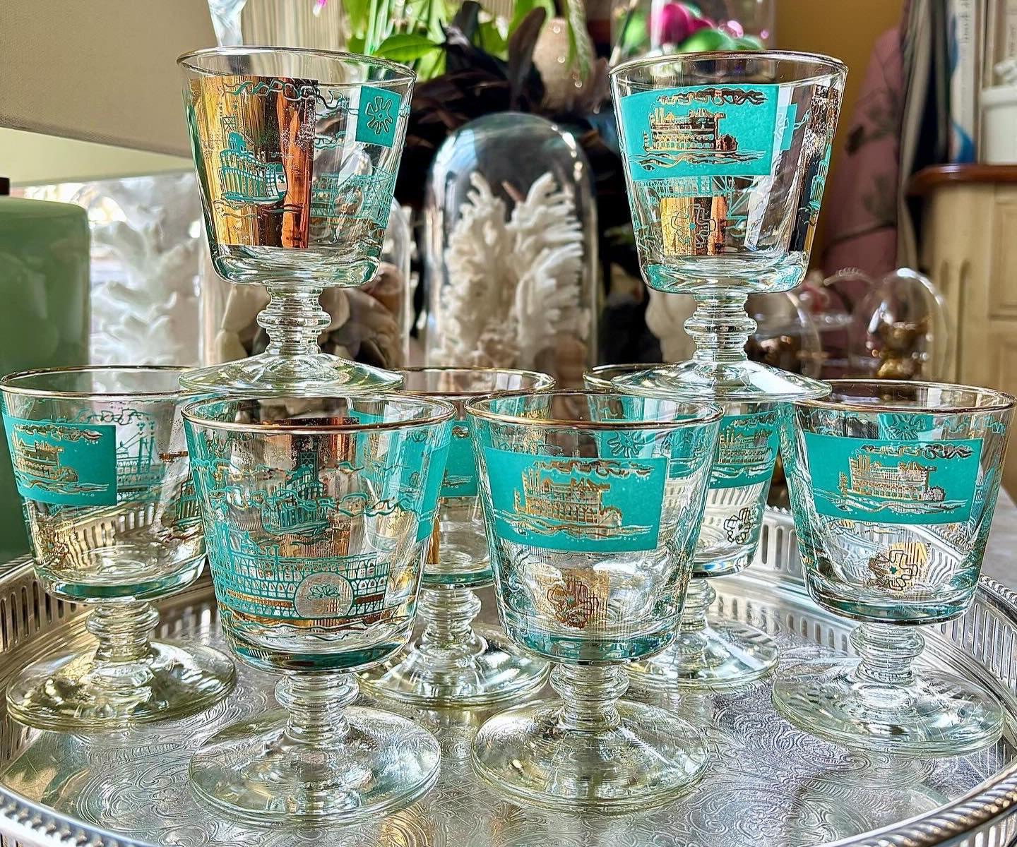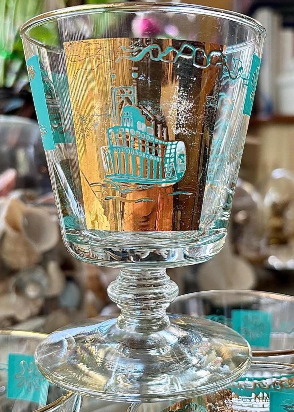 A robins egg blue, and 22K gold pattern, of various riverboats.