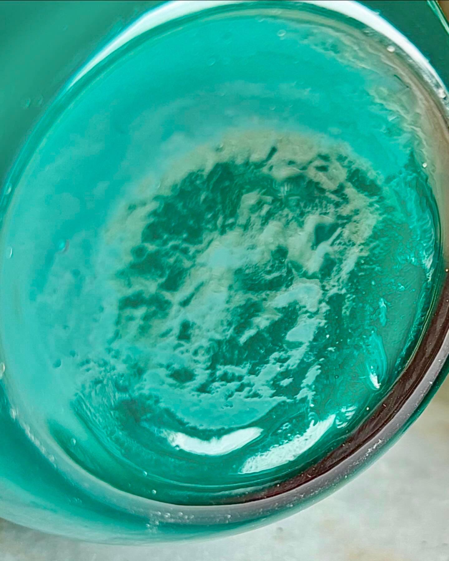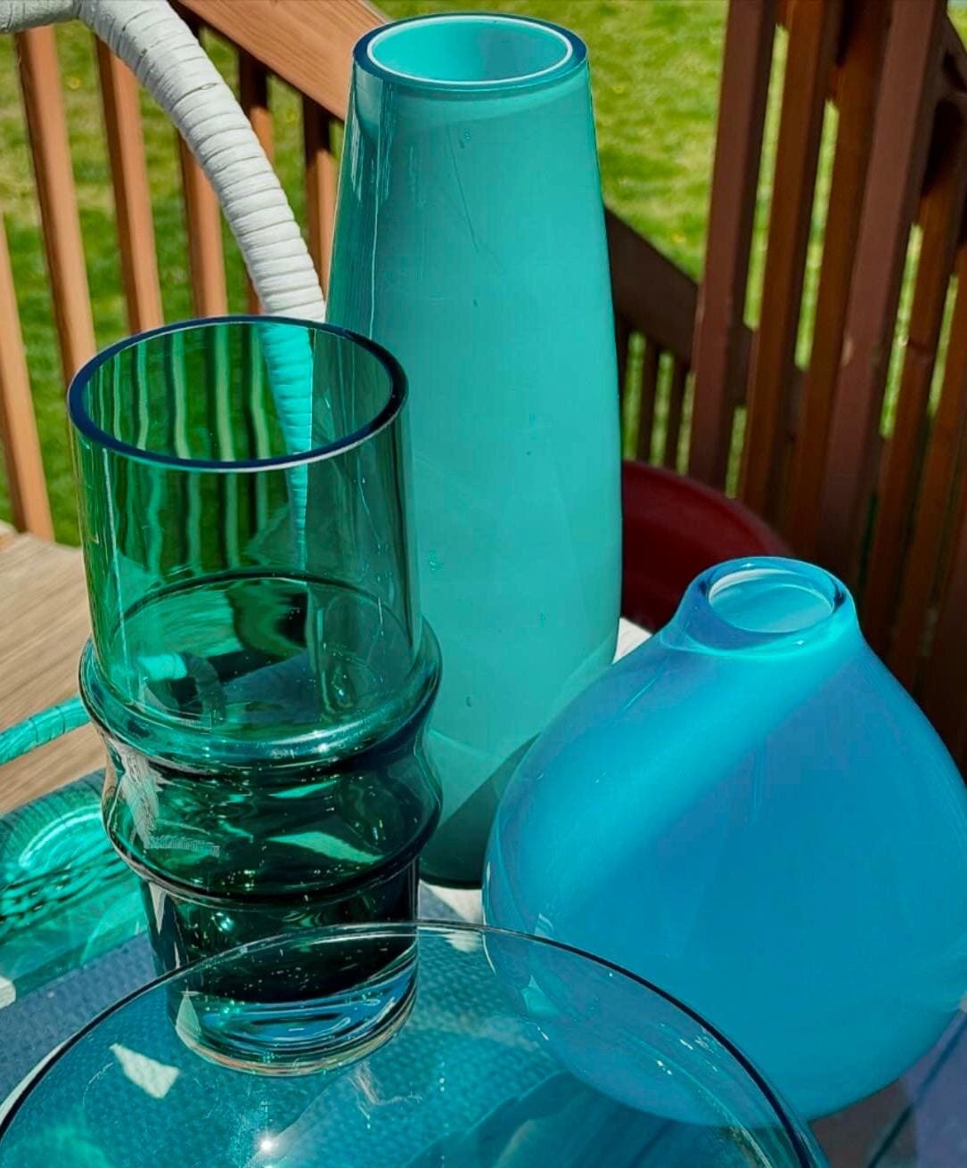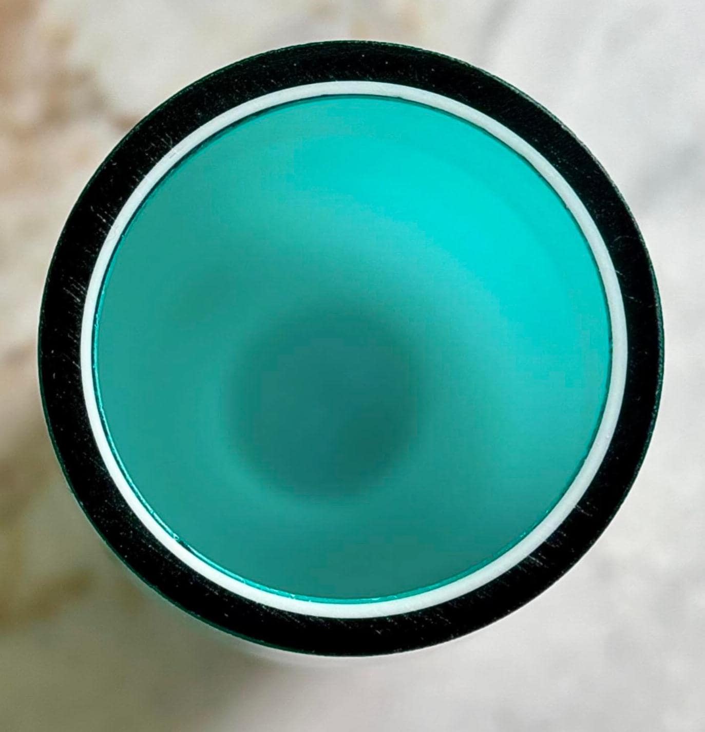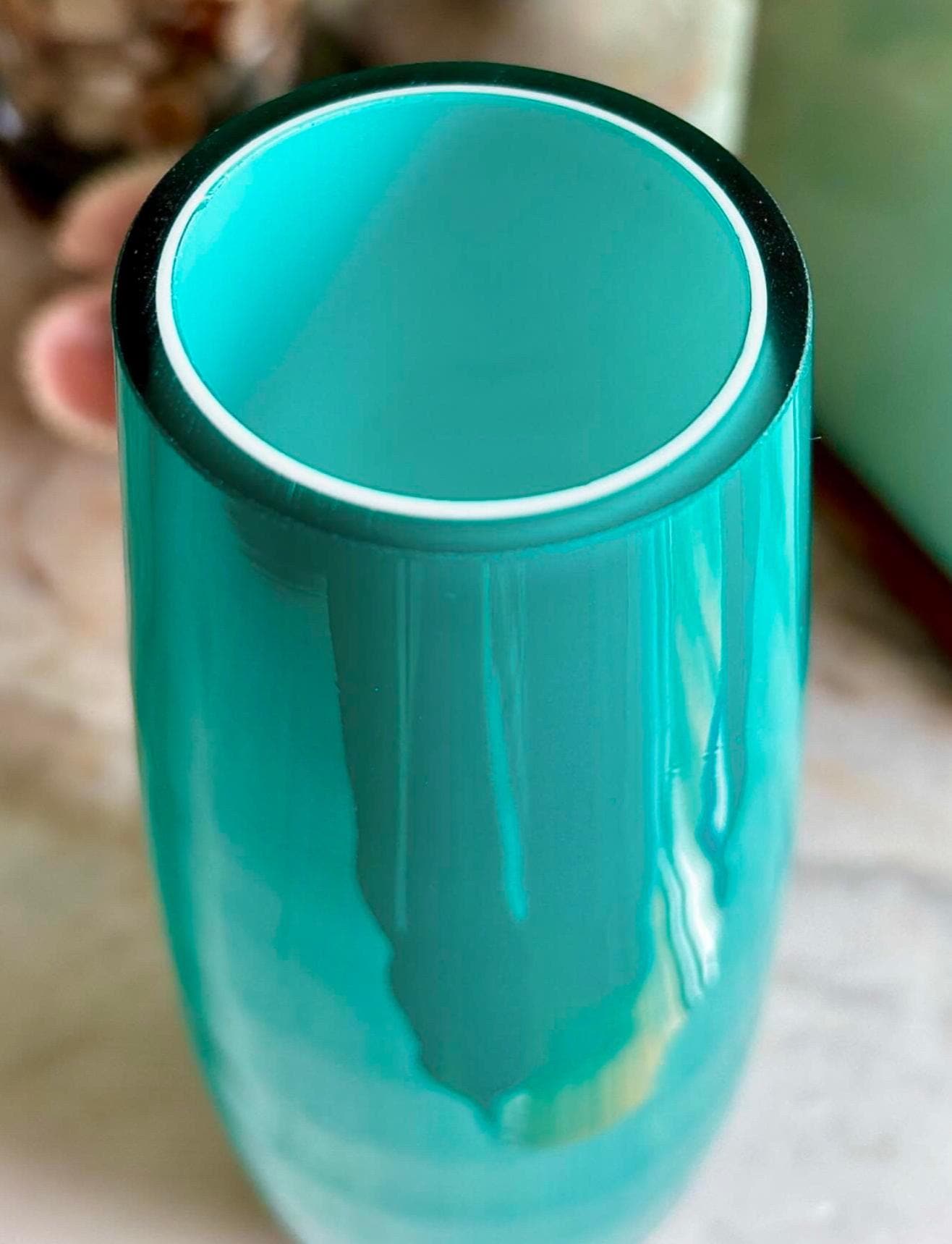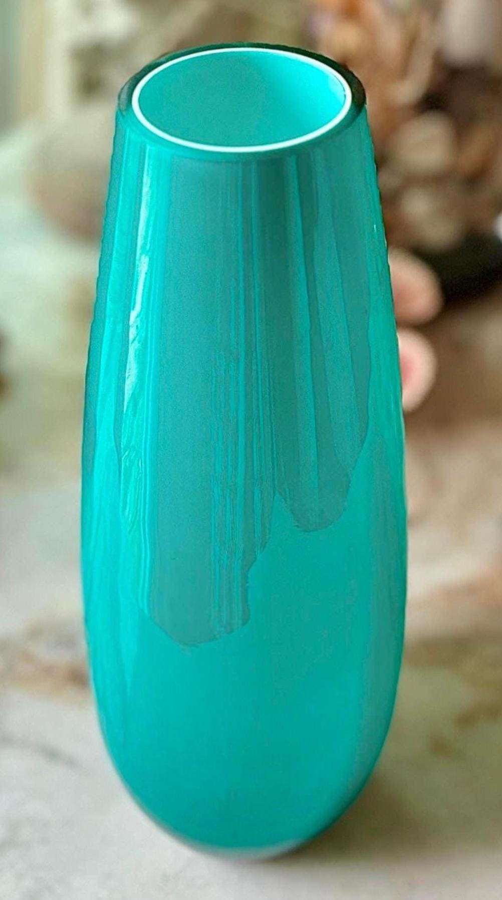 A surreal teal blue, with the notable crisp white cased glass interior.