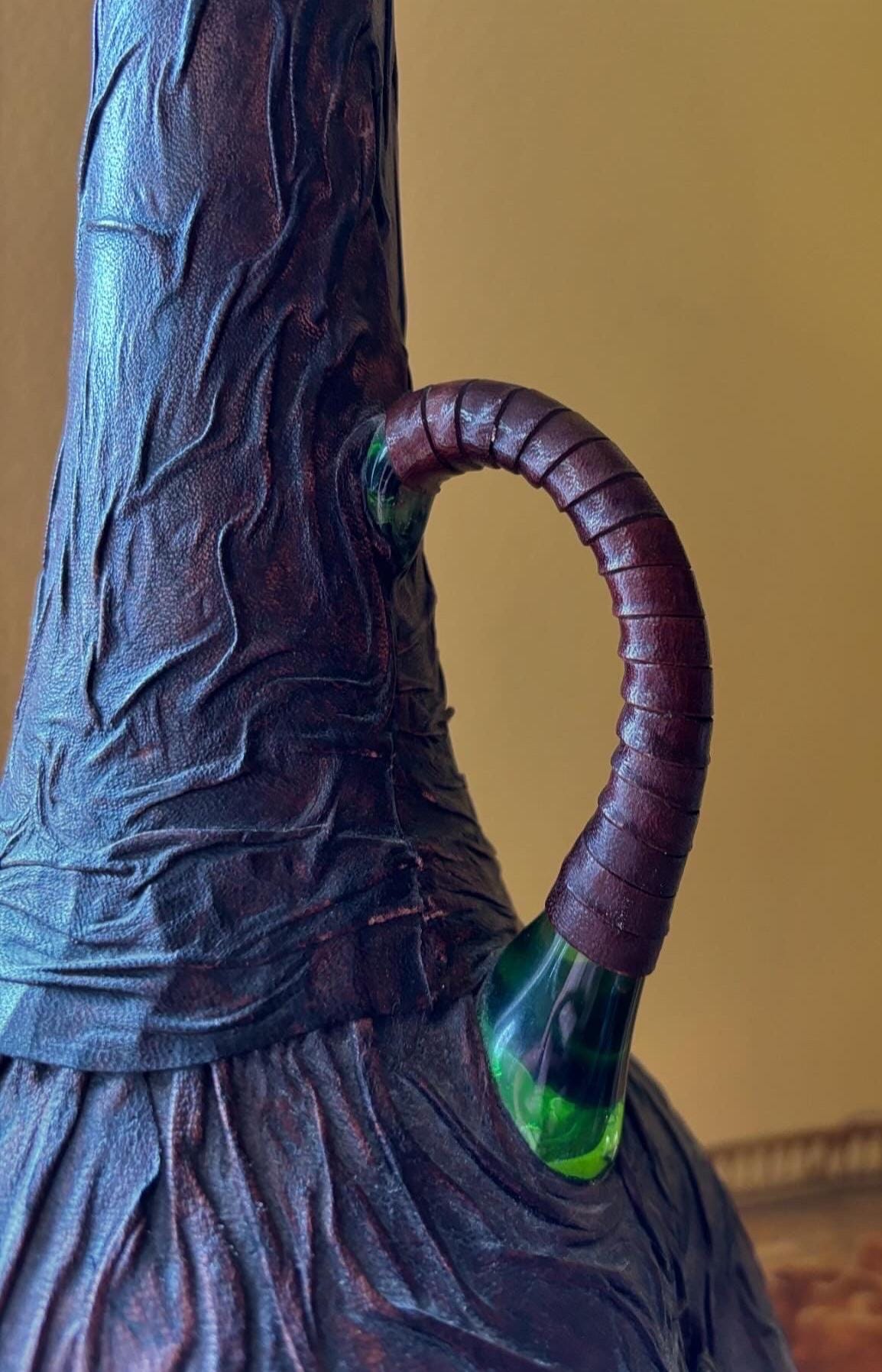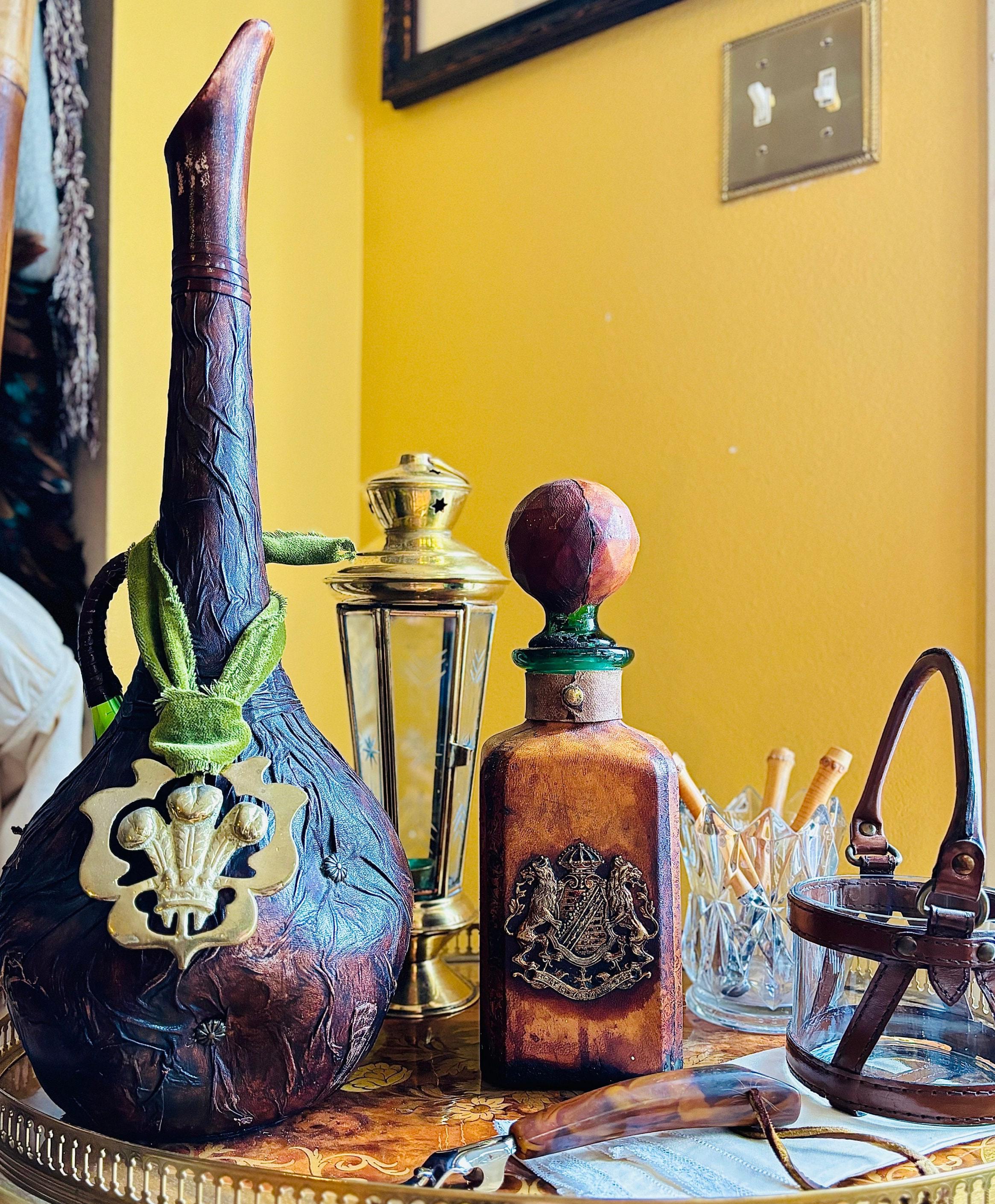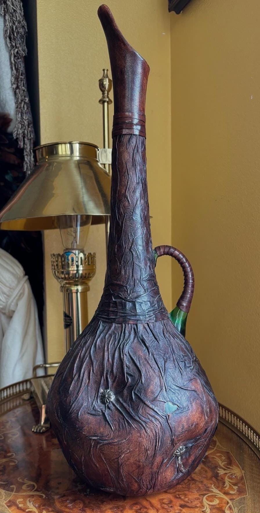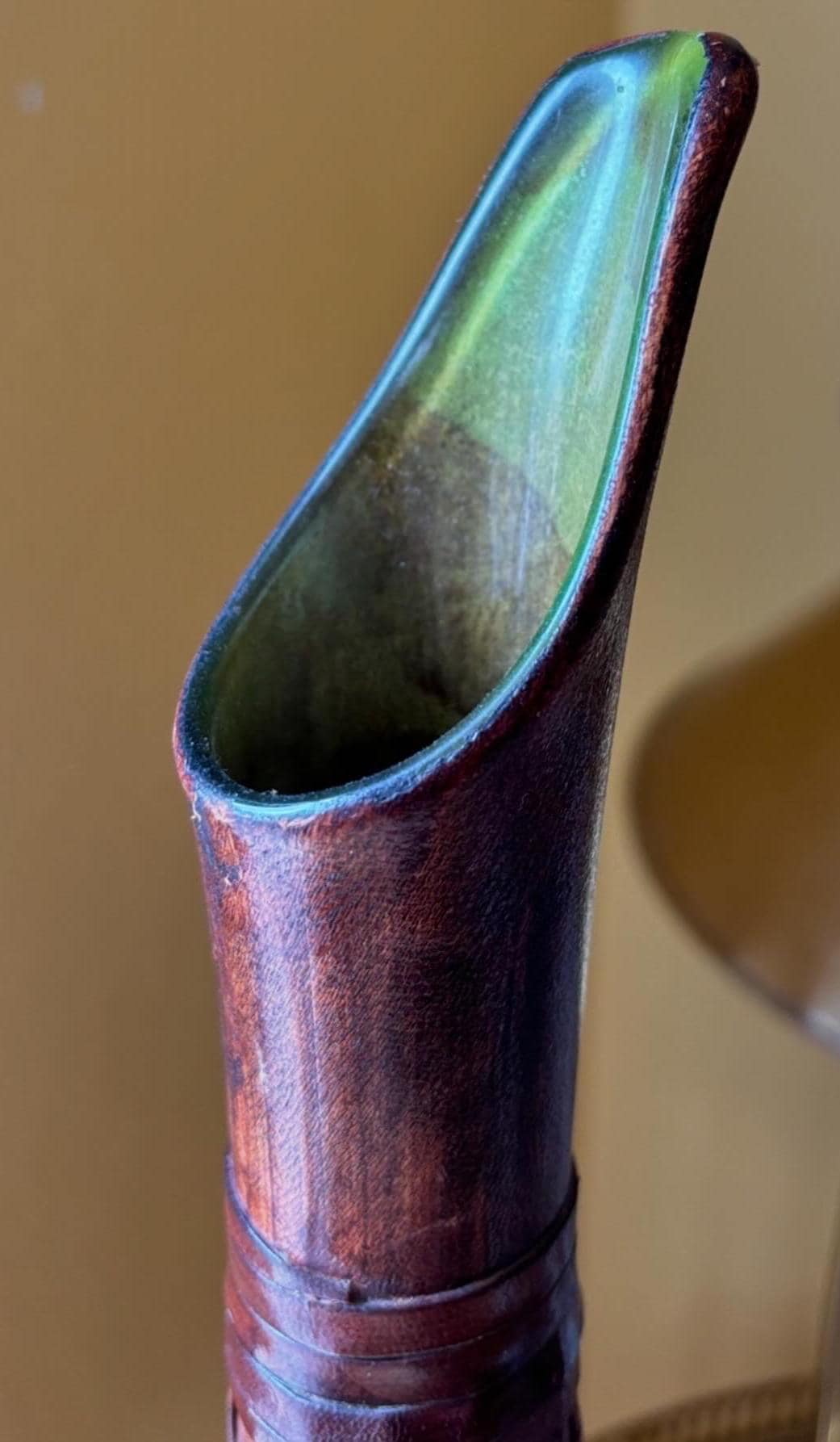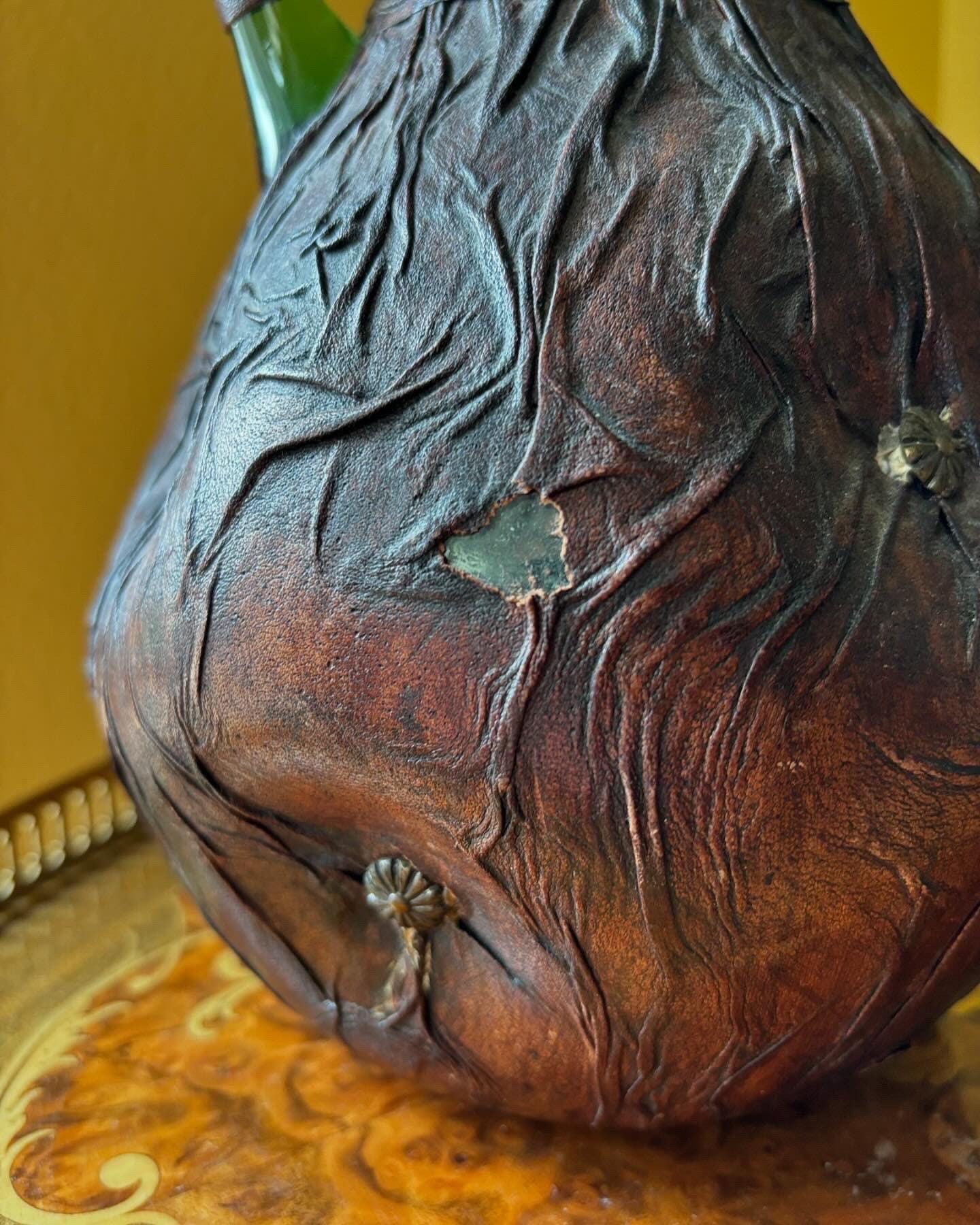 A leather wrapped handle, with a peek of the vintage green glass. The leather artwork is in a rich brown.