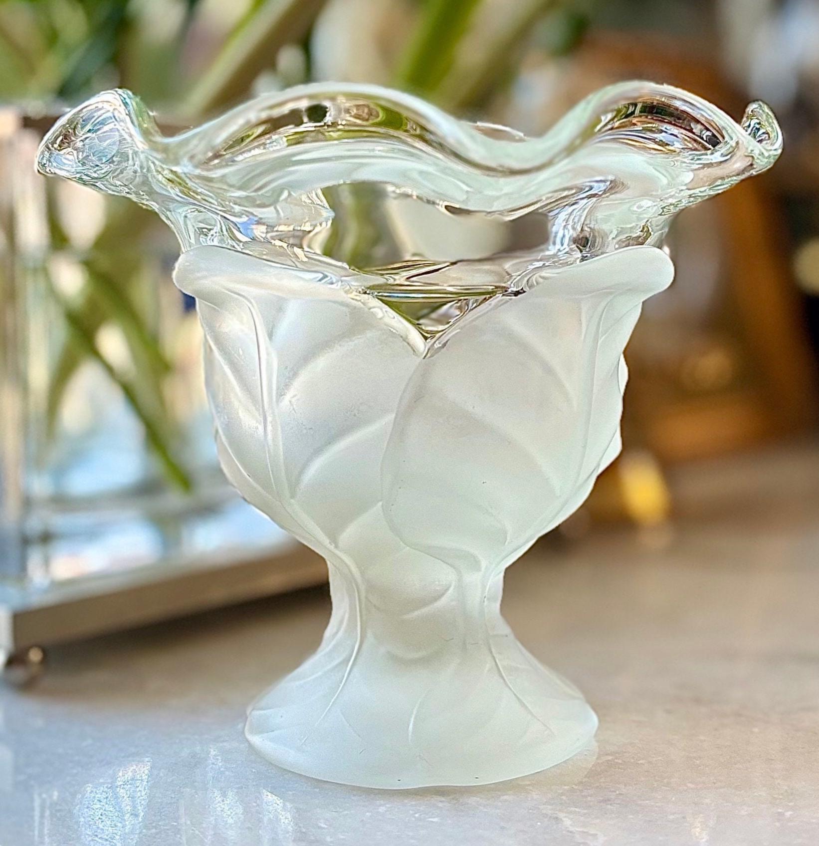 Beautiful satin glass, with banana leaves fanning from the bottom, to a crystal clear large ruffled edge.