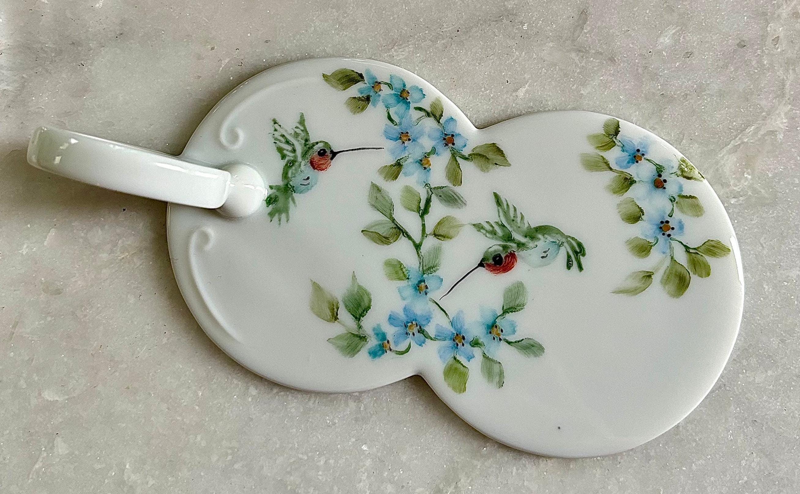 Full of handpainted, blue and green, hummingbirds, and flowers.