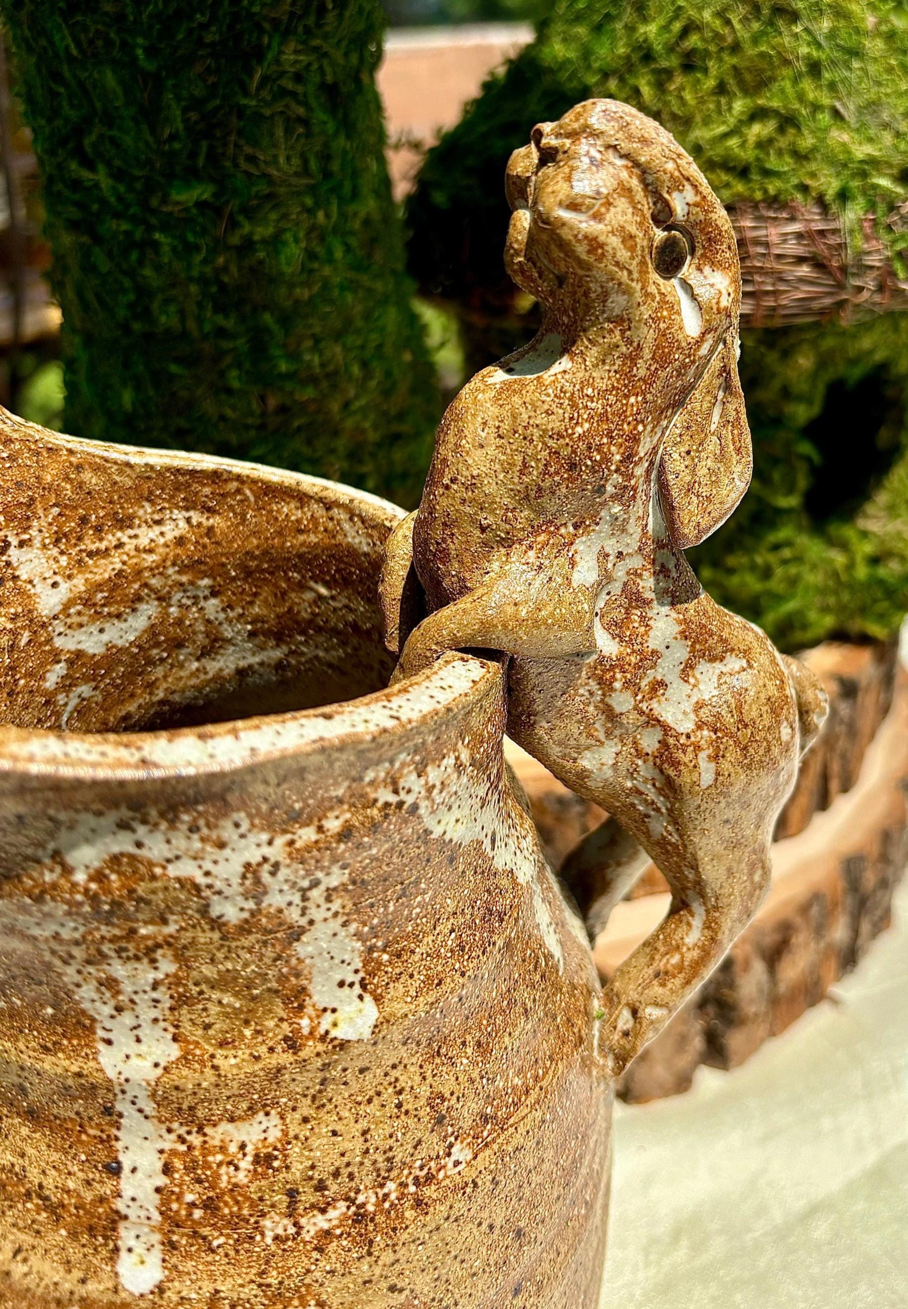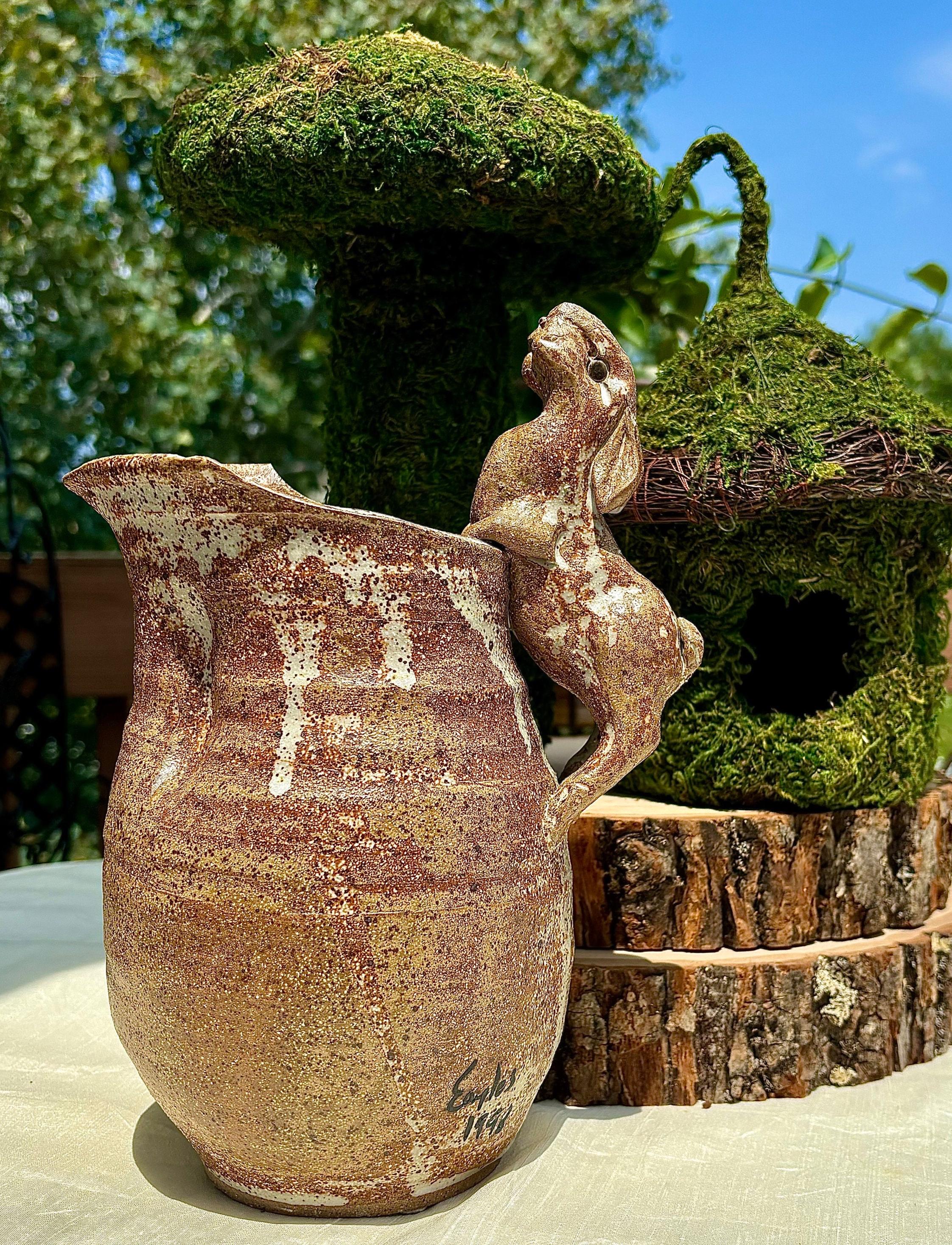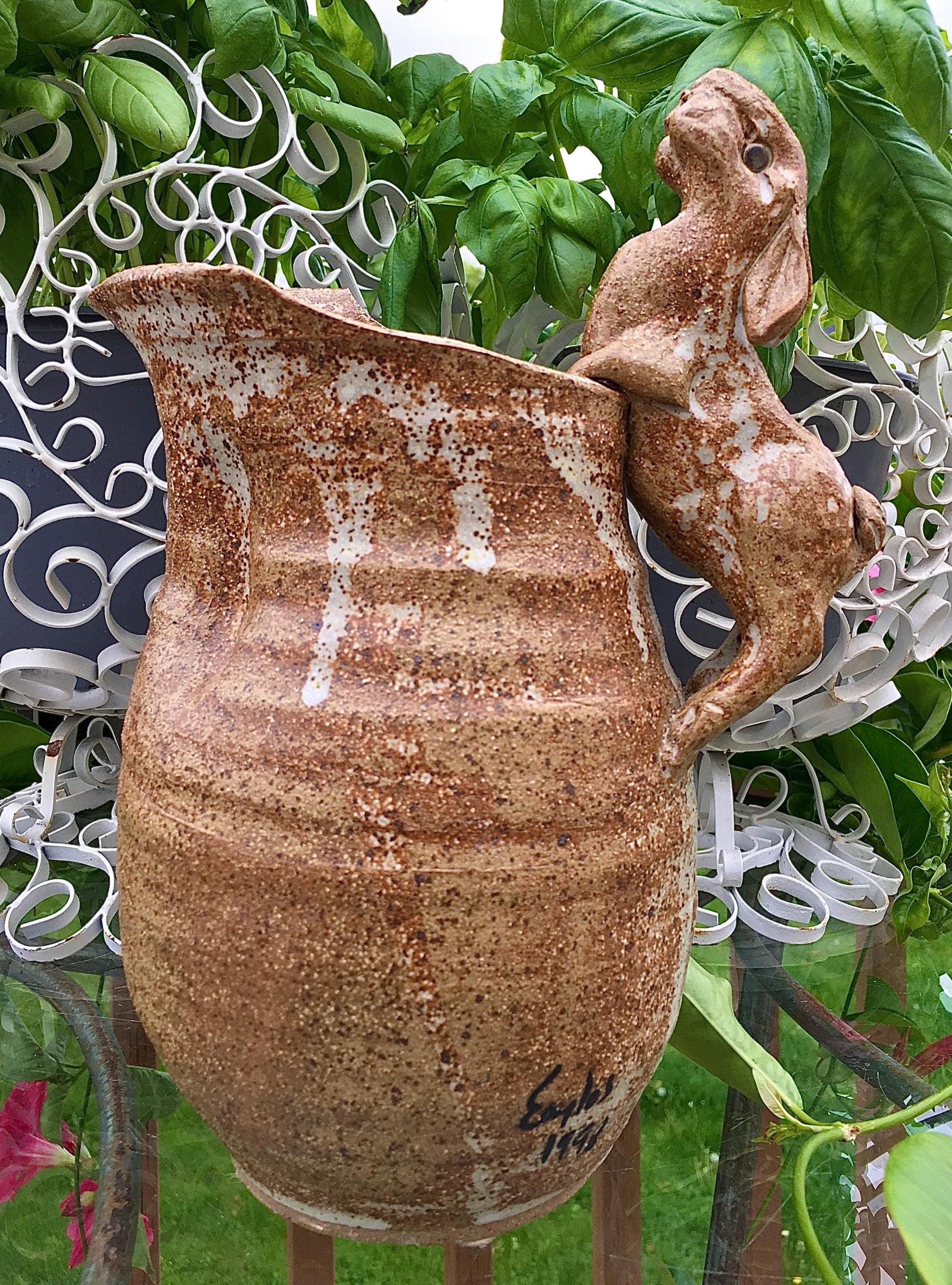 Beautiful vintage stoneware pitcher, with bunny or hare handle.