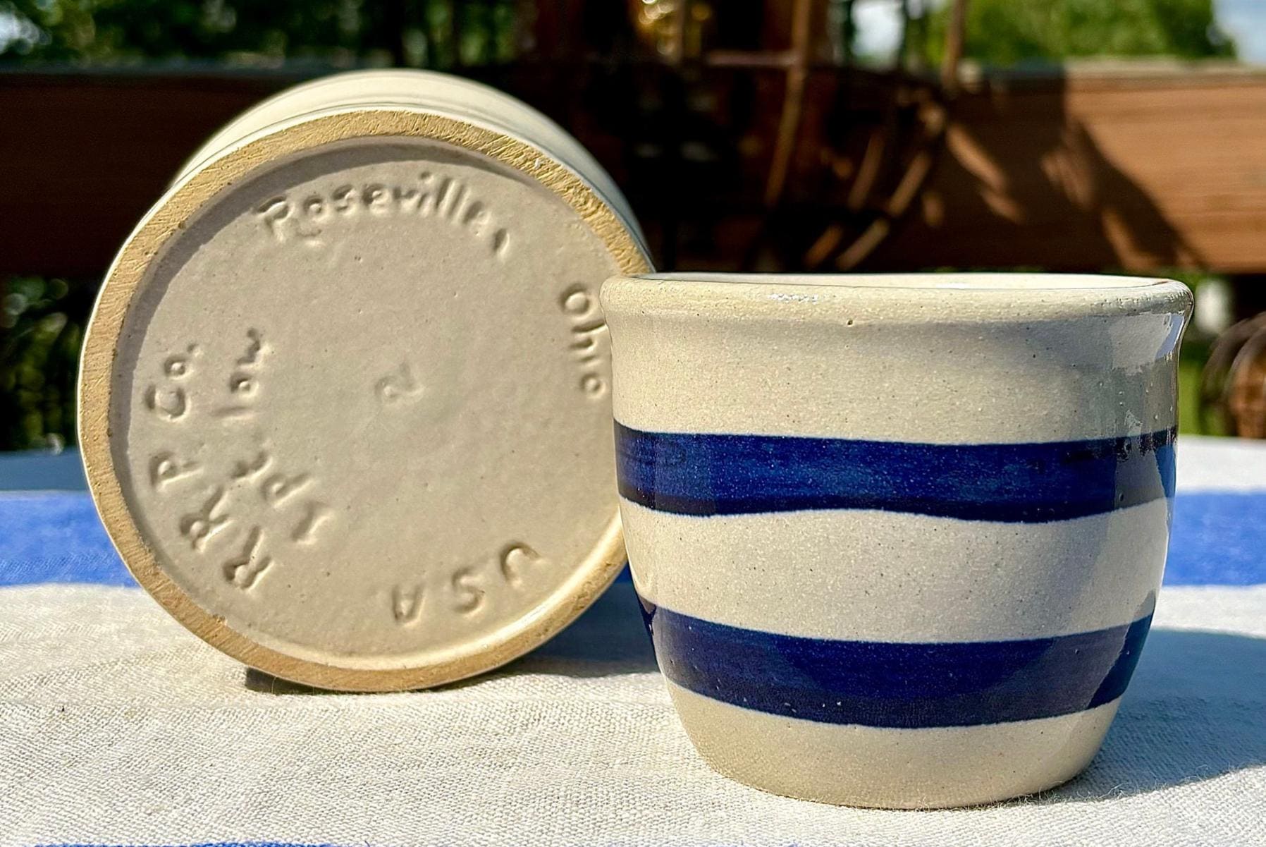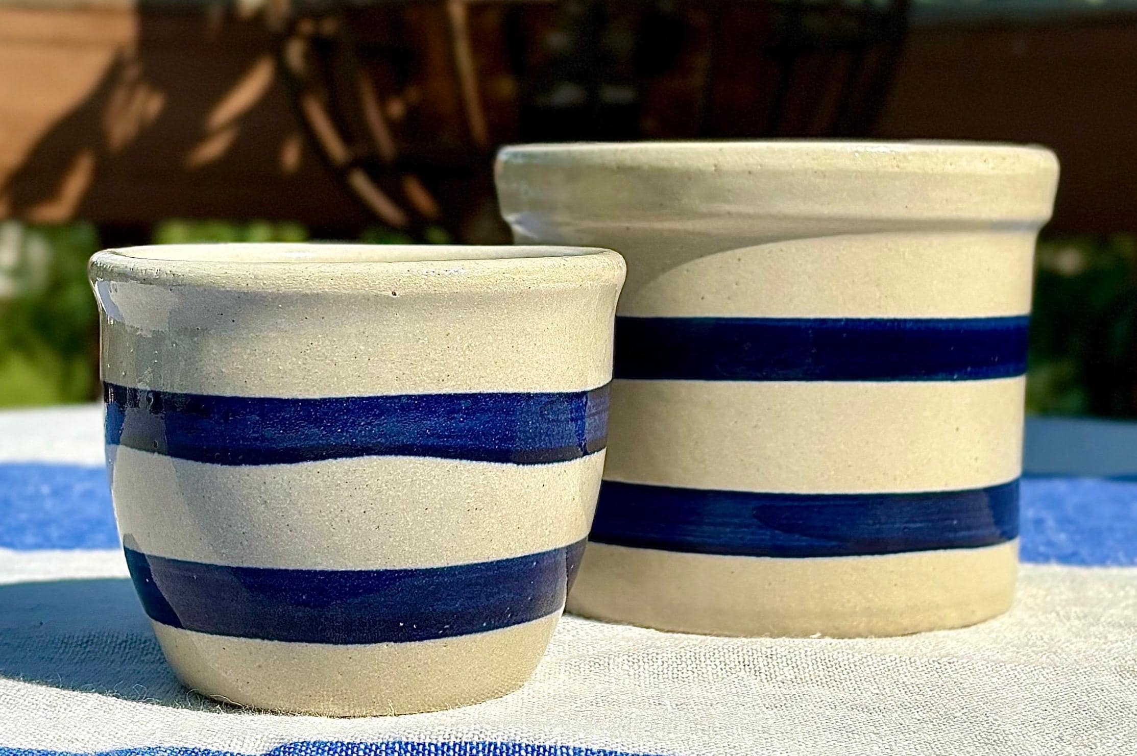 Offering the adored spongeware in a soft blue & vintage stoneware beige, and 2 in a preppy navy stripe.