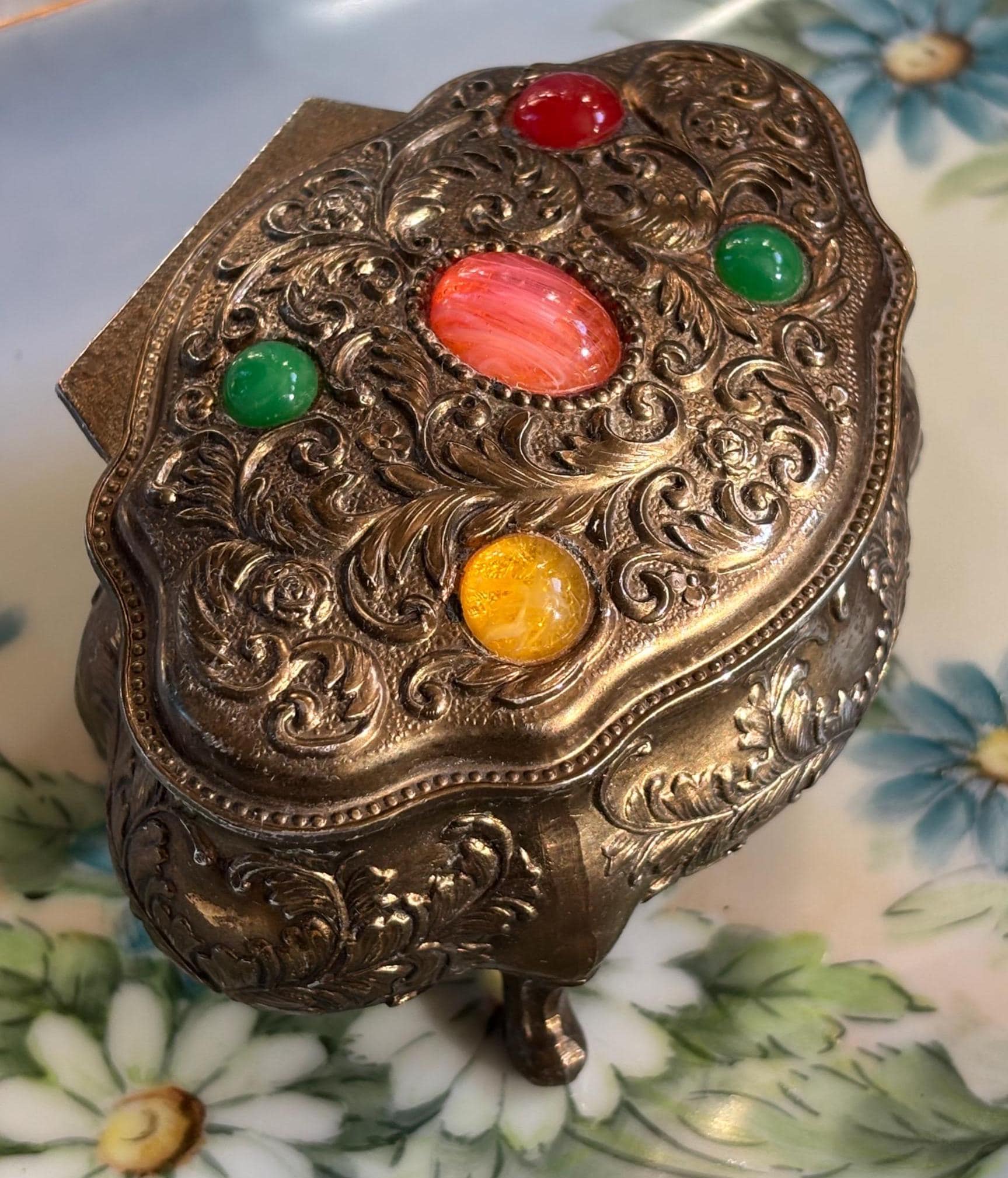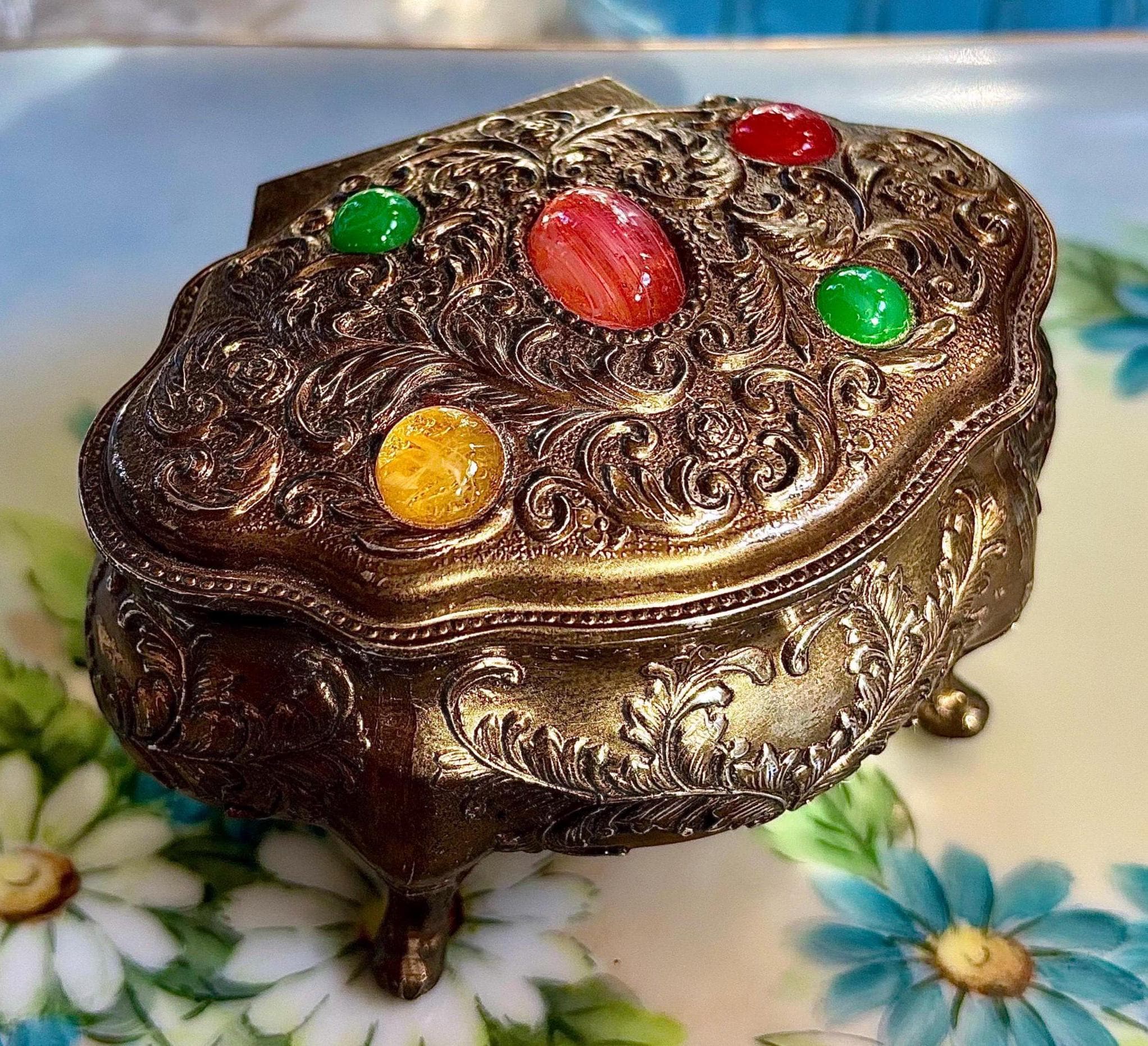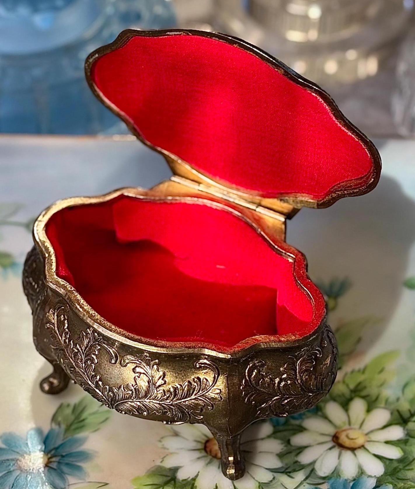 Embossed scrollwork throughout. Interior is red velvet lined.