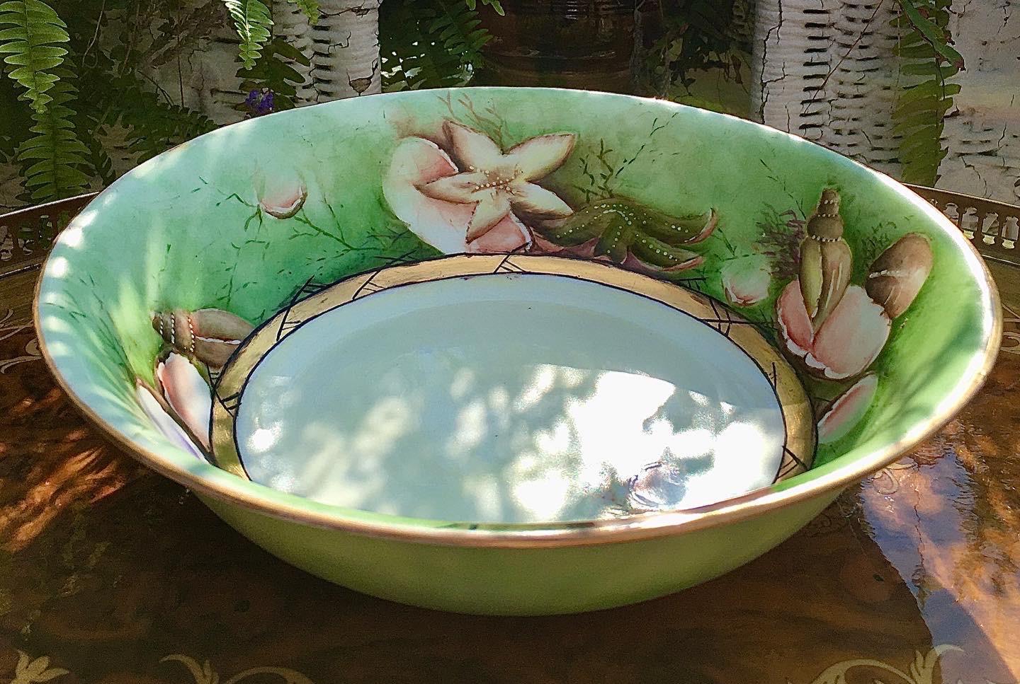 Adorned with hand painted sea life. With seashells...including conch, clam, starfish, and coral.