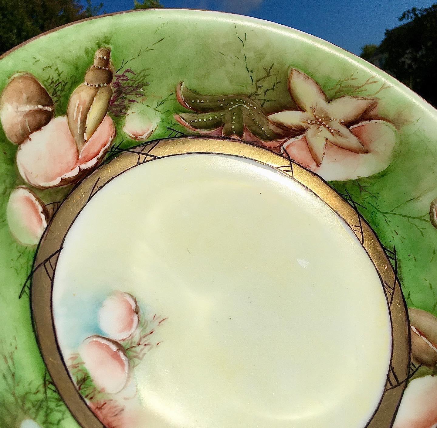 Sublime colors of celadon green and salmon, with 22k gold trimming’s.