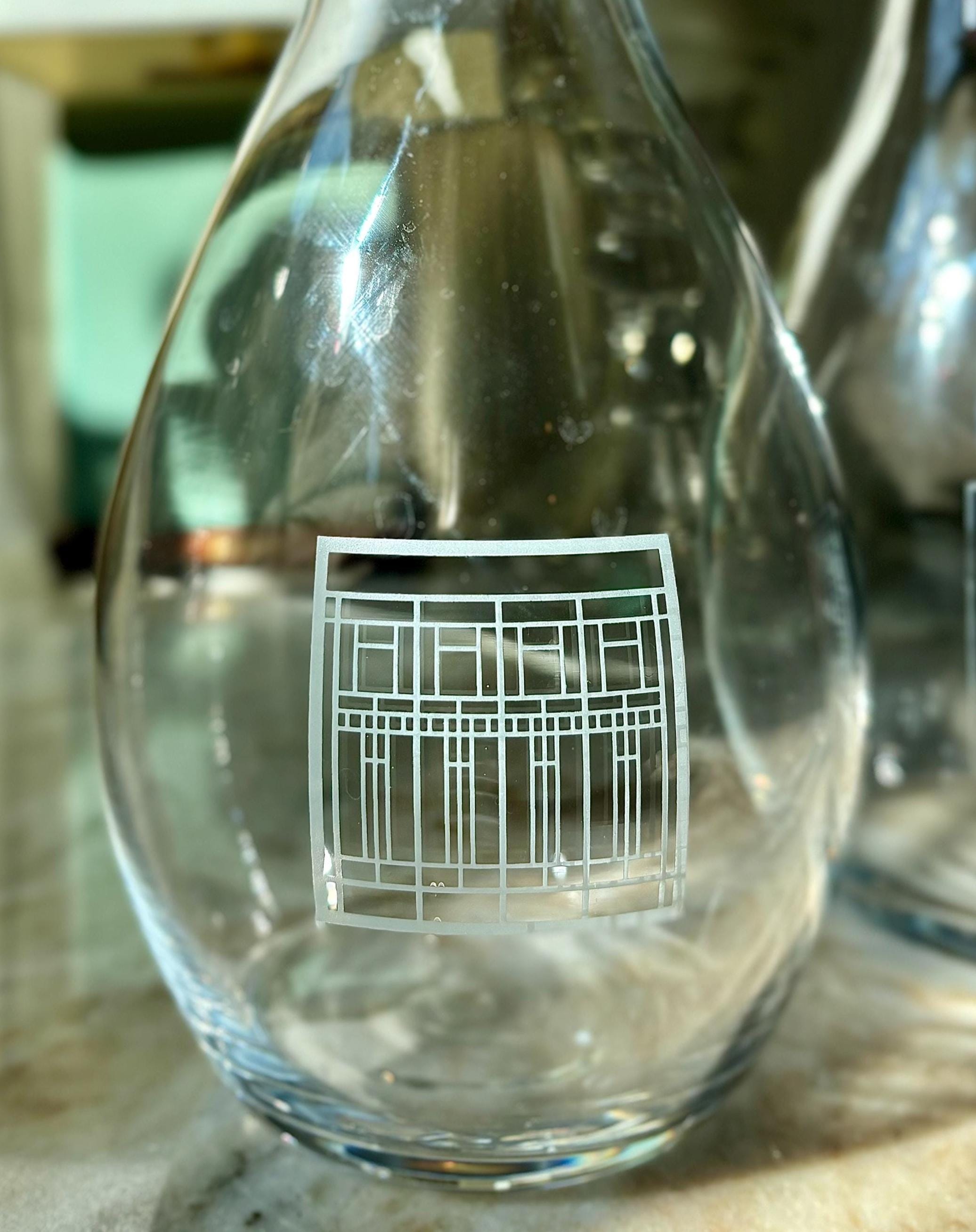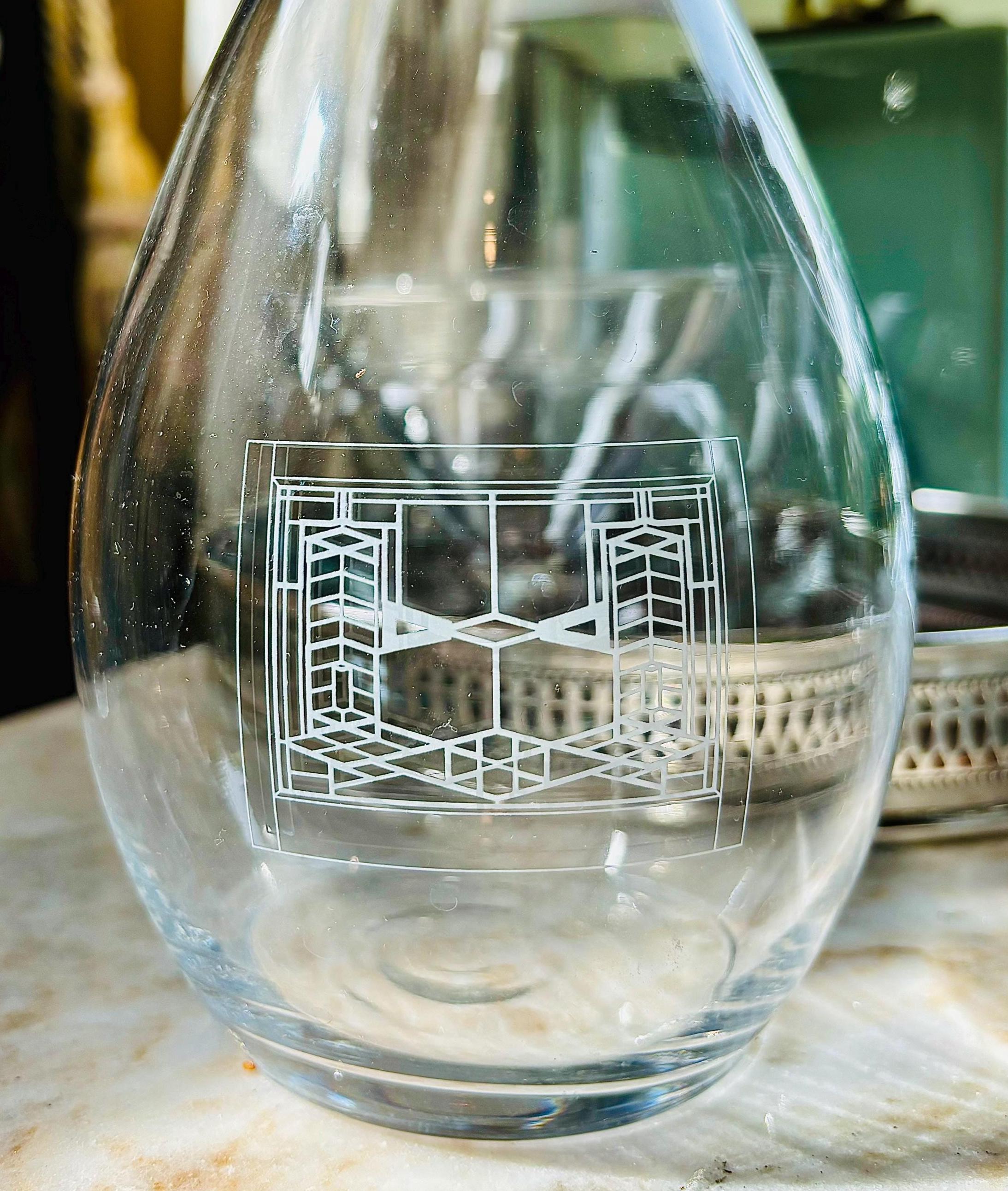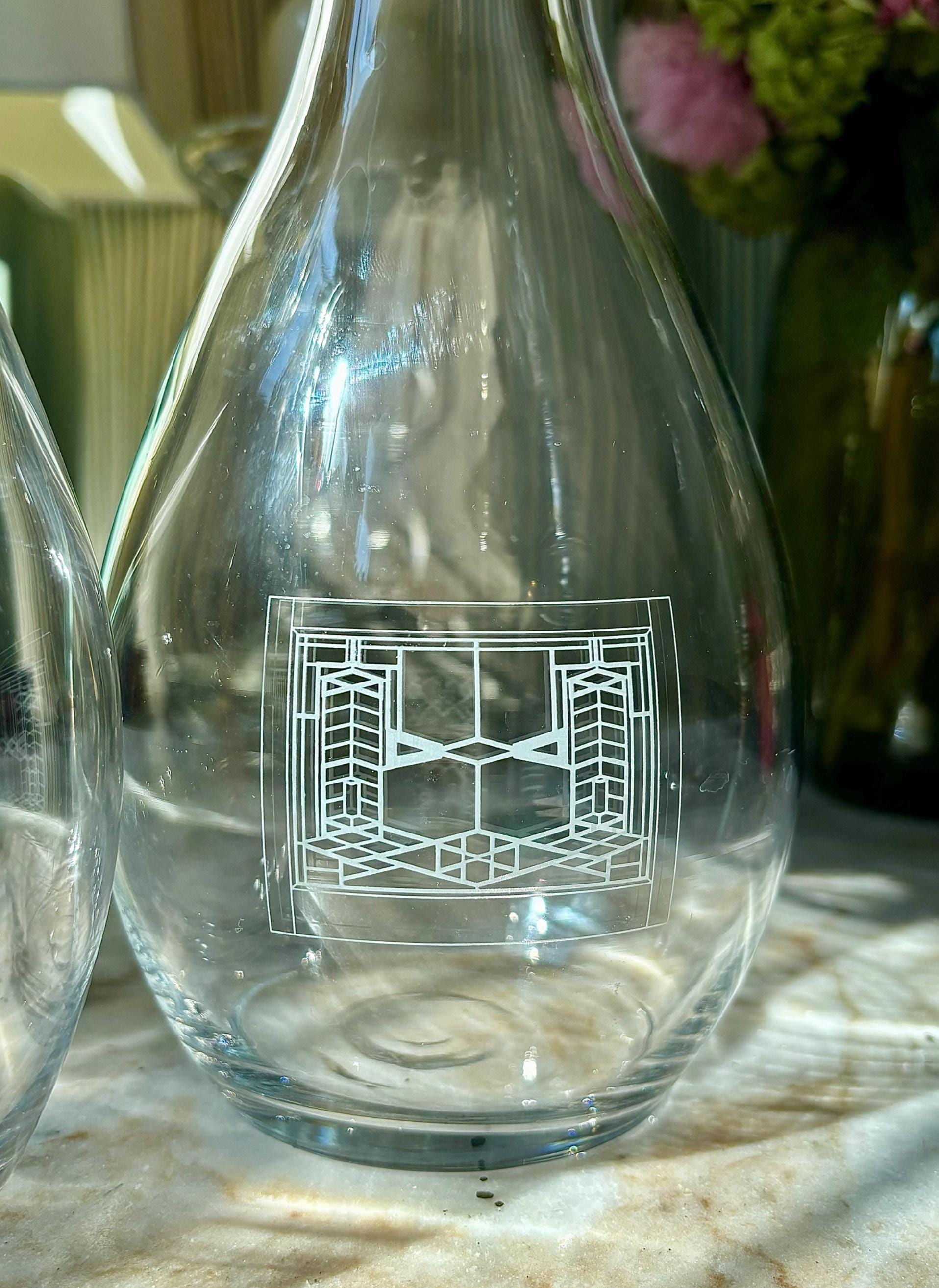 Gorgeous handblown crystal, sleek and stunning...with etched Frank Lloyd Wright style art.