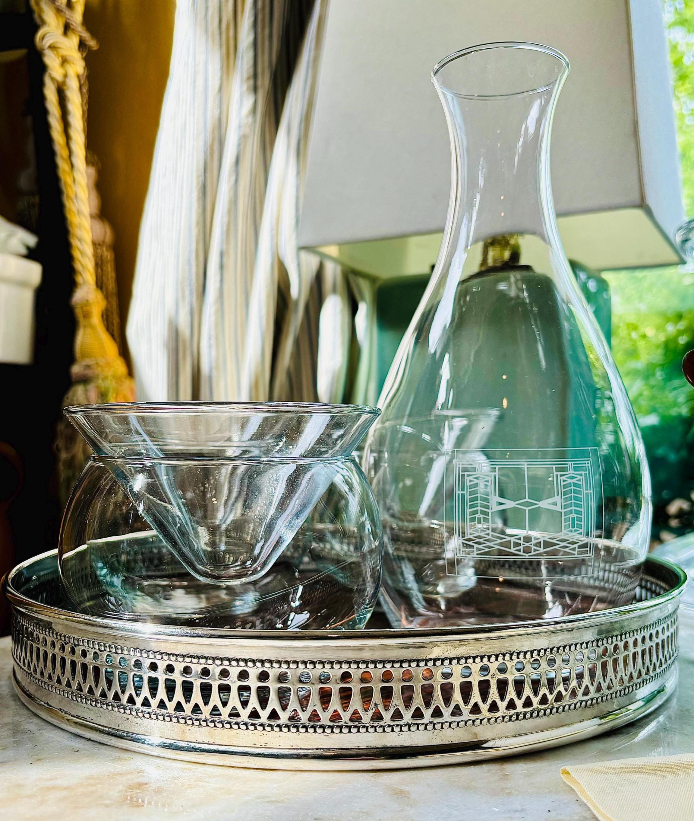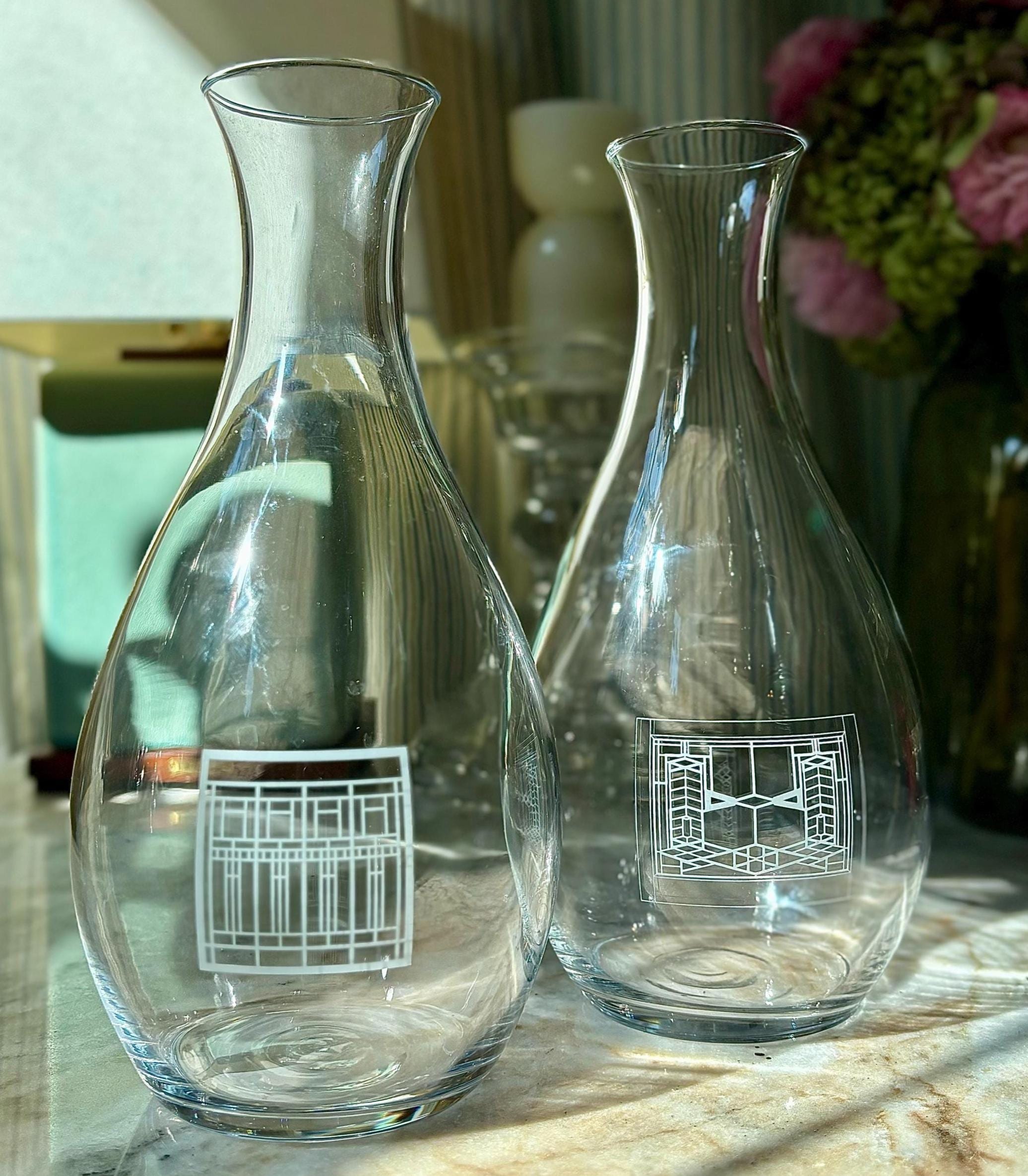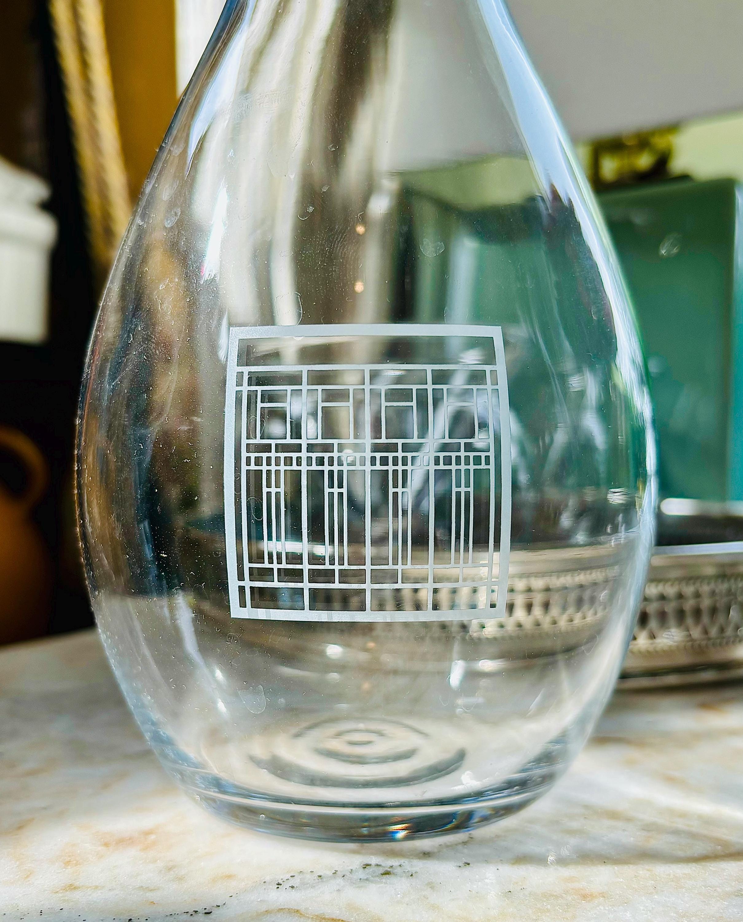 Gorgeous handblown crystal, sleek and stunning...with etched Frank Lloyd Wright style art.