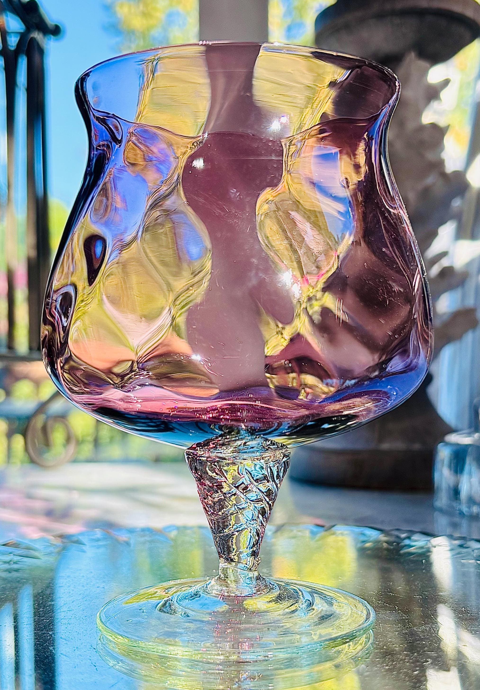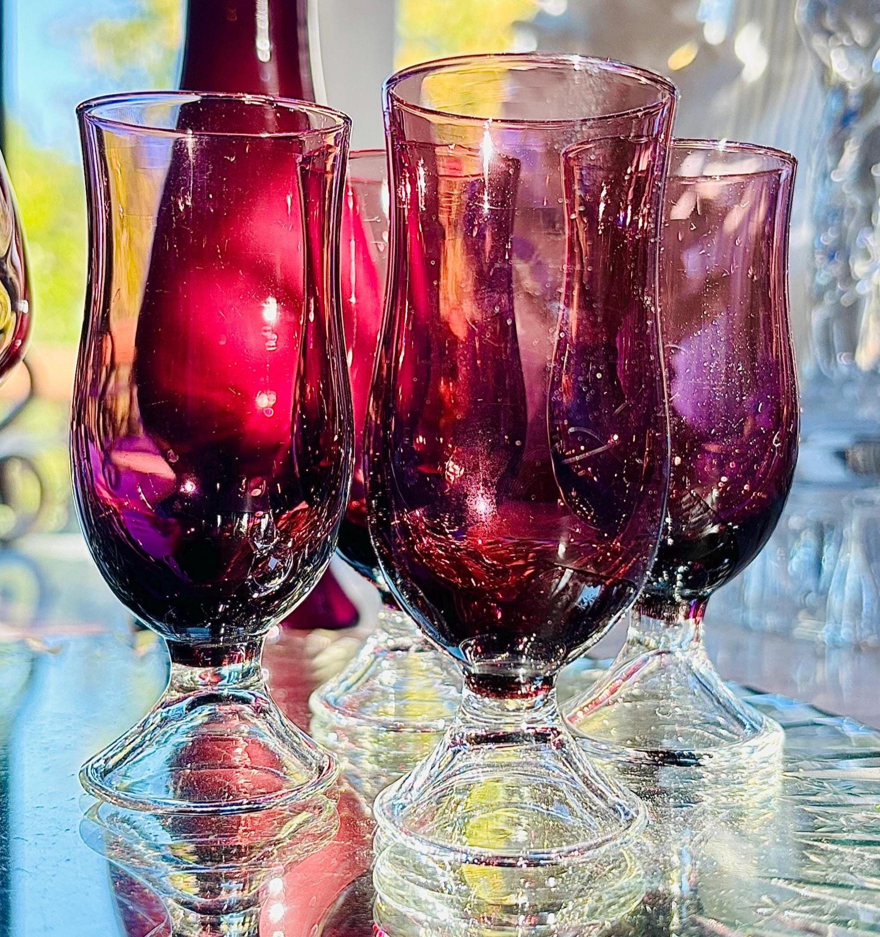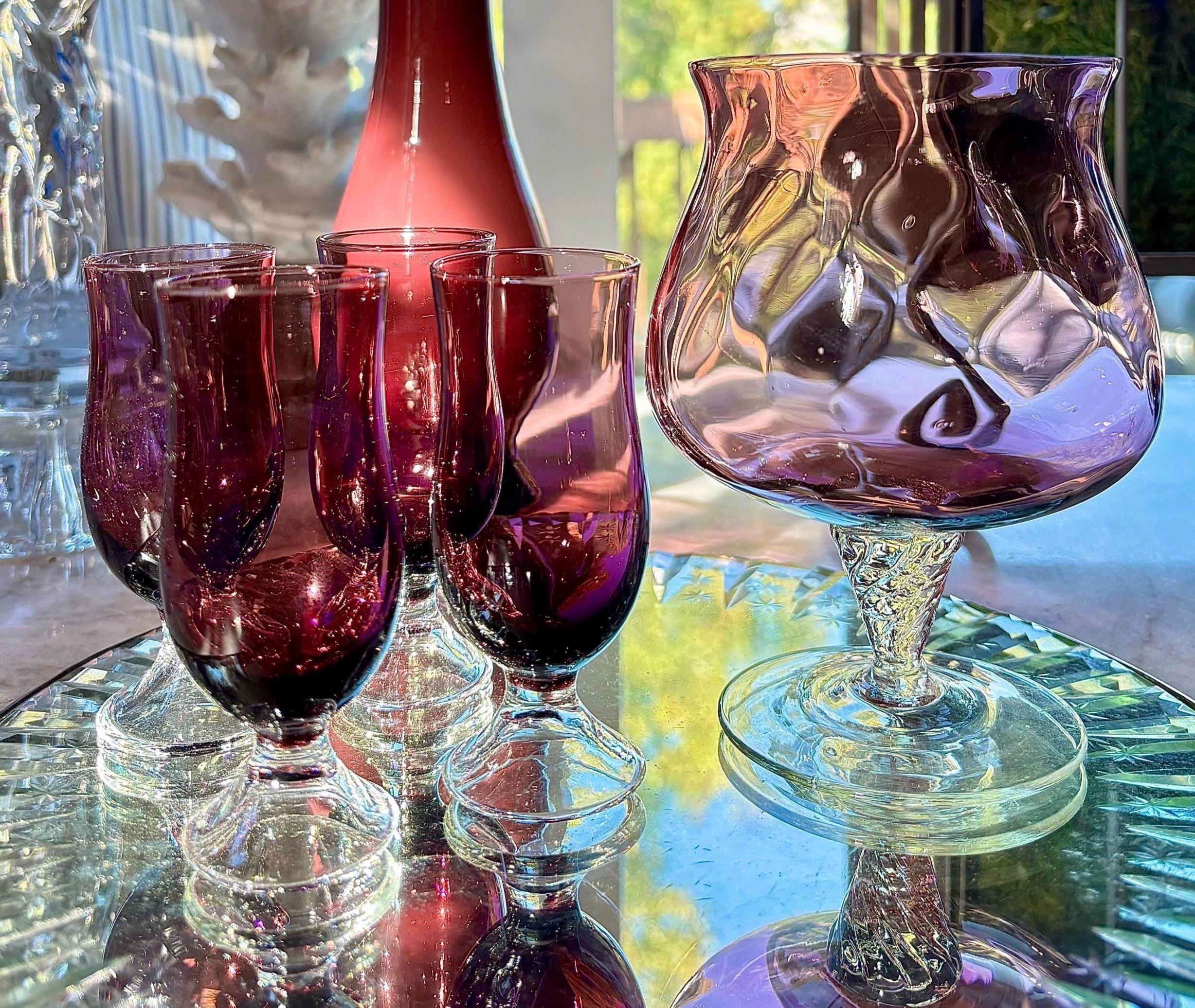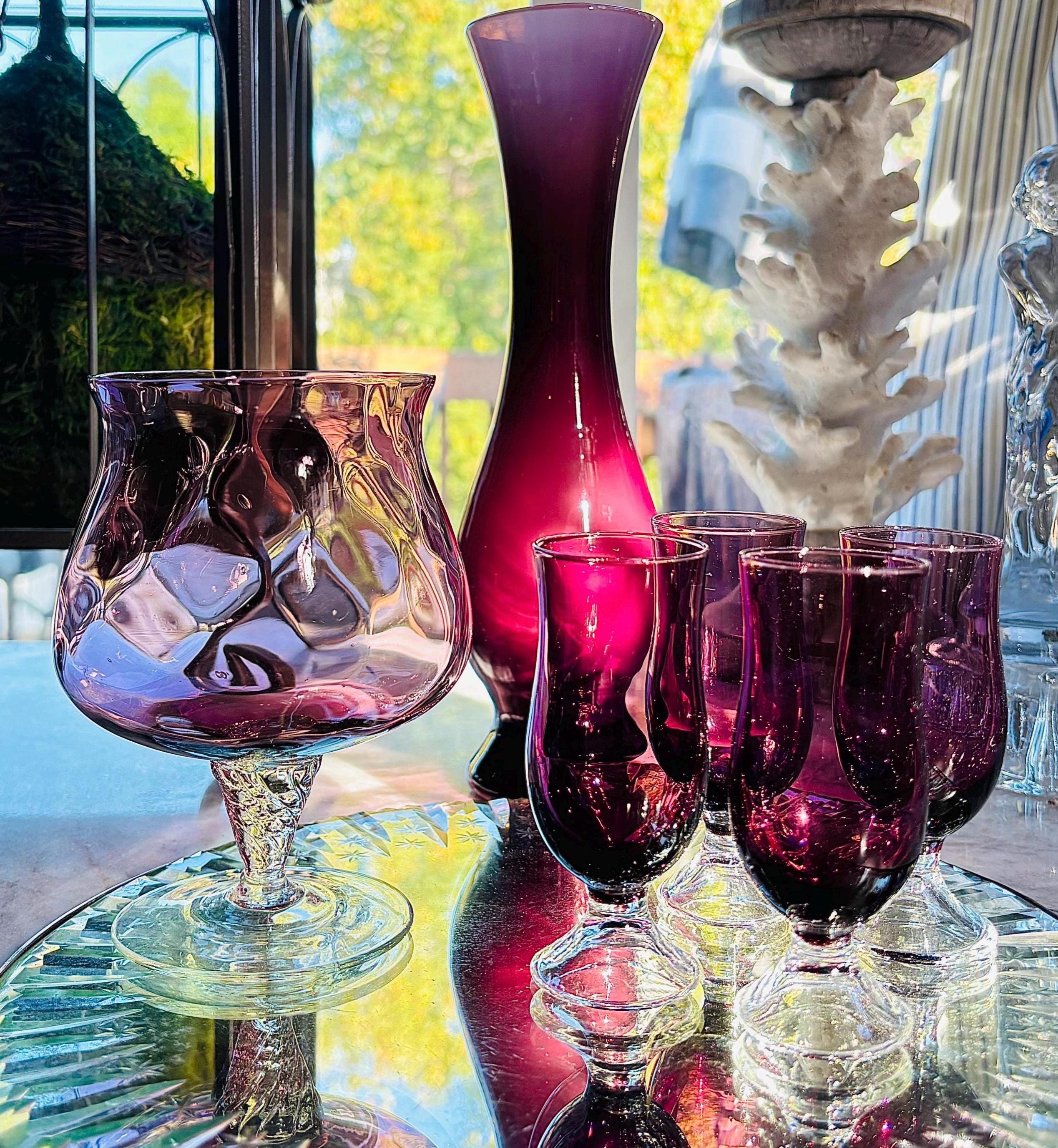 This pristine Mid-Century set includes a beautiful optic amethyst glass snifter or server, and 4 cordial glasses.