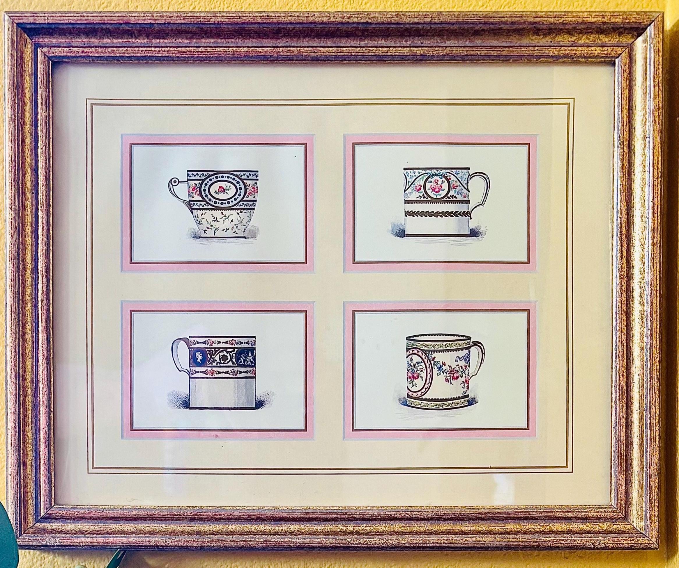 This print displays 4 ornate Sevres teacups with colors of pinks, blues, greens, and gold.