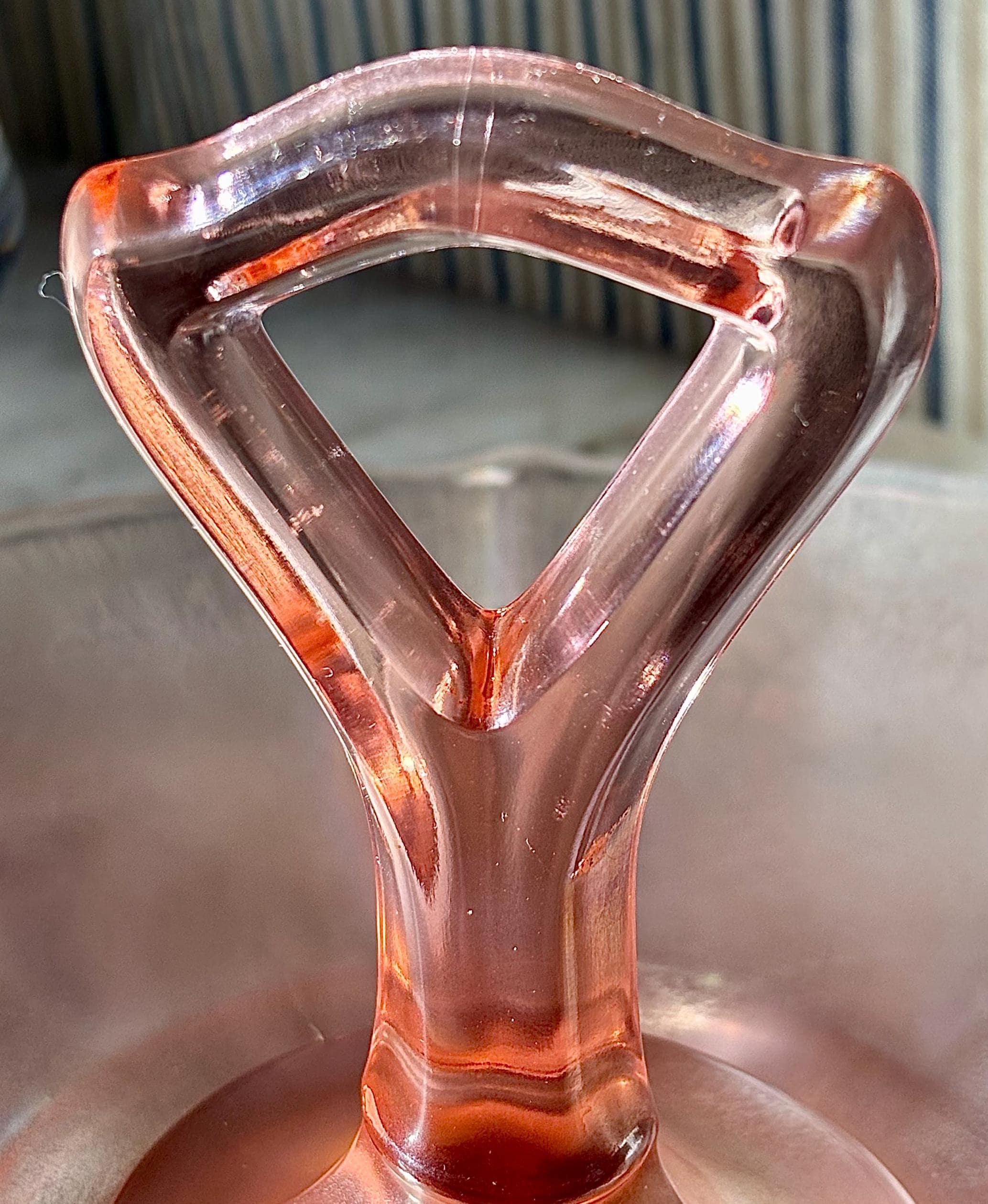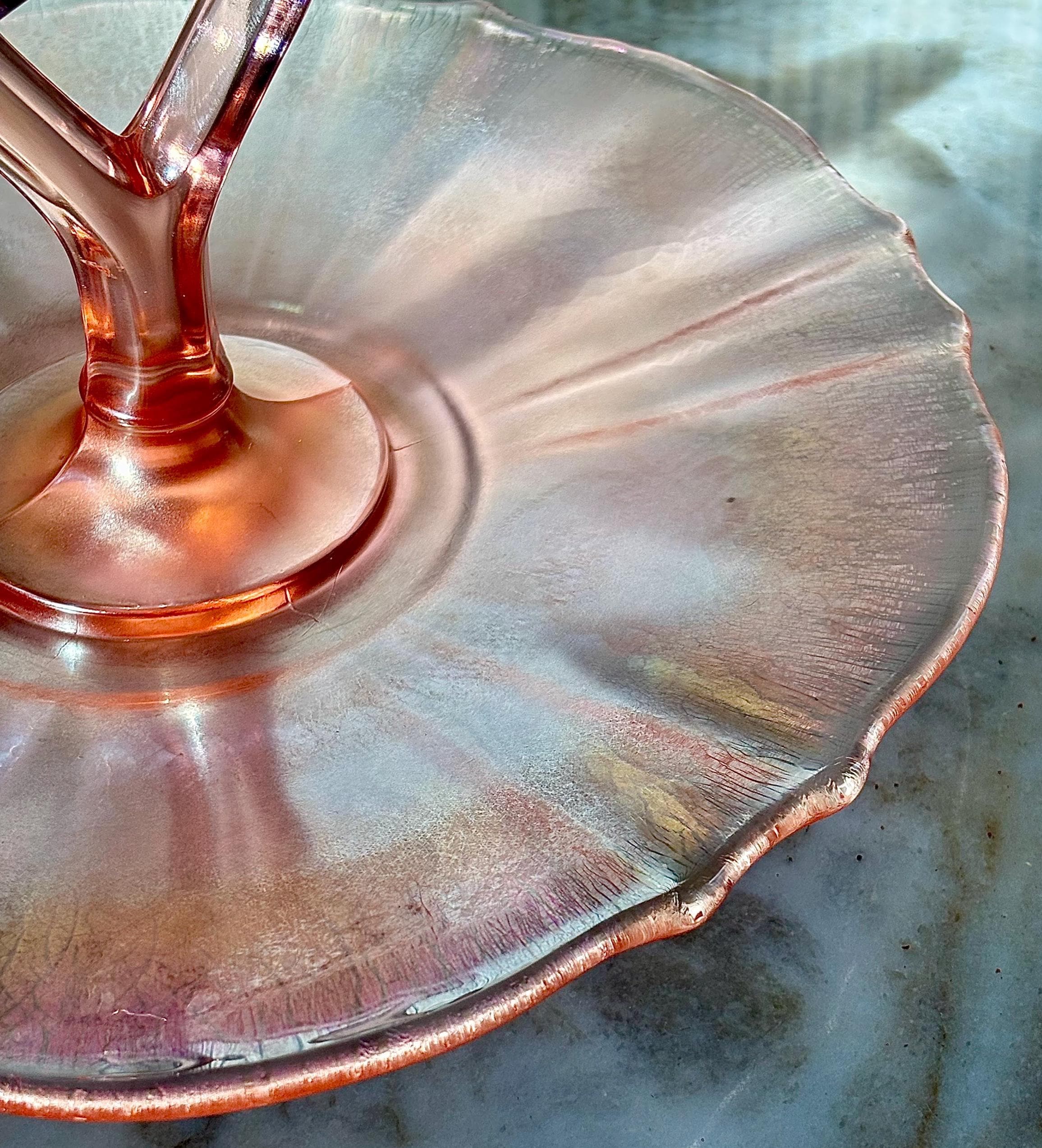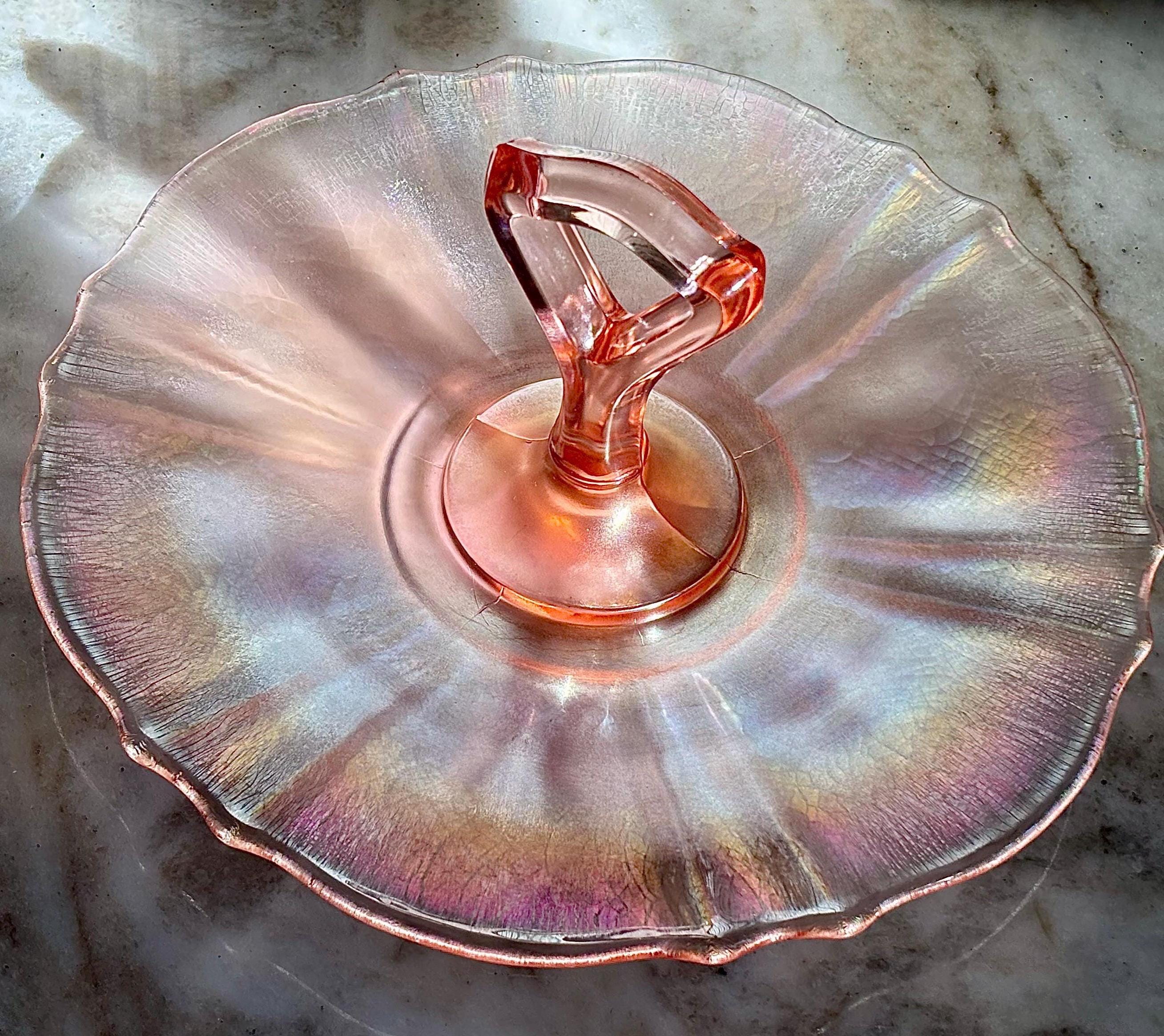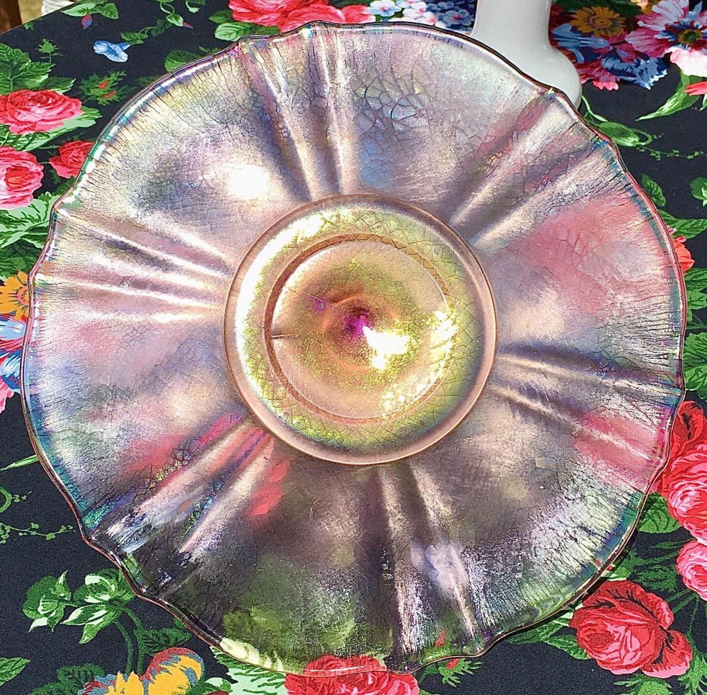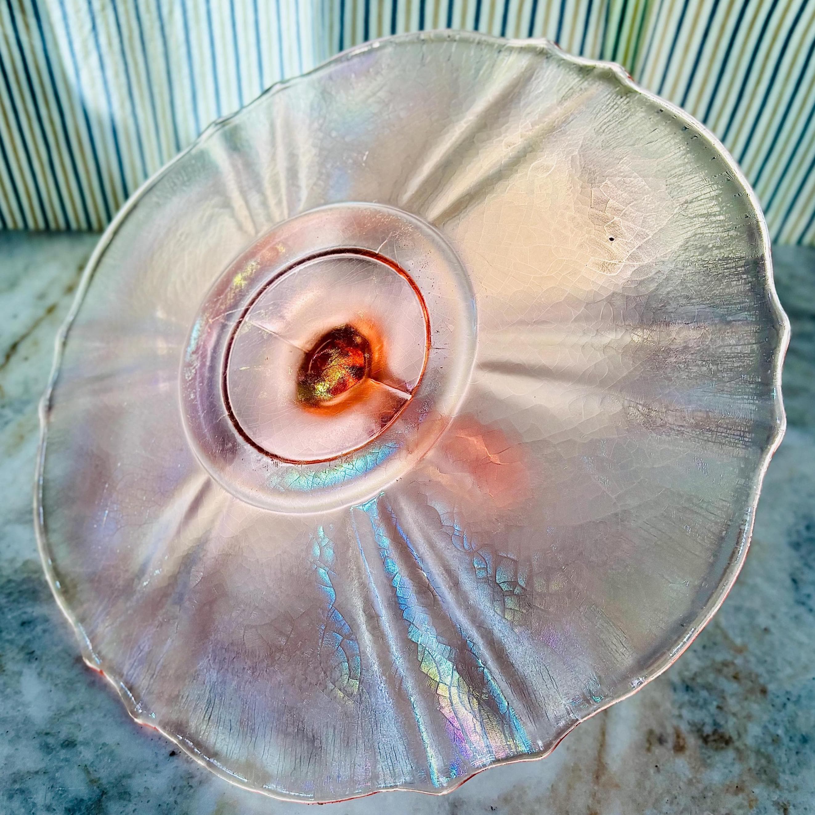 This pristine beauty, circa 1930’s, is of iridescent stretch glass, with scalloped edges, and clear pink key hole handle for toting.