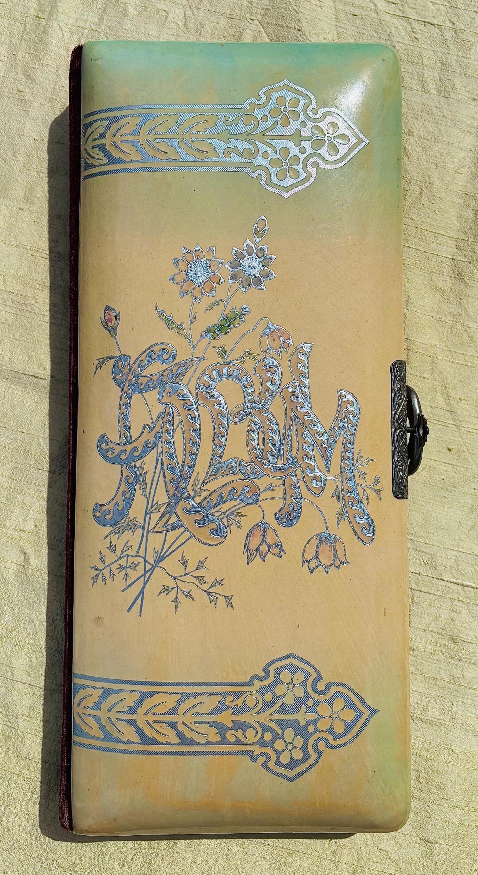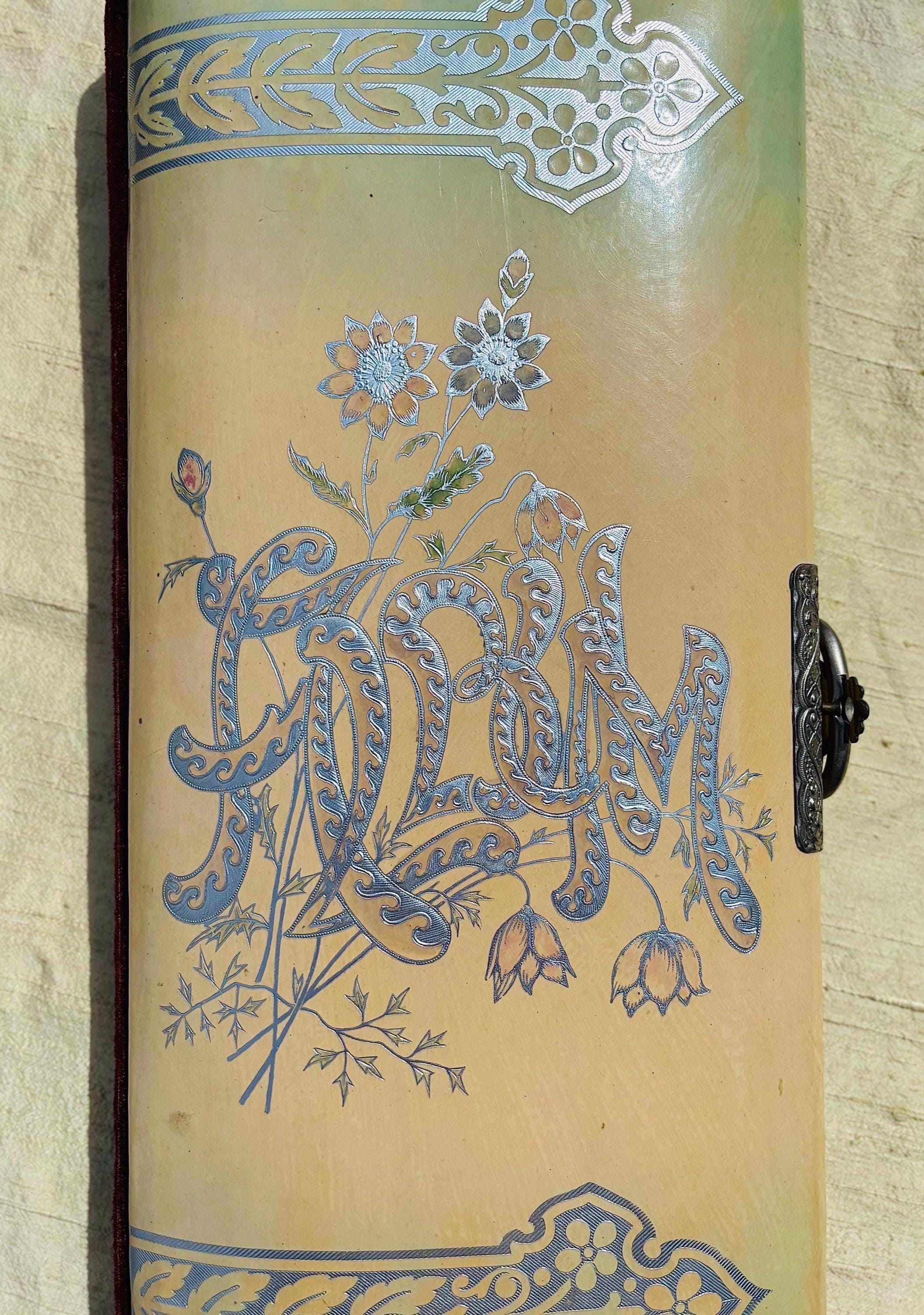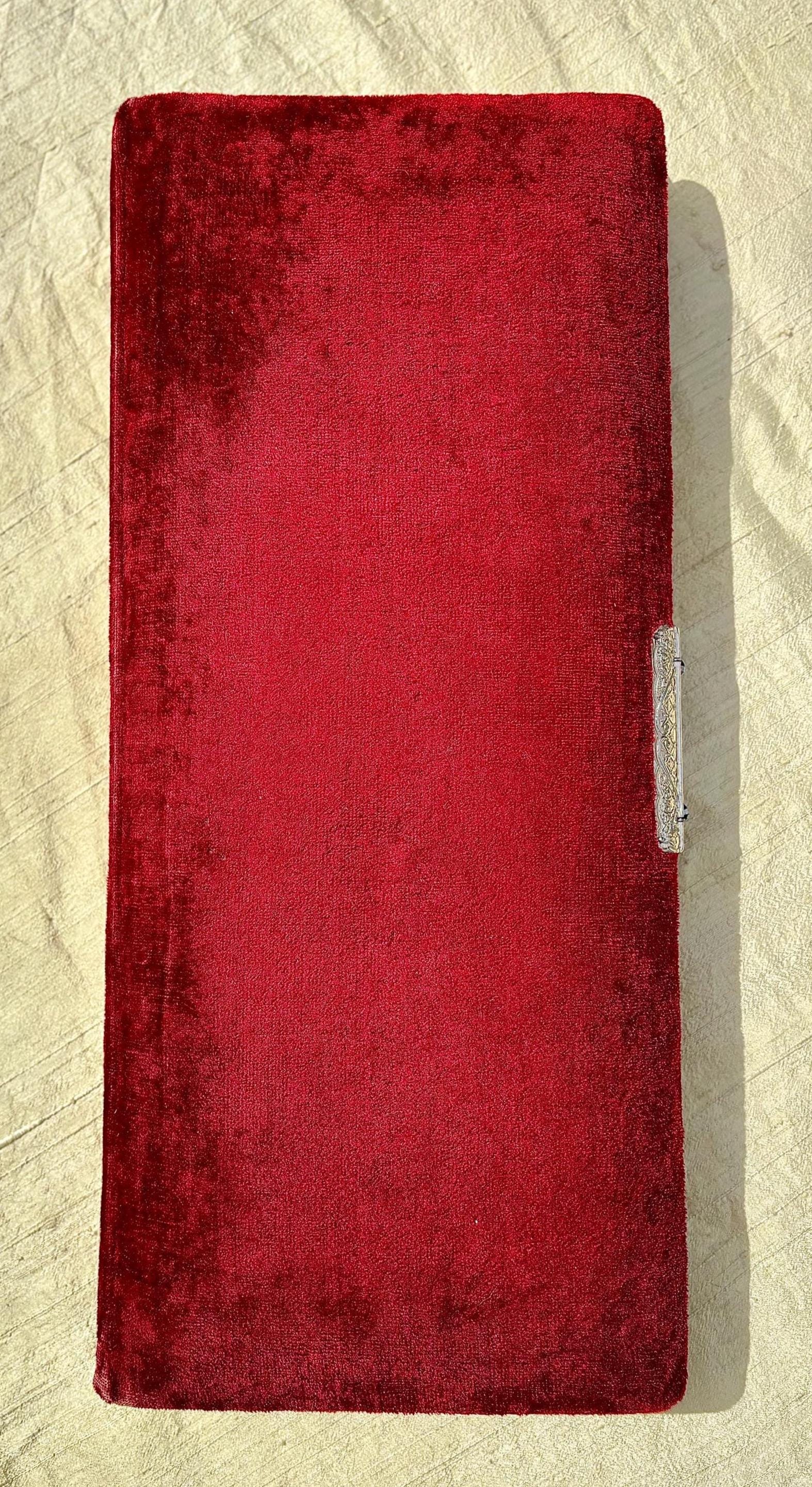 From the celluloid Art Deco design and silver leaf font of “ALBUM”, to the gold leaf binding, velvet scarlet red backing, sepia patina heavy stock paper, with gold trimmed framing, and the highly ornate silver closure.