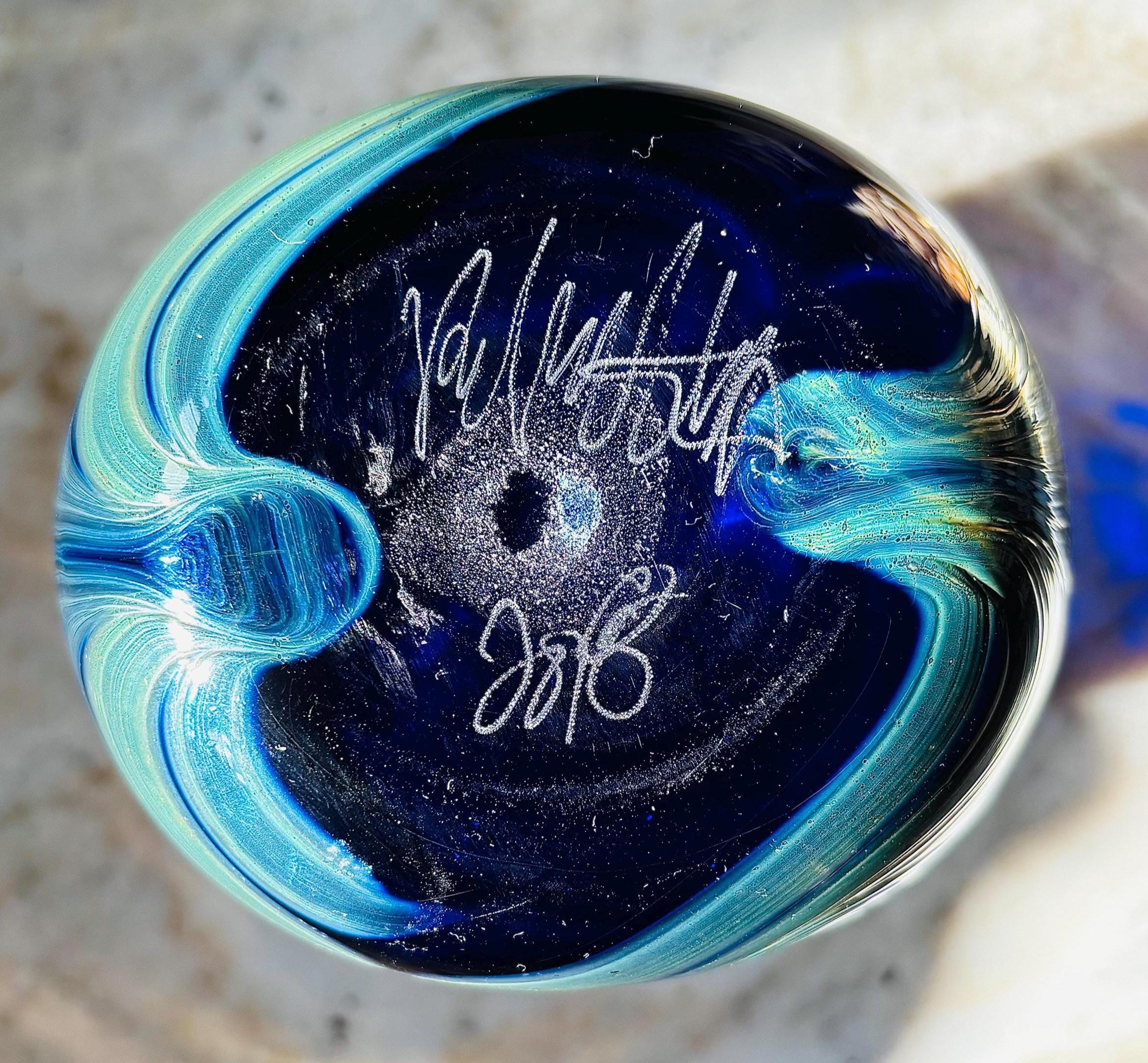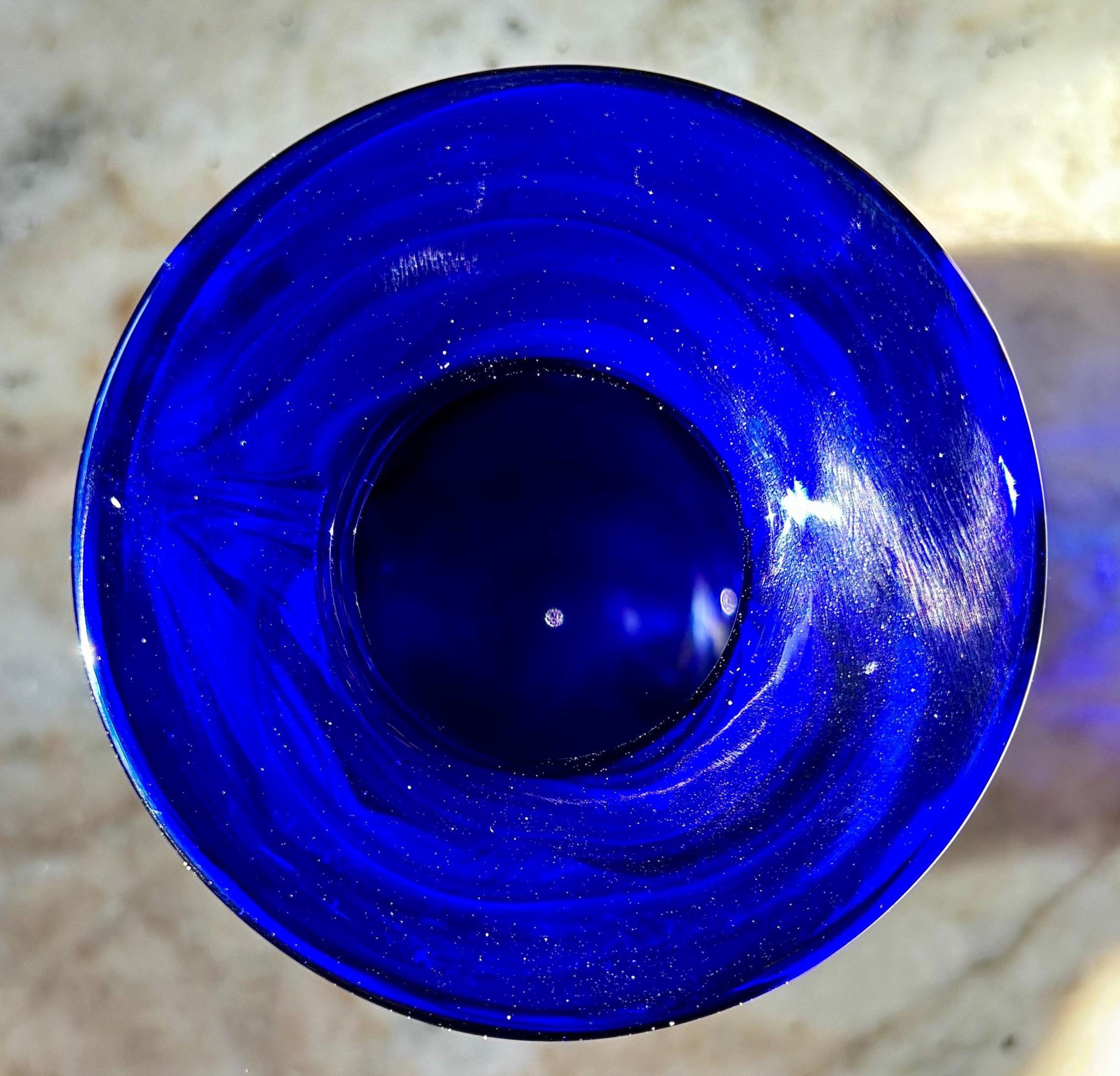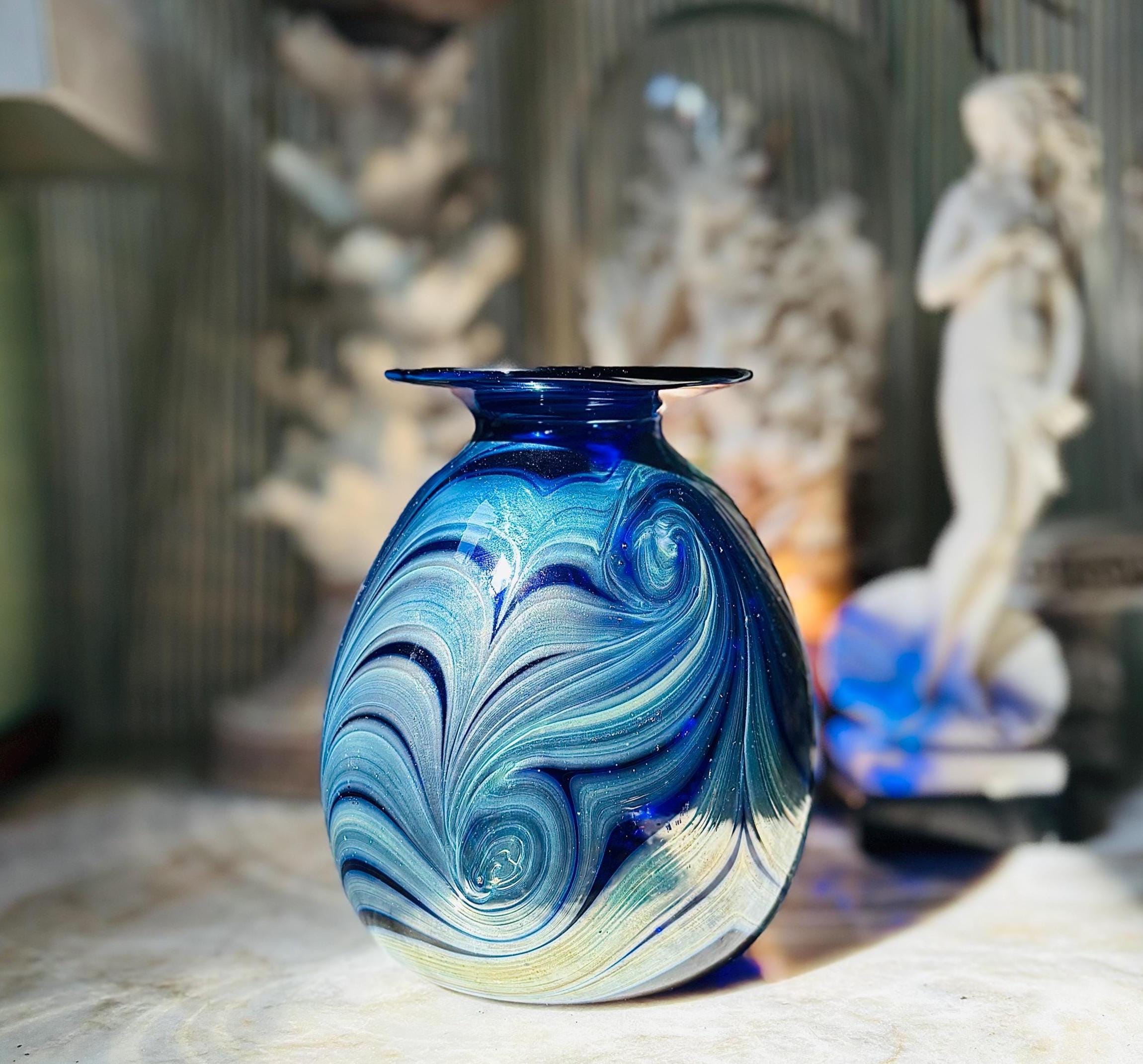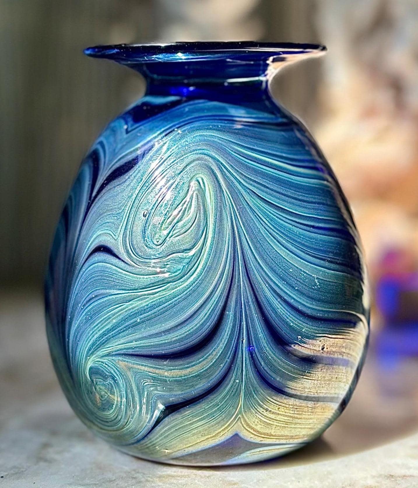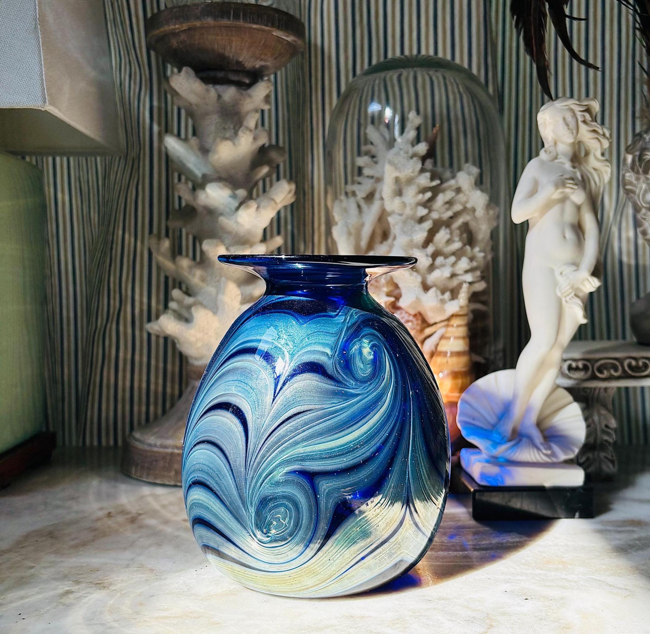 Phenomenal and mesmerizing cobalt iridescent pulled feather vase, by renowned California artist Rick Hunter