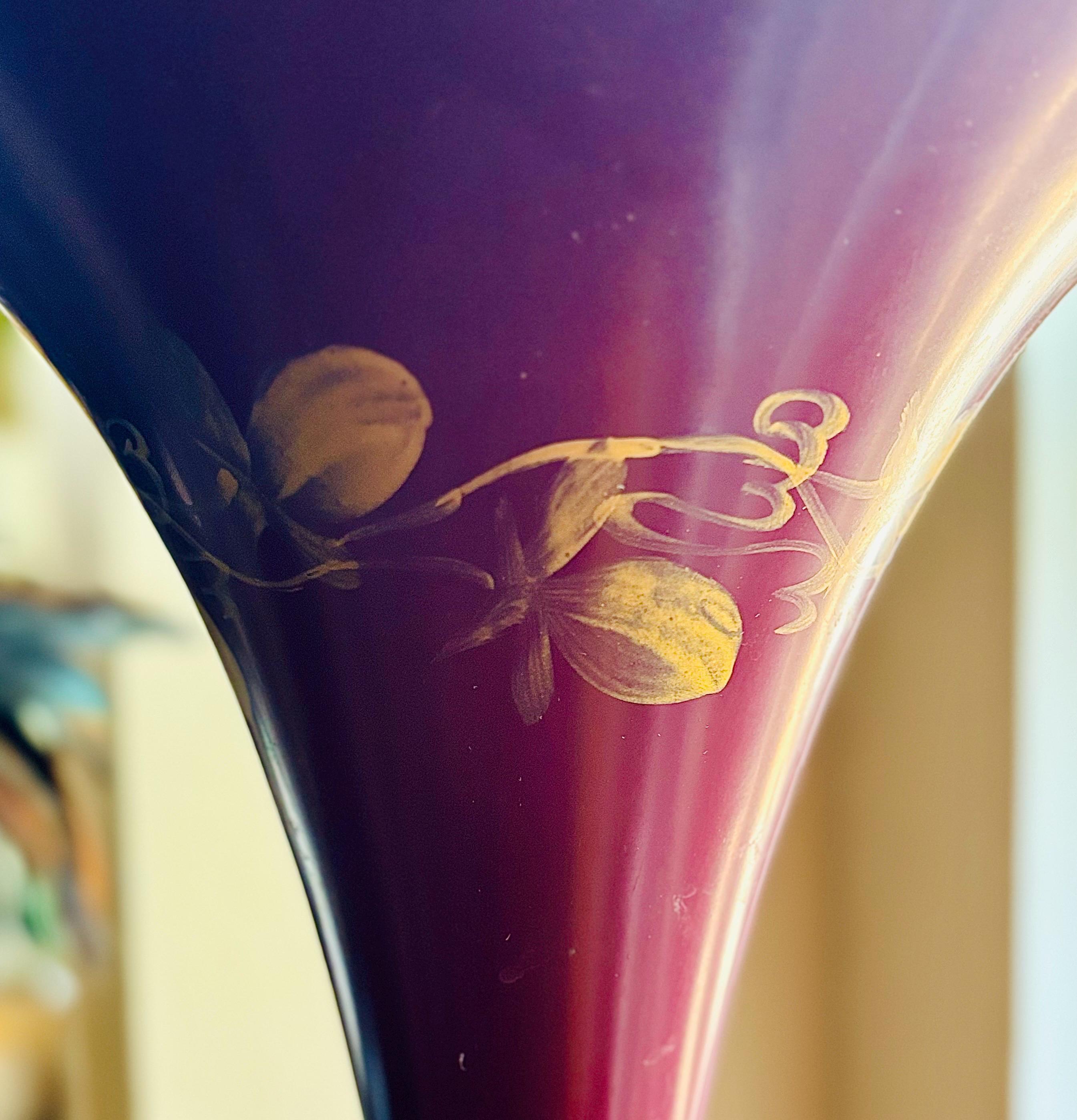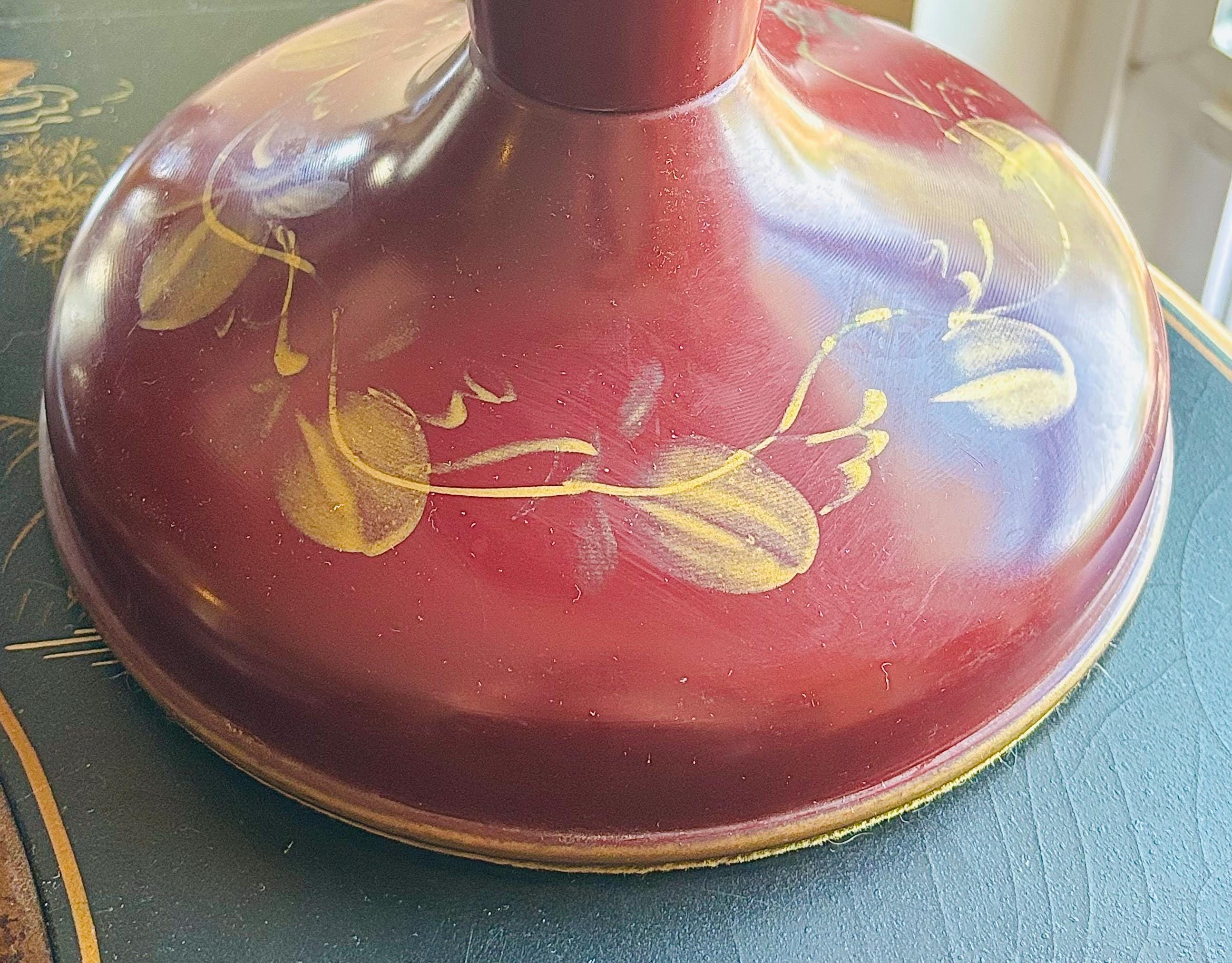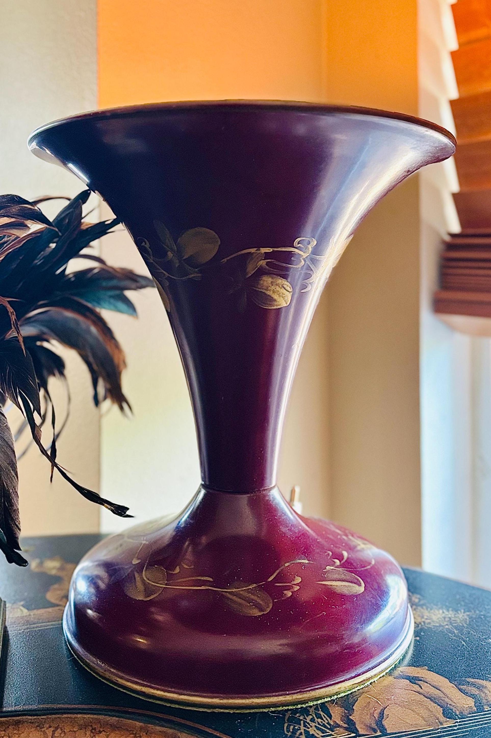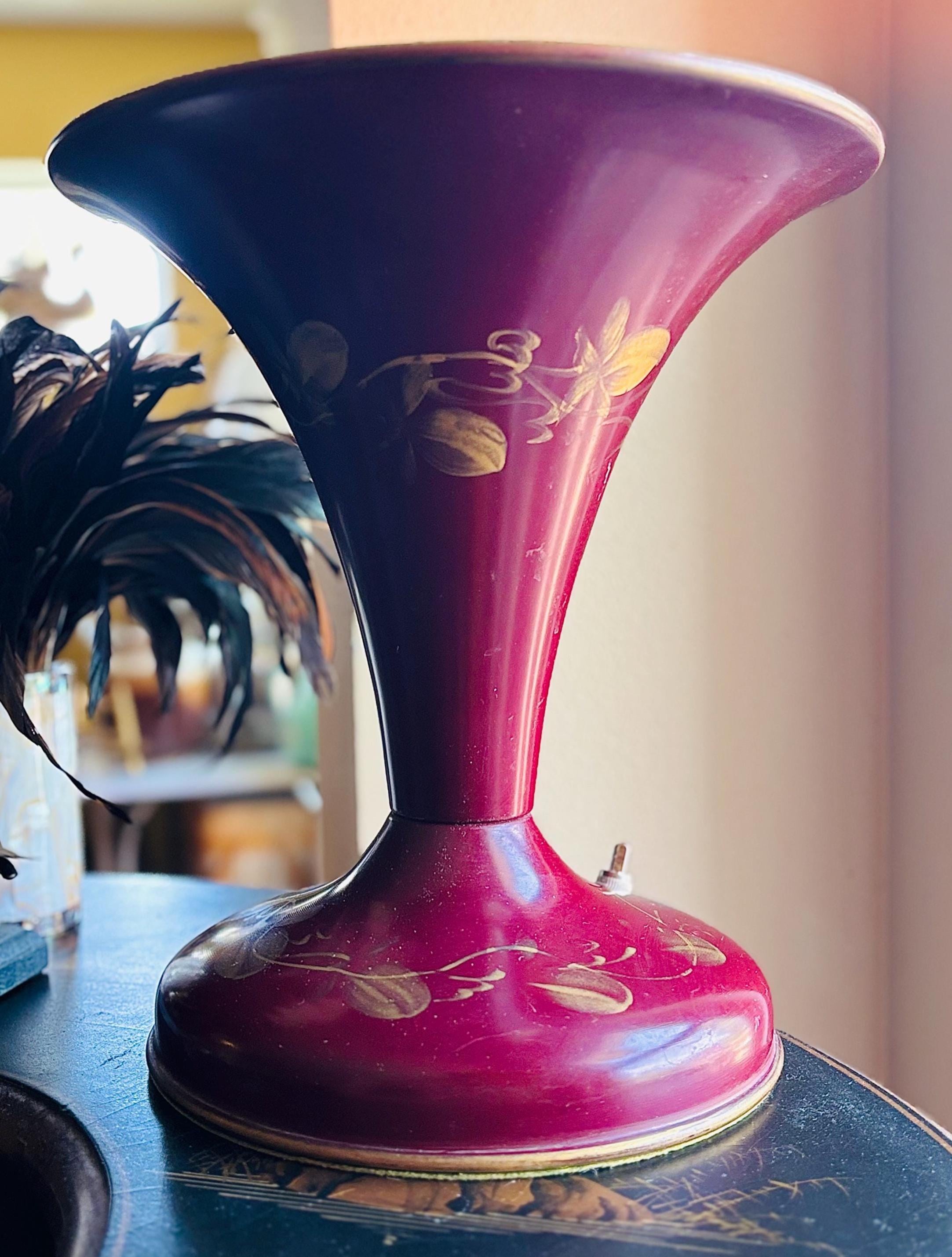 Giving into the “Dark Academia” trend, this antique Art Deco uplighter is in a hand painted moody burgundy. Surrounded with hand painted, gold gilt, flowers and vines.