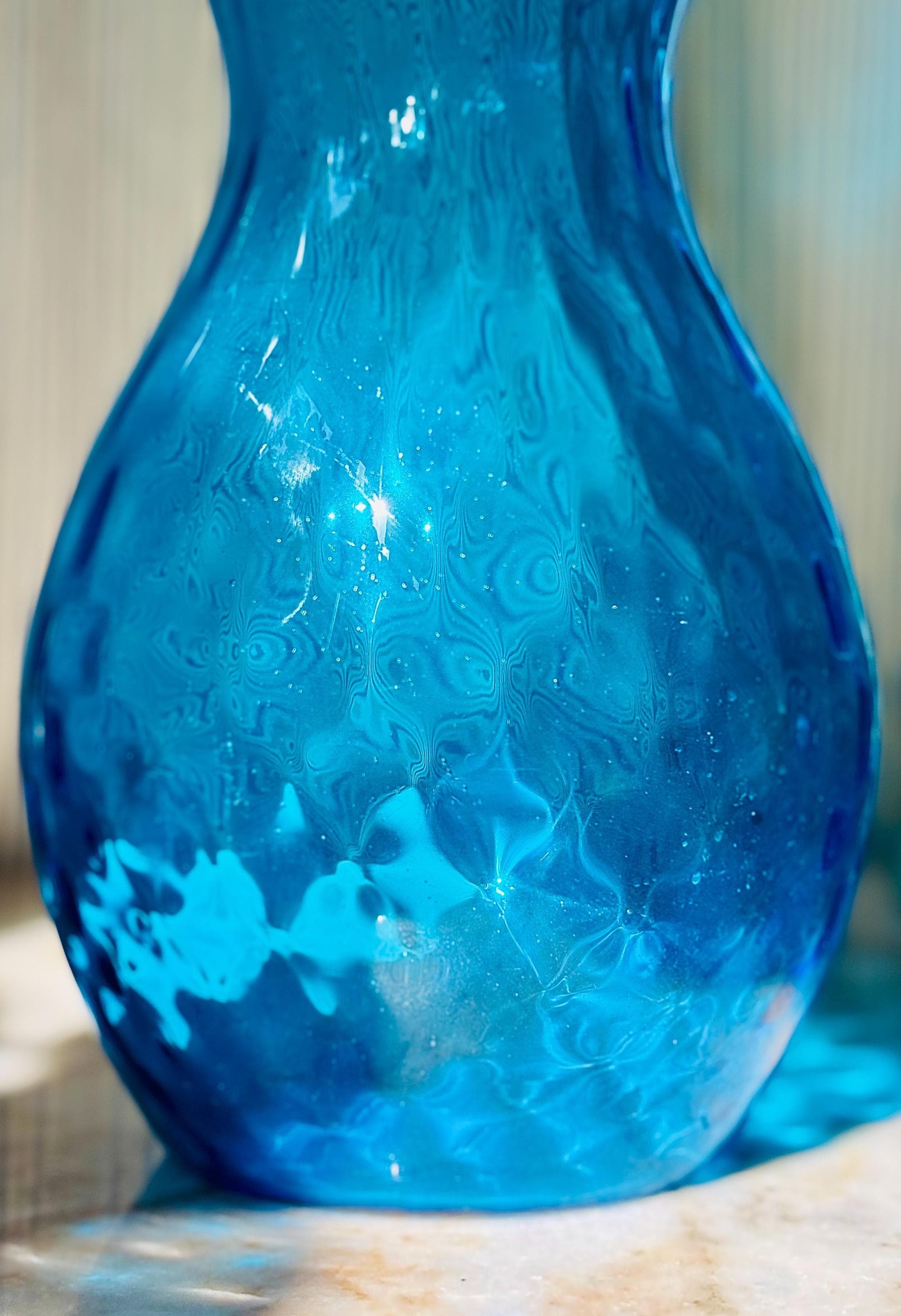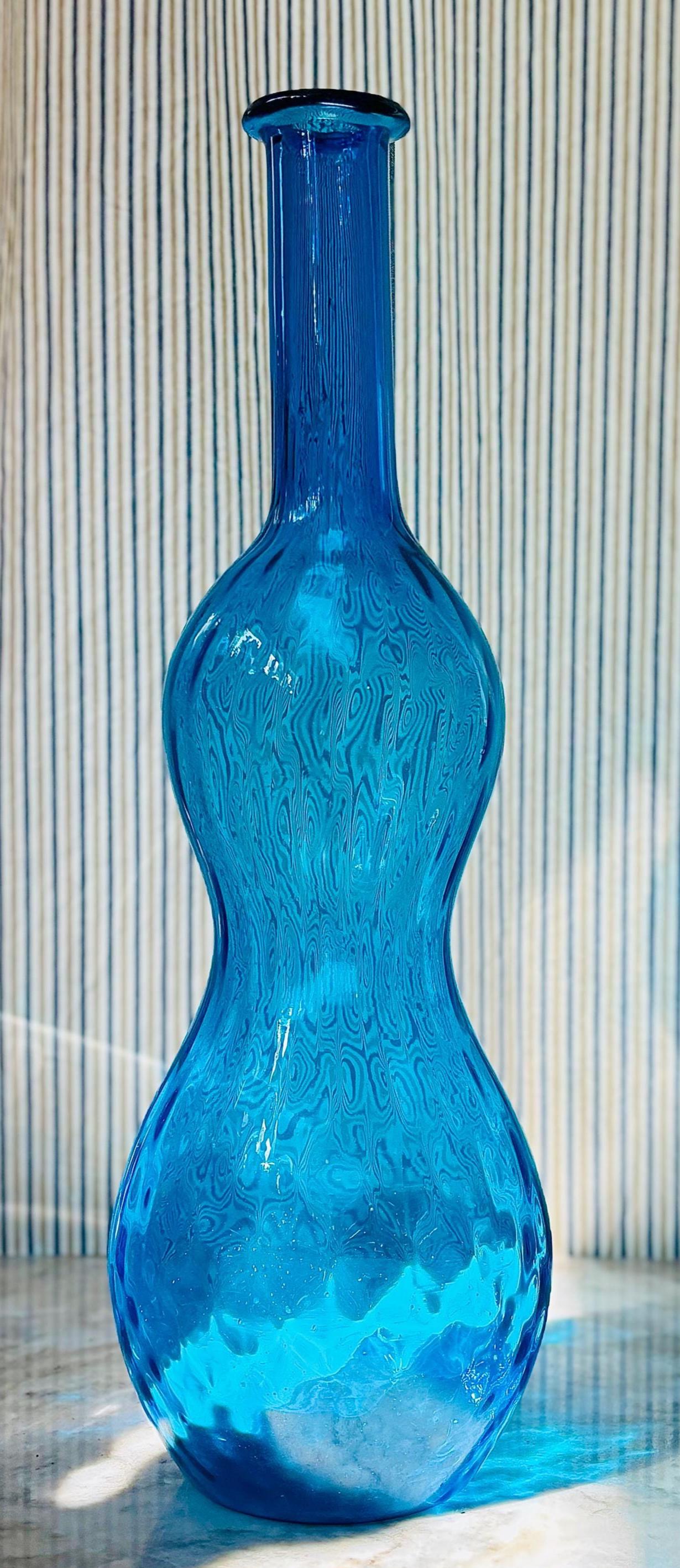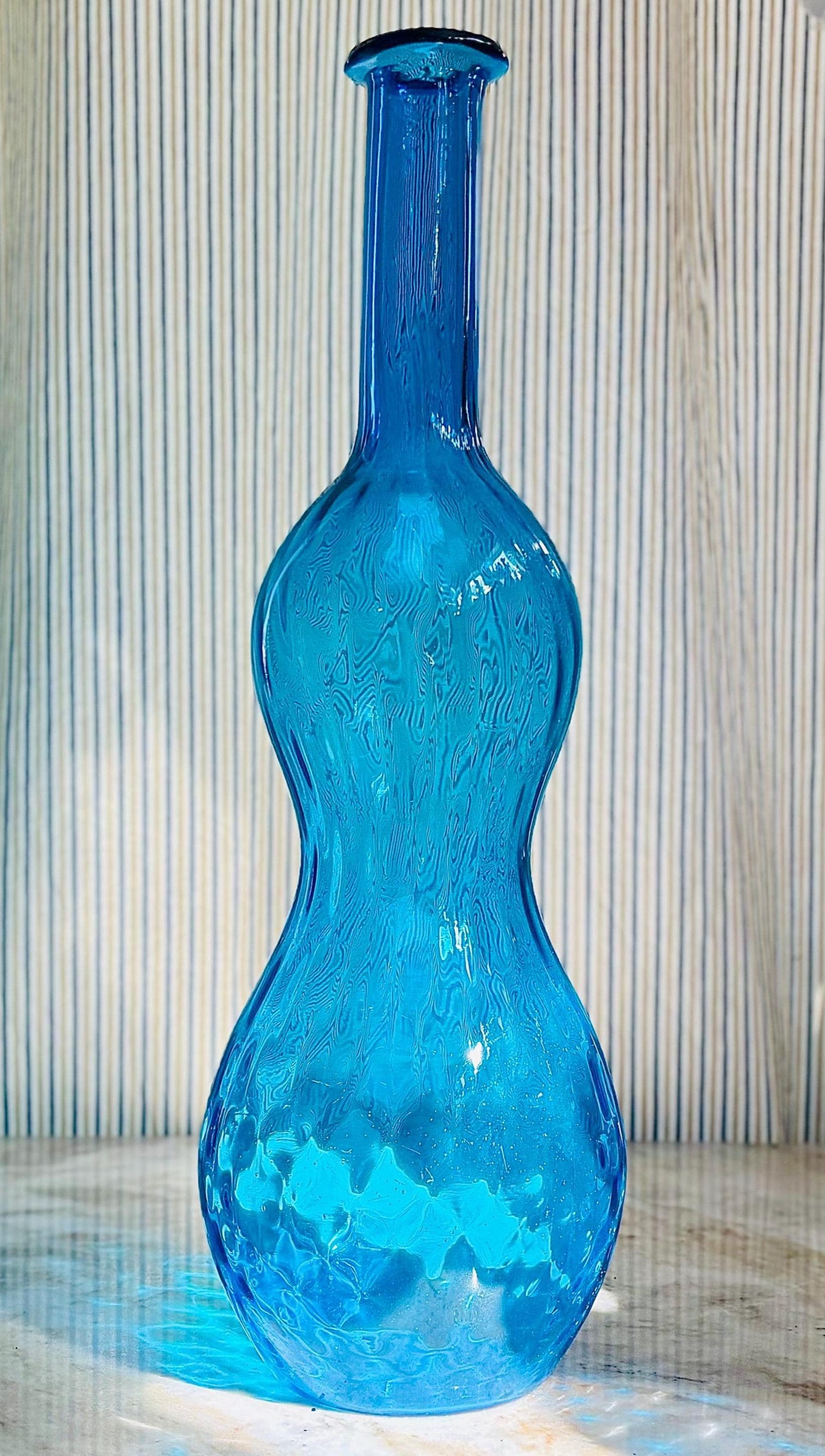 Made of handblown optic swirl glass, in a sublime teal blue…she’s a curvy “Tall Drink of Water”. Circa 1960’s, she is in pristine condition, and begs for light!