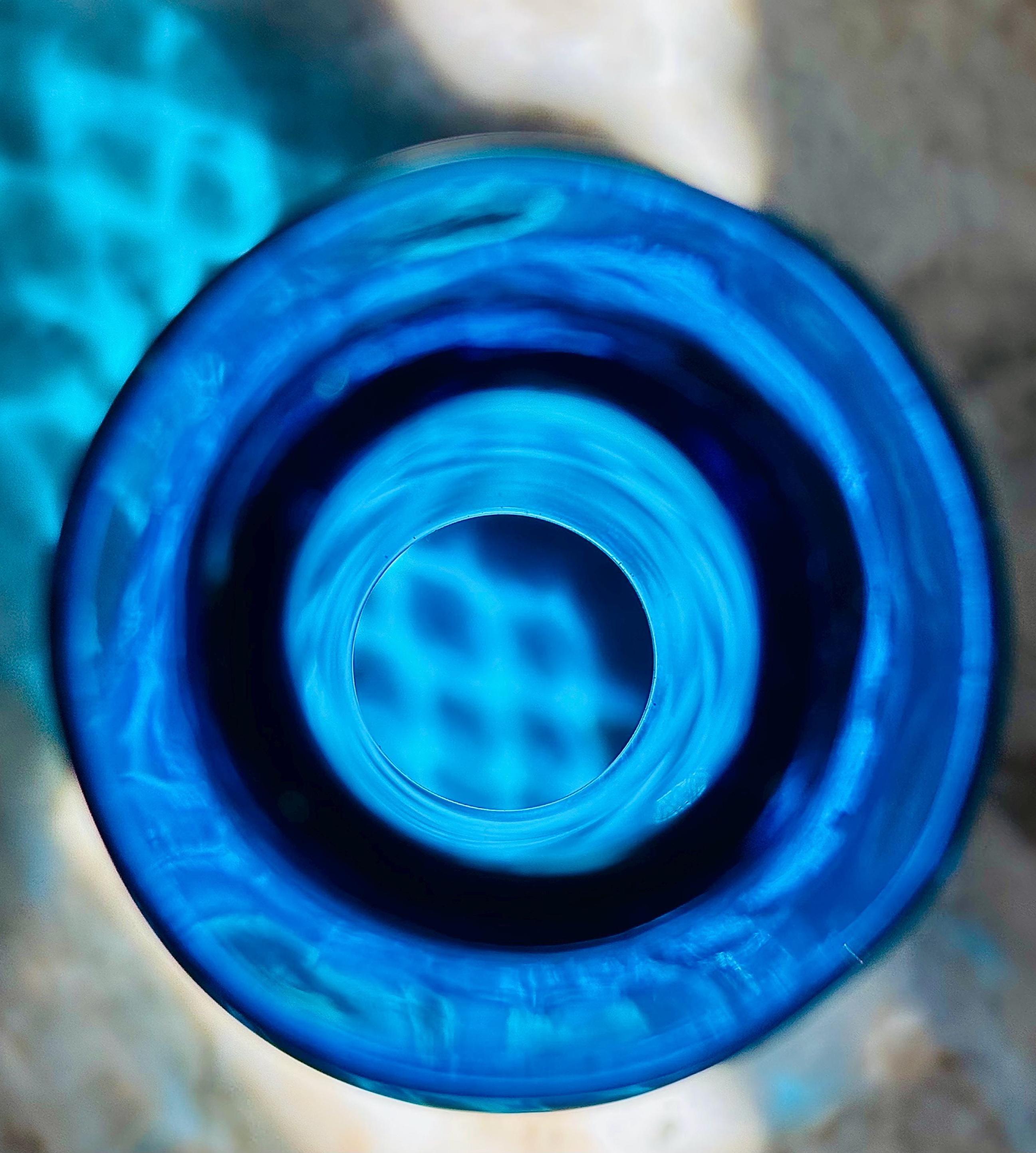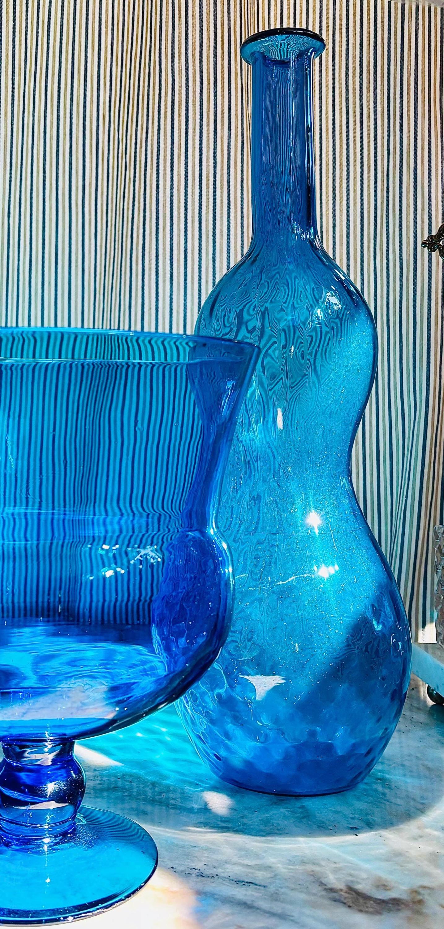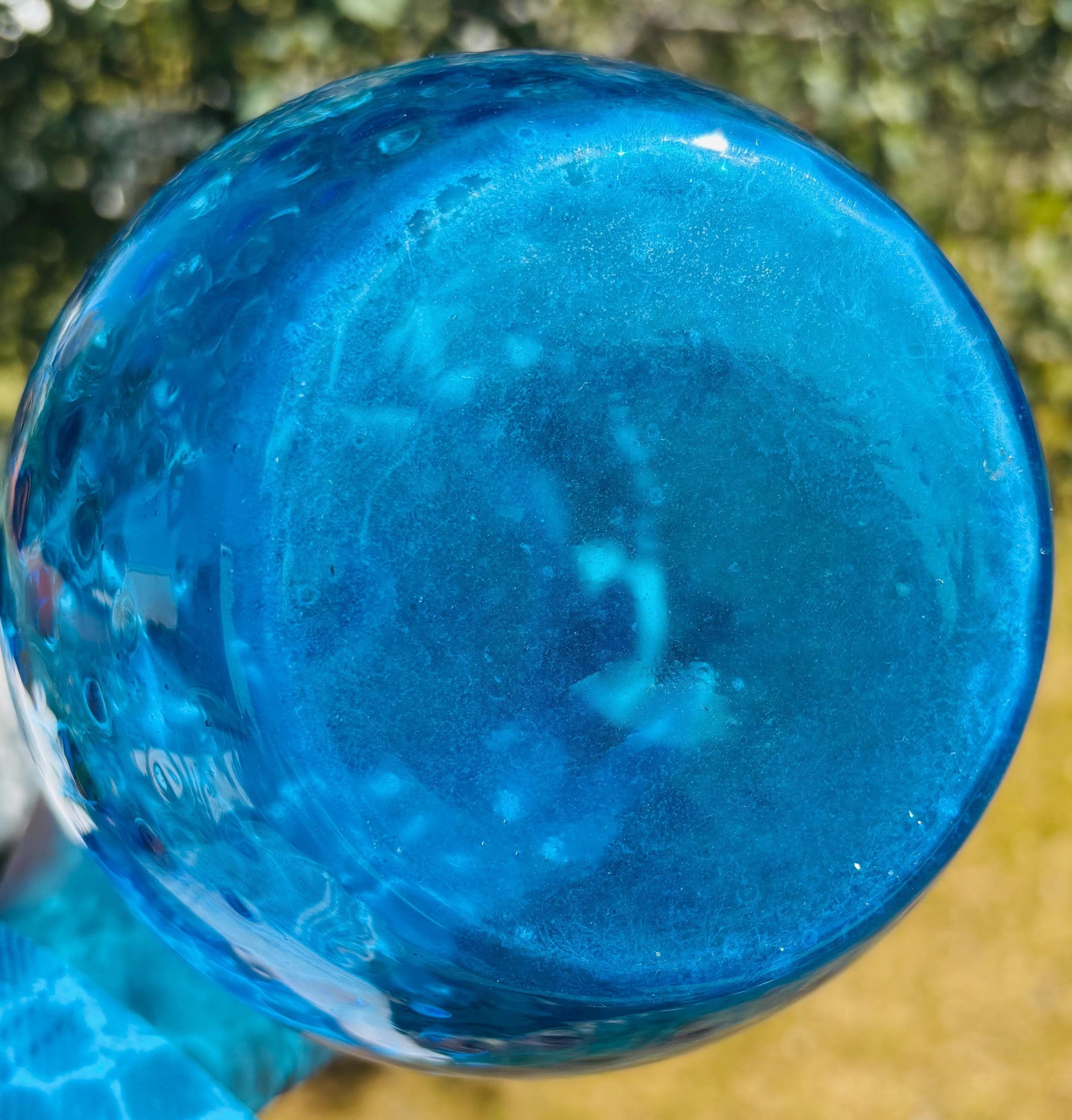 Made of handblown optic swirl glass, in a sublime teal blue…she’s a curvy “Tall Drink of Water”. Circa 1960’s, she is in pristine condition, and begs for light!