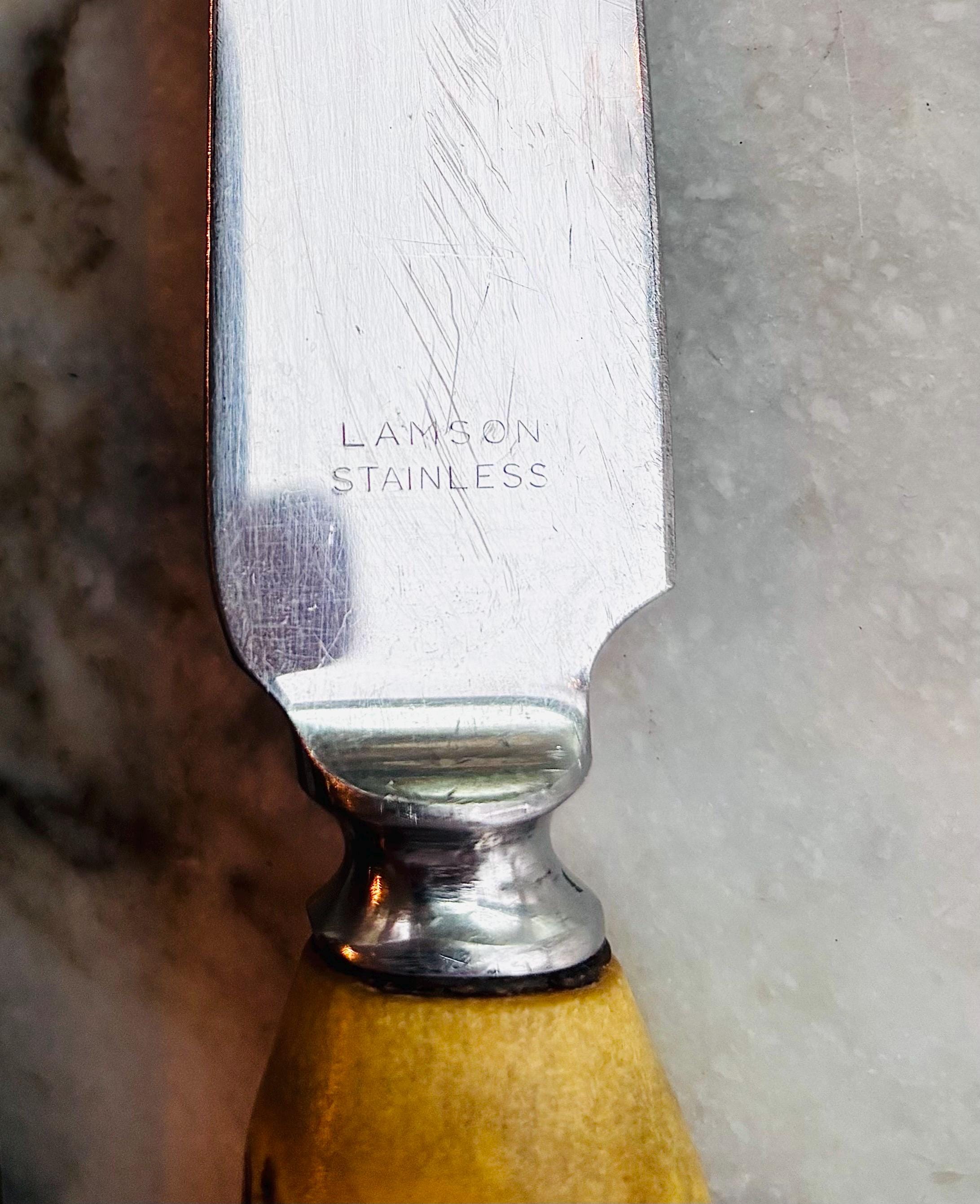 This gorgeous rustic set, is by Peeredge Knives of Sheffield, England and Lamson Knives of Massachusetts. All made of genuine Staghorn, with nickel ferrule and bottom buttons, and stainless steel blades.