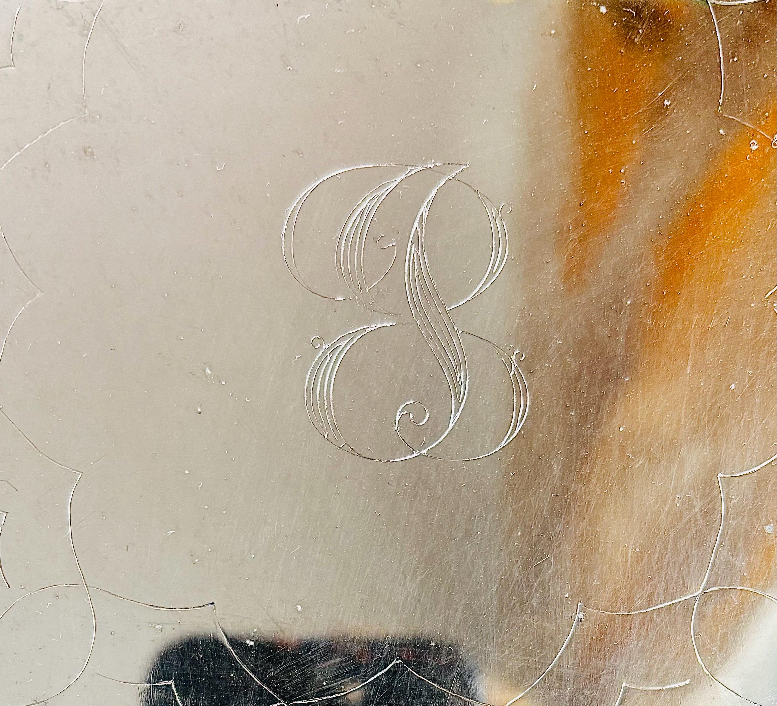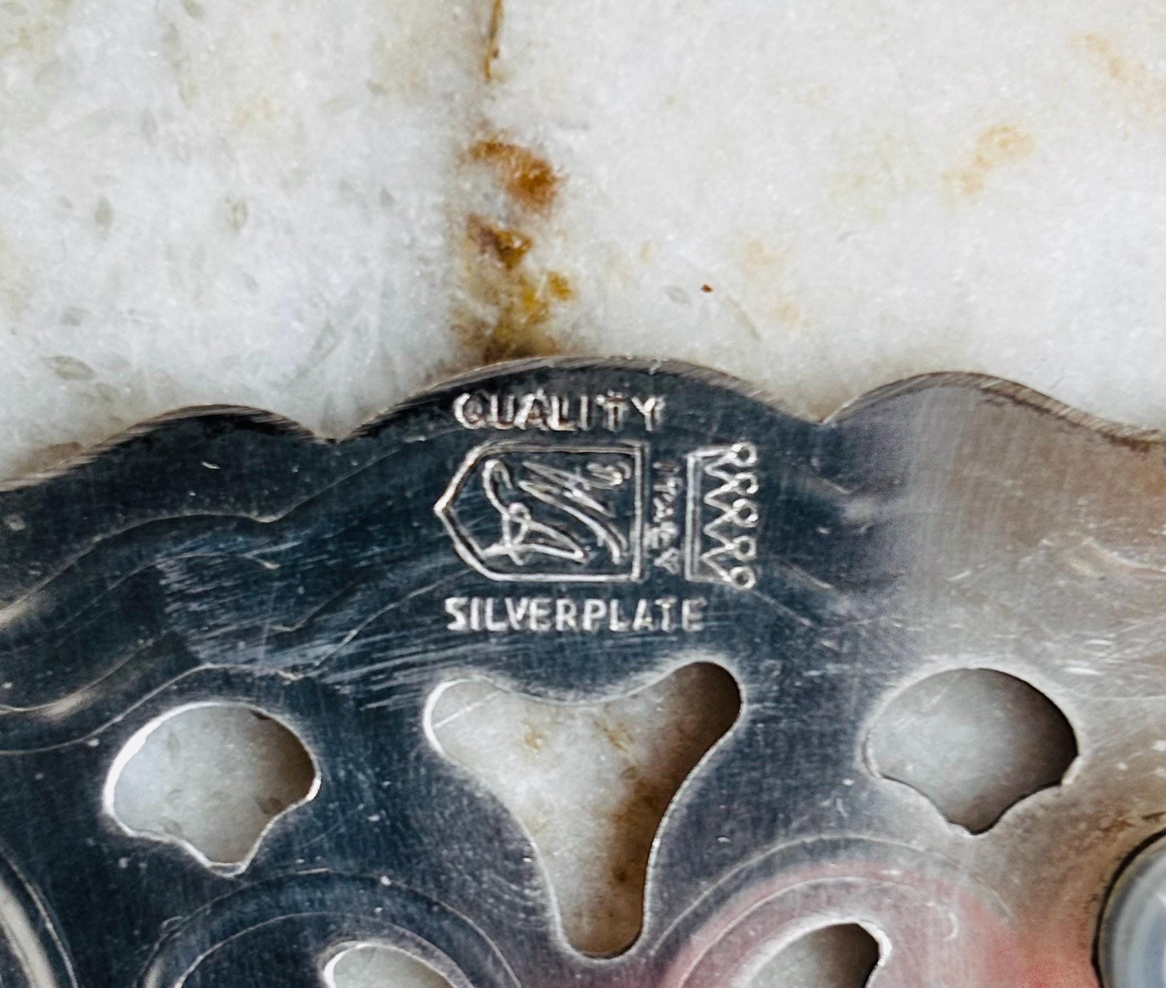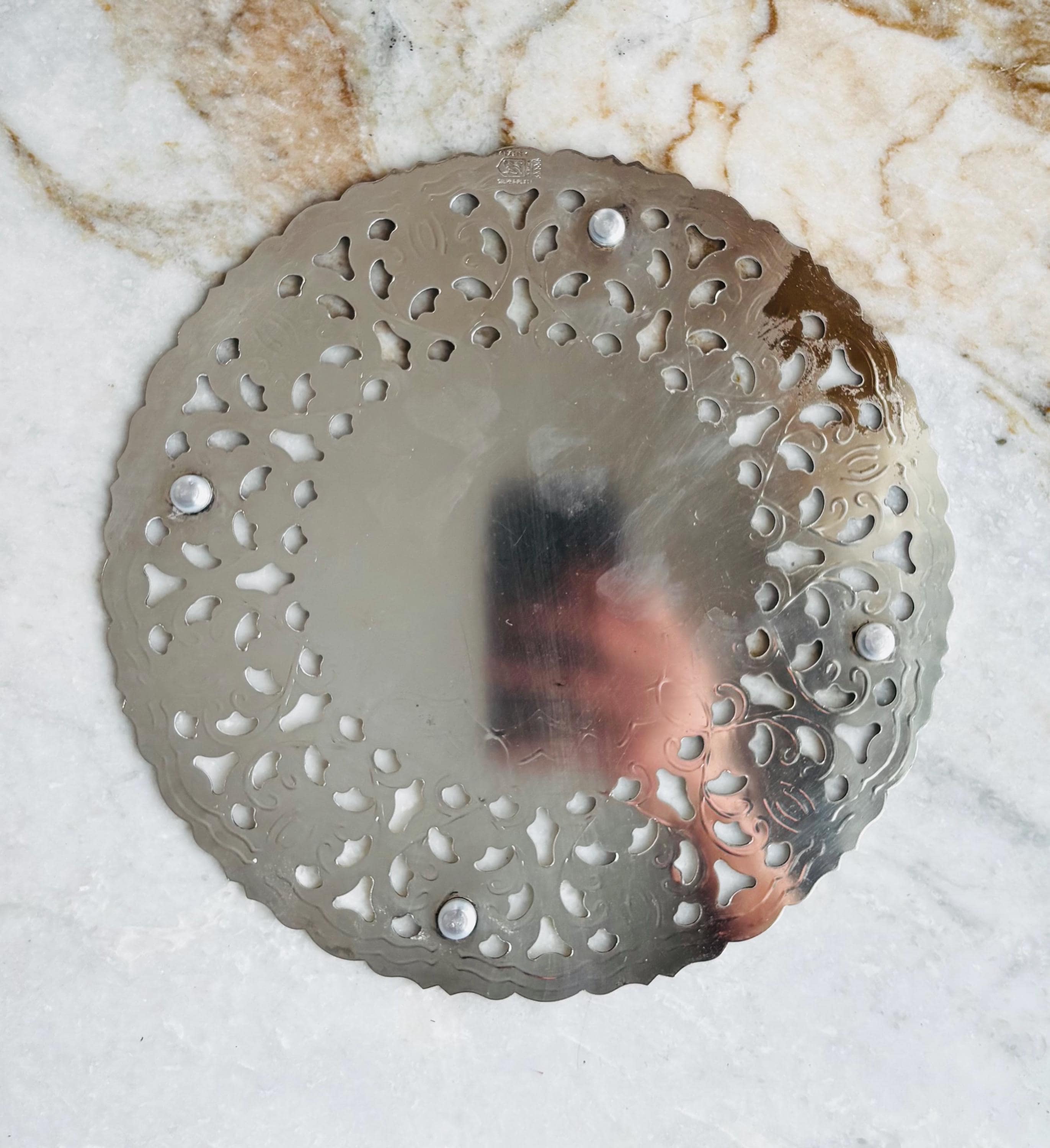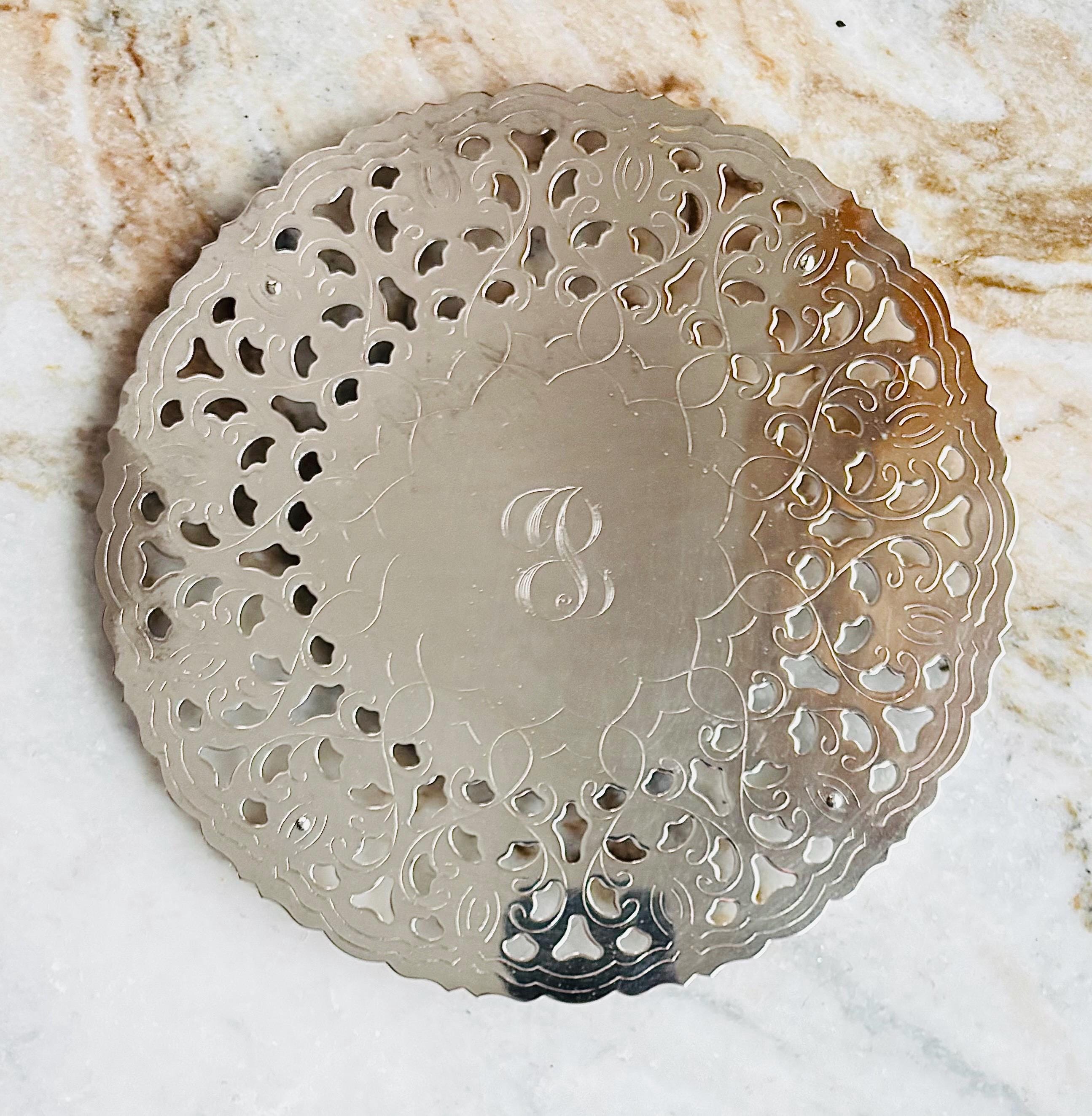 Stunning vintage silver plated monogrammed trivet. In a generous size of 9"W, she is made by William Adams, Italy. In an exquisite ornate reticulated design, with beautiful details, and 4 silver button feet.