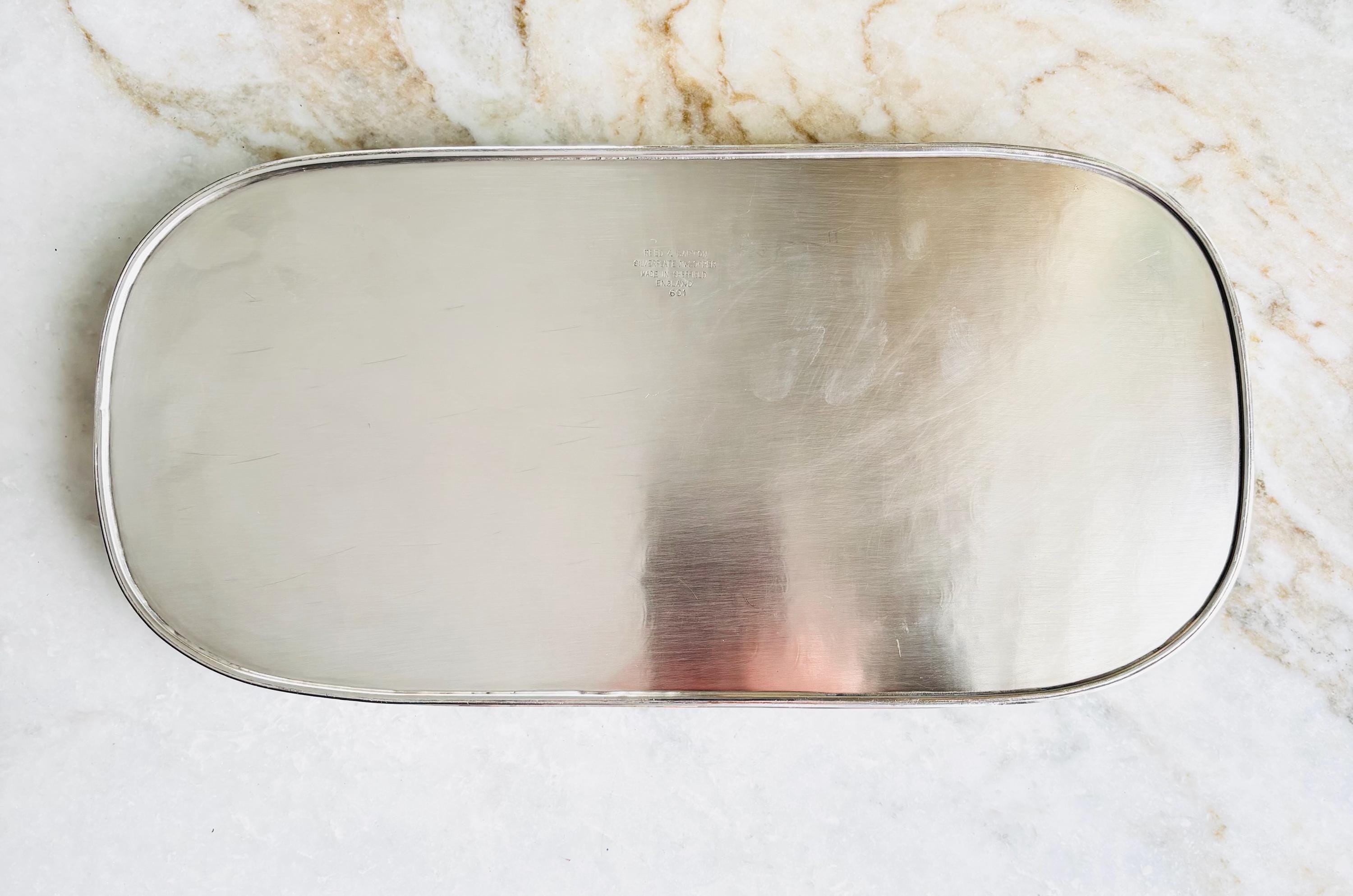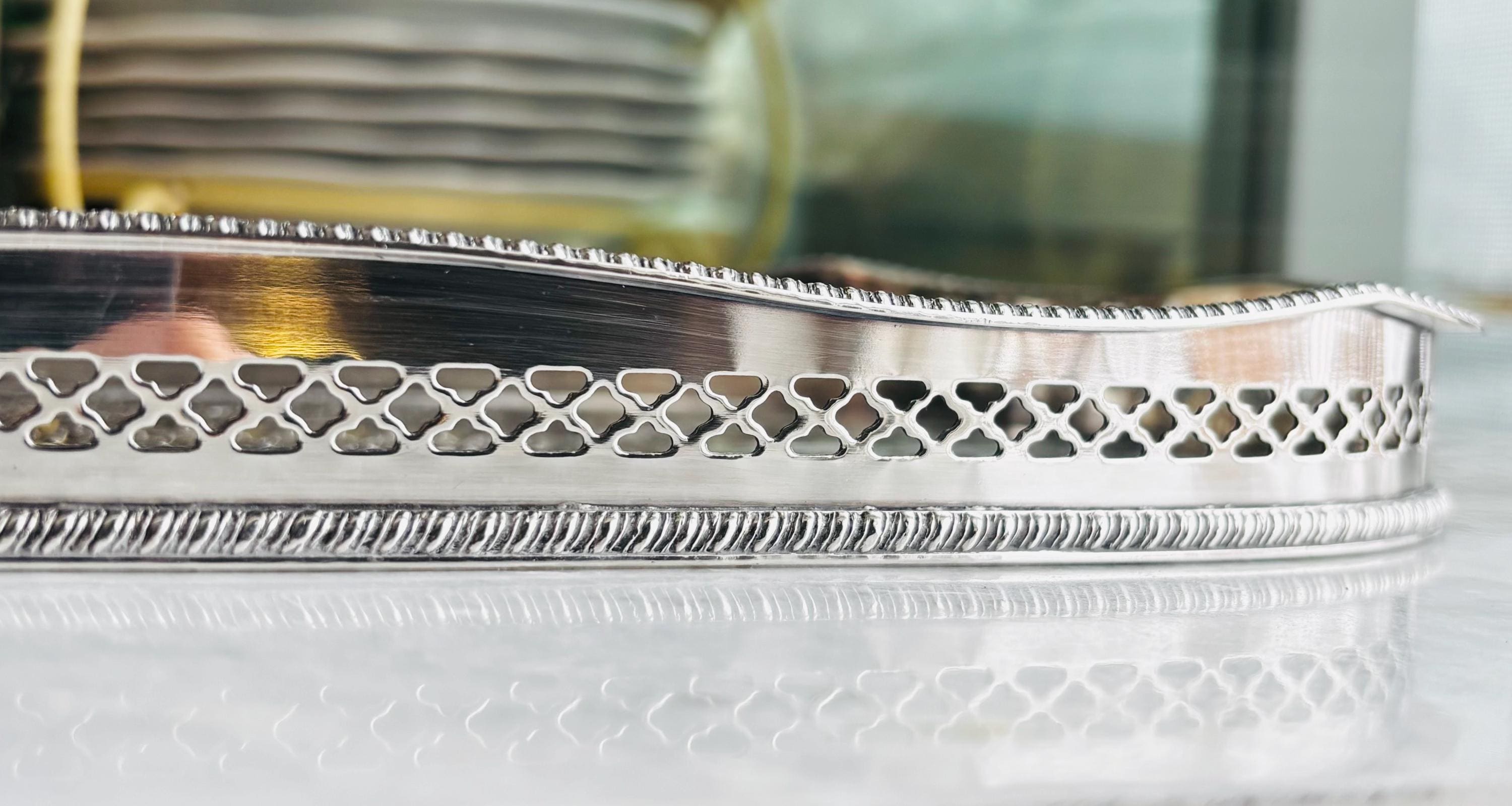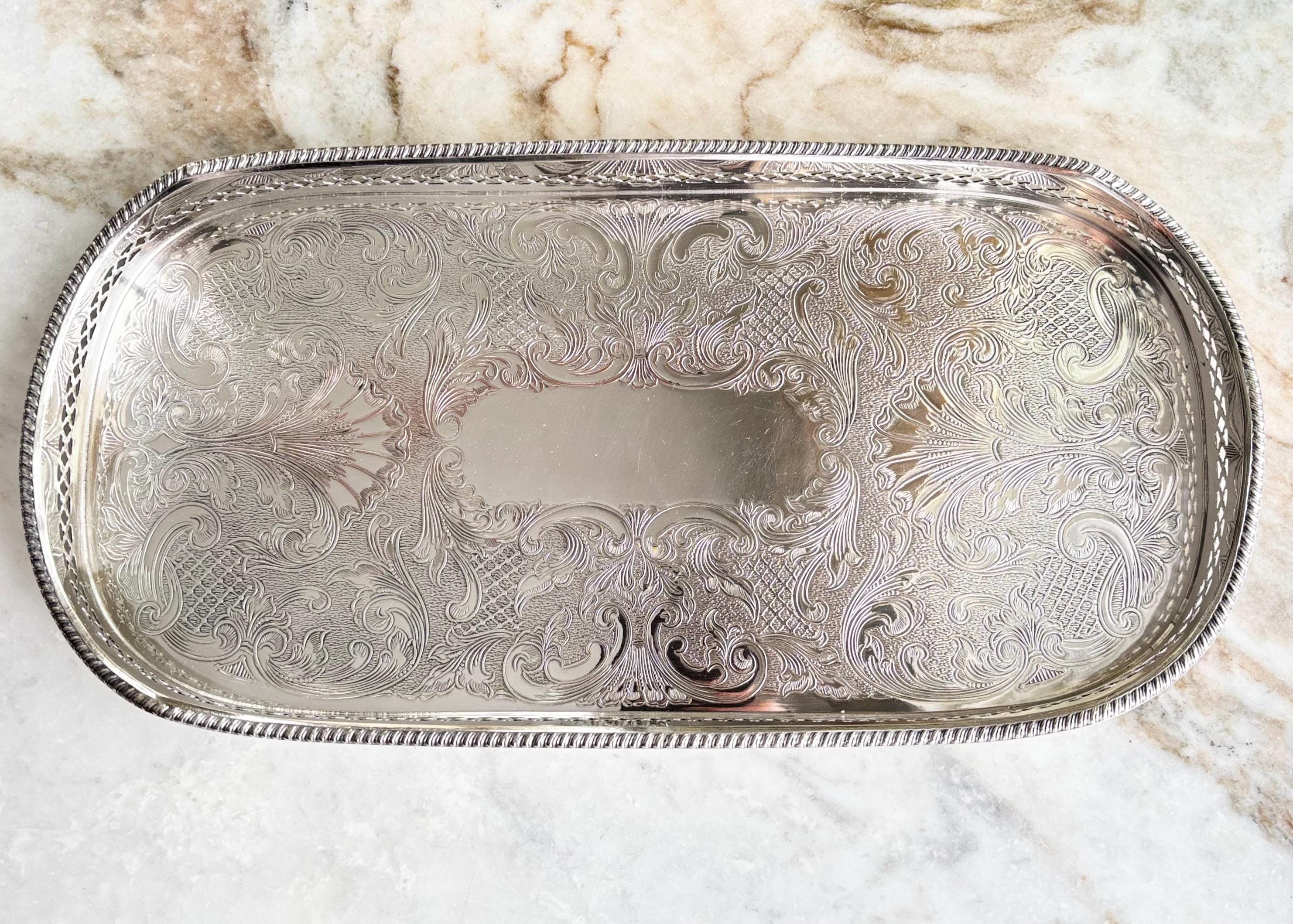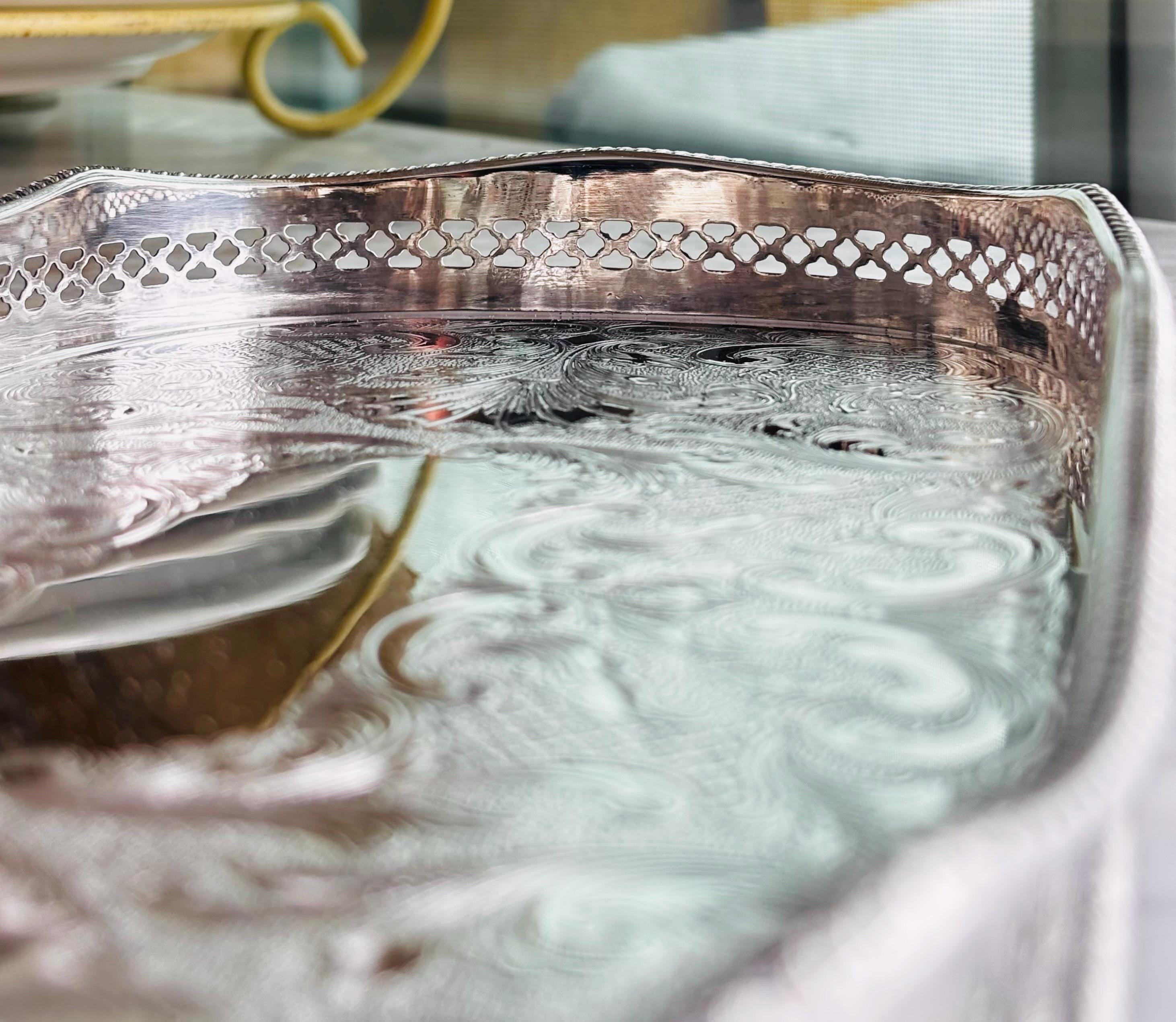 Circa 1930's, this gorgeous tray features elaborate scrollwork engraving on the surface, and a gadroon roped swooping border, with ornate reticulated pierced sides.