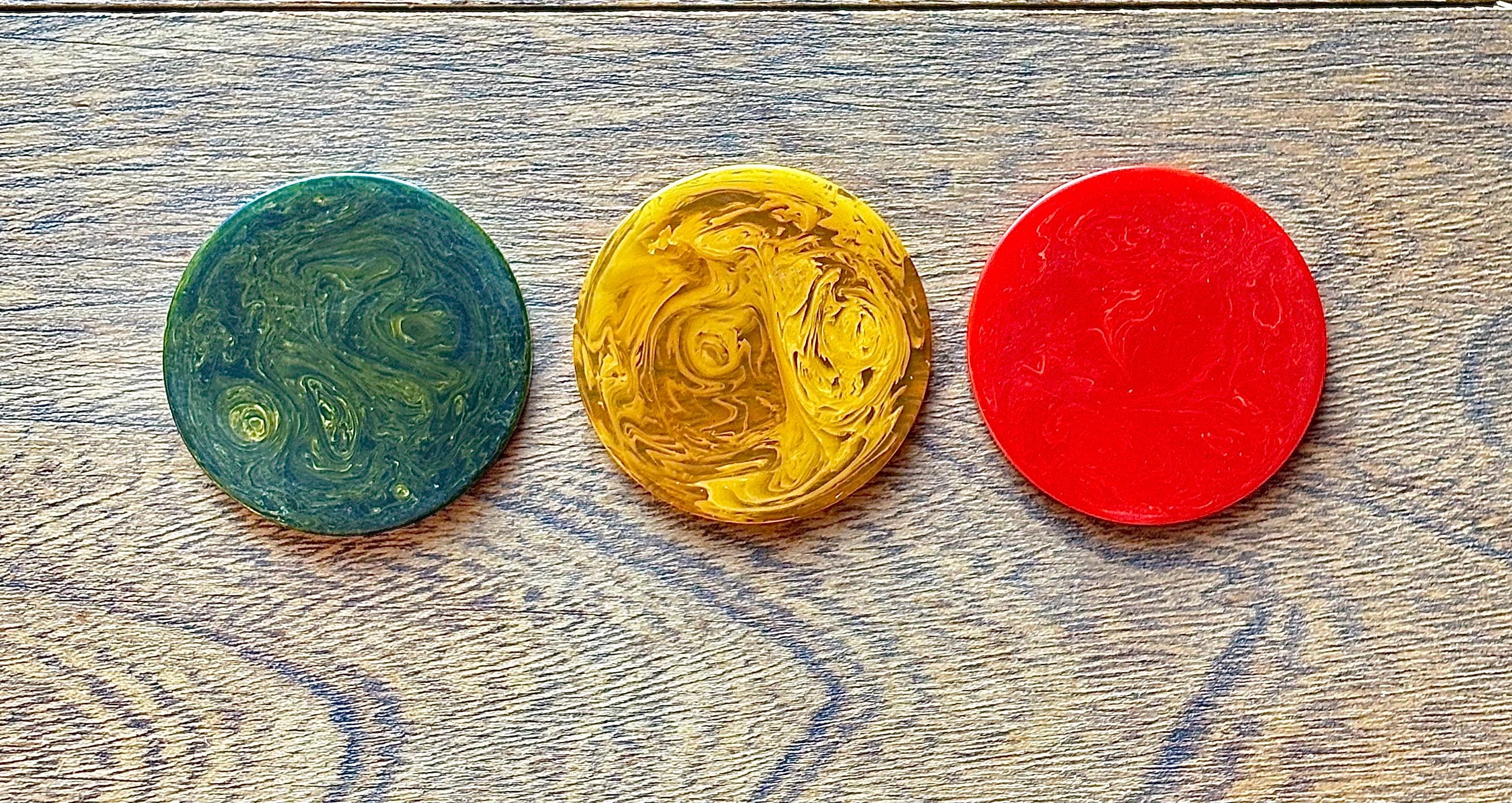 "Catalin" deemed "The Gem of Modern Industry", Circa 1920's-1930's, this set contains 137 Swirled Butterscotch or Apple Juice chips, 75 Red Mottled, and 75 Emerald Green Chips.