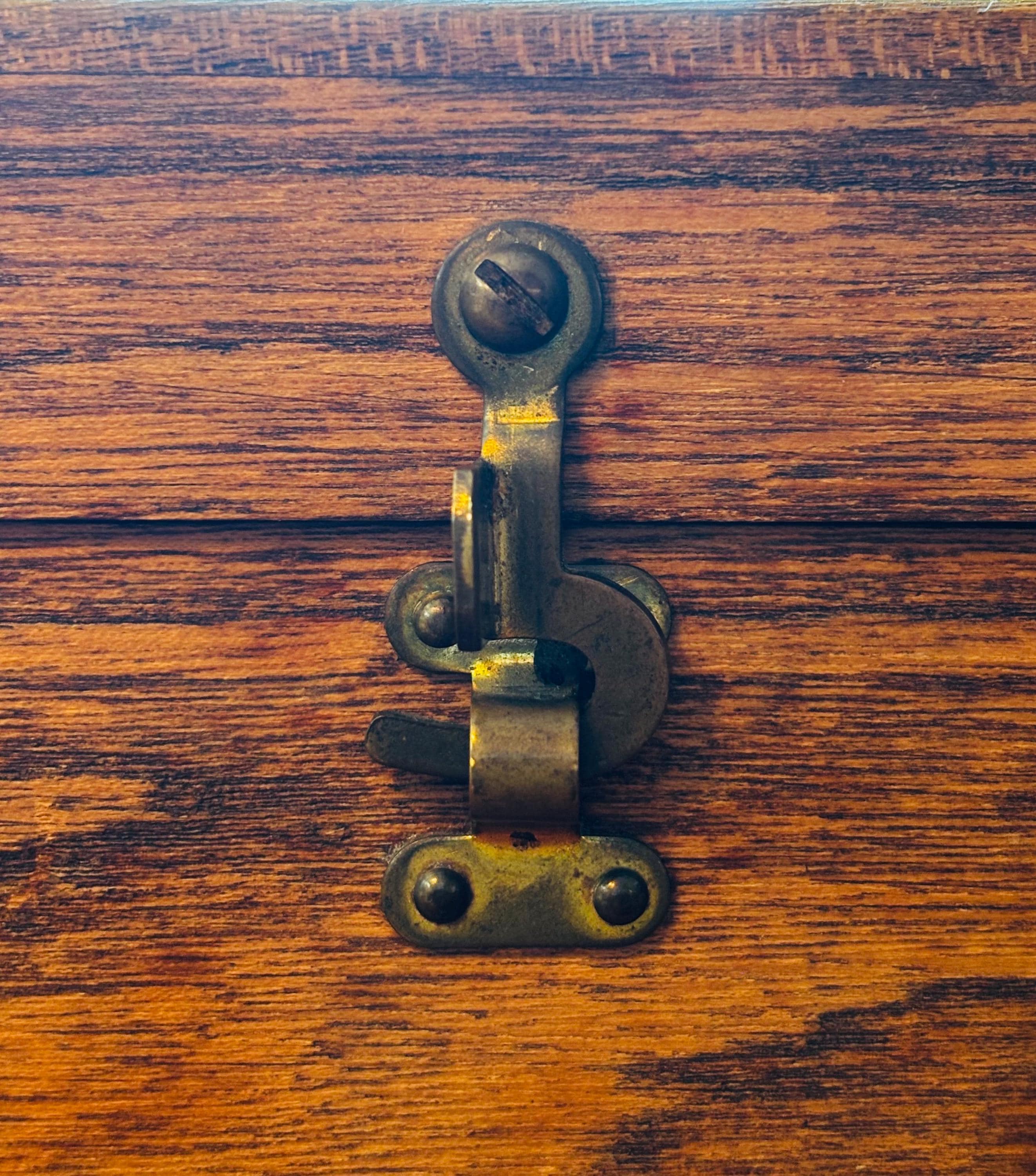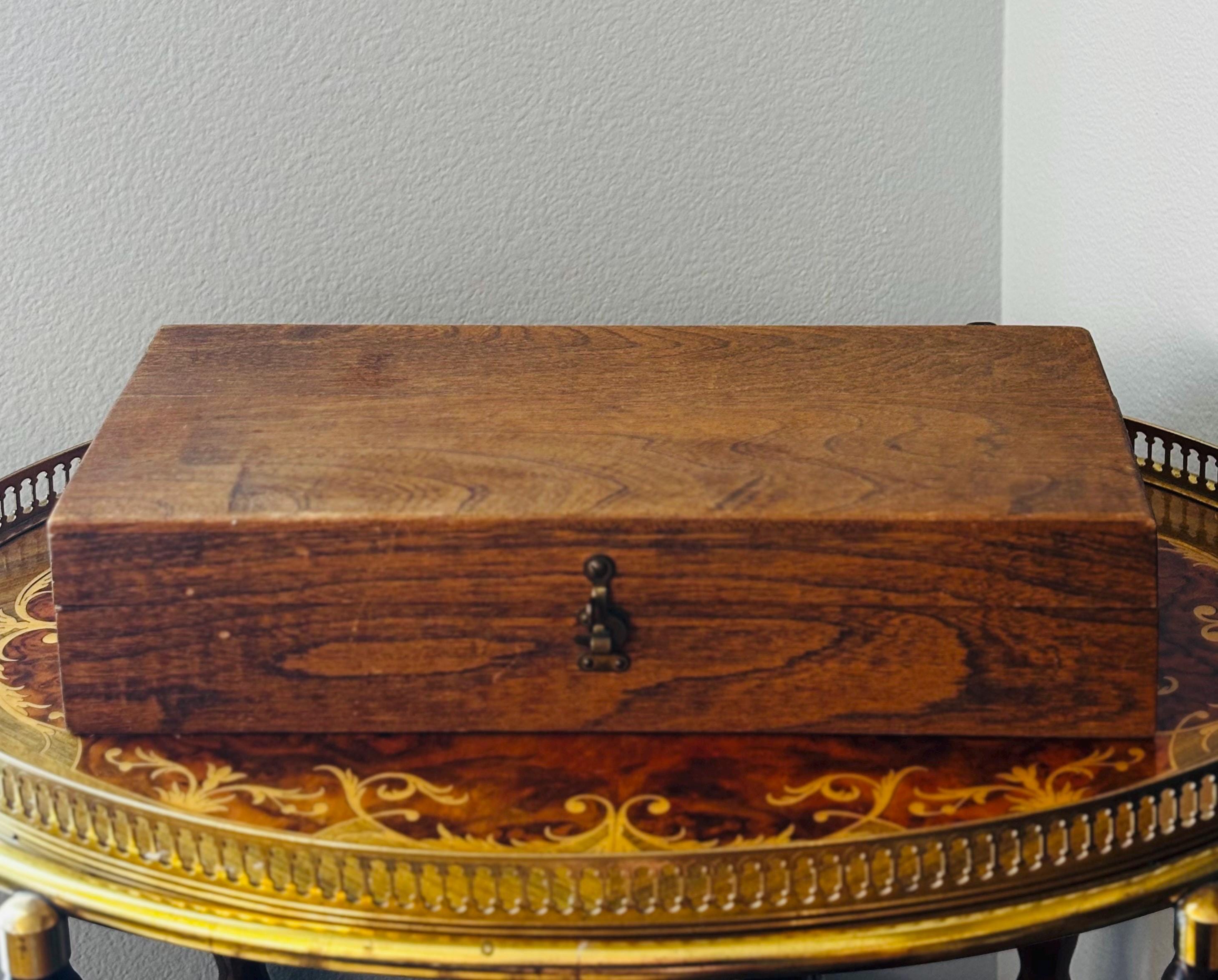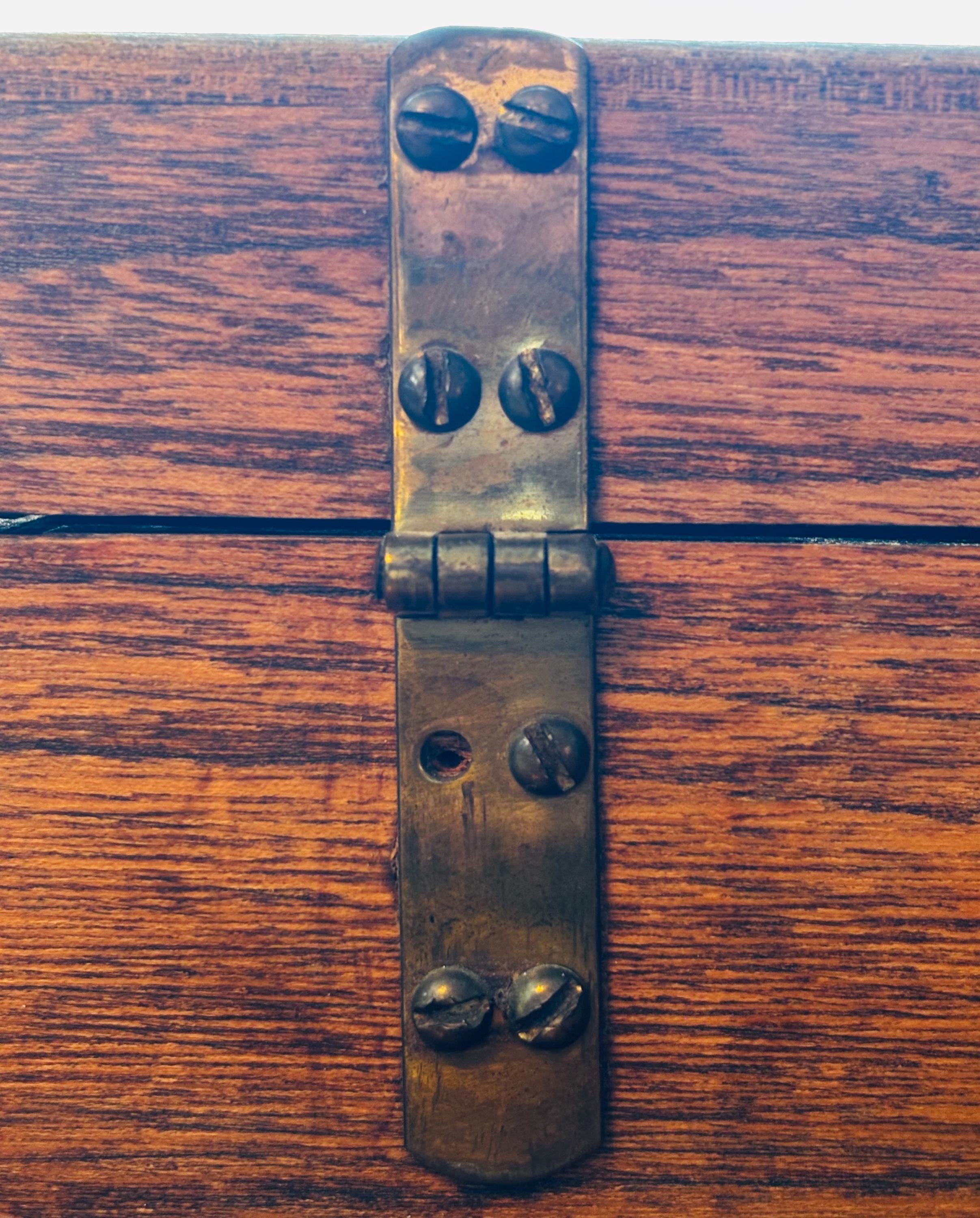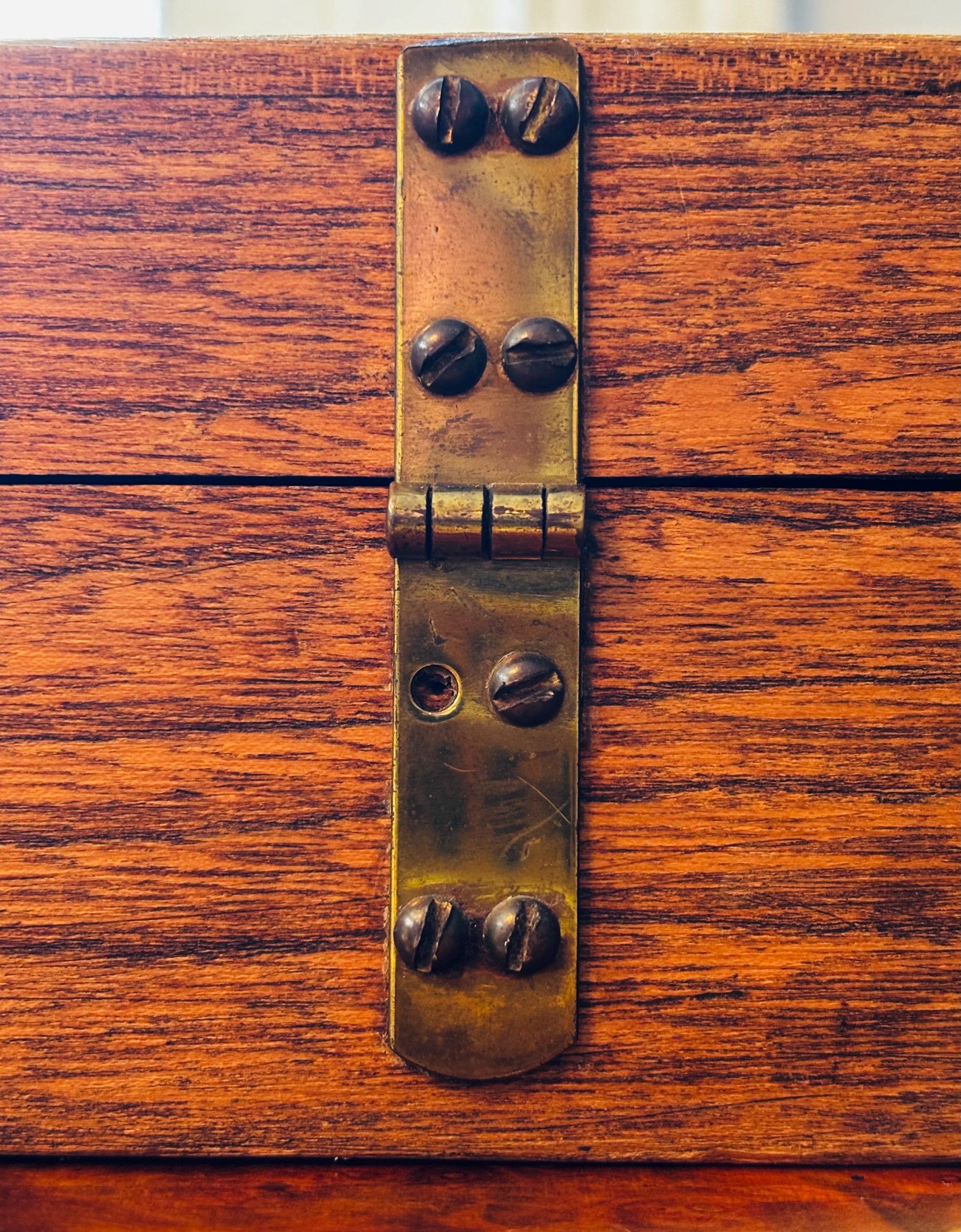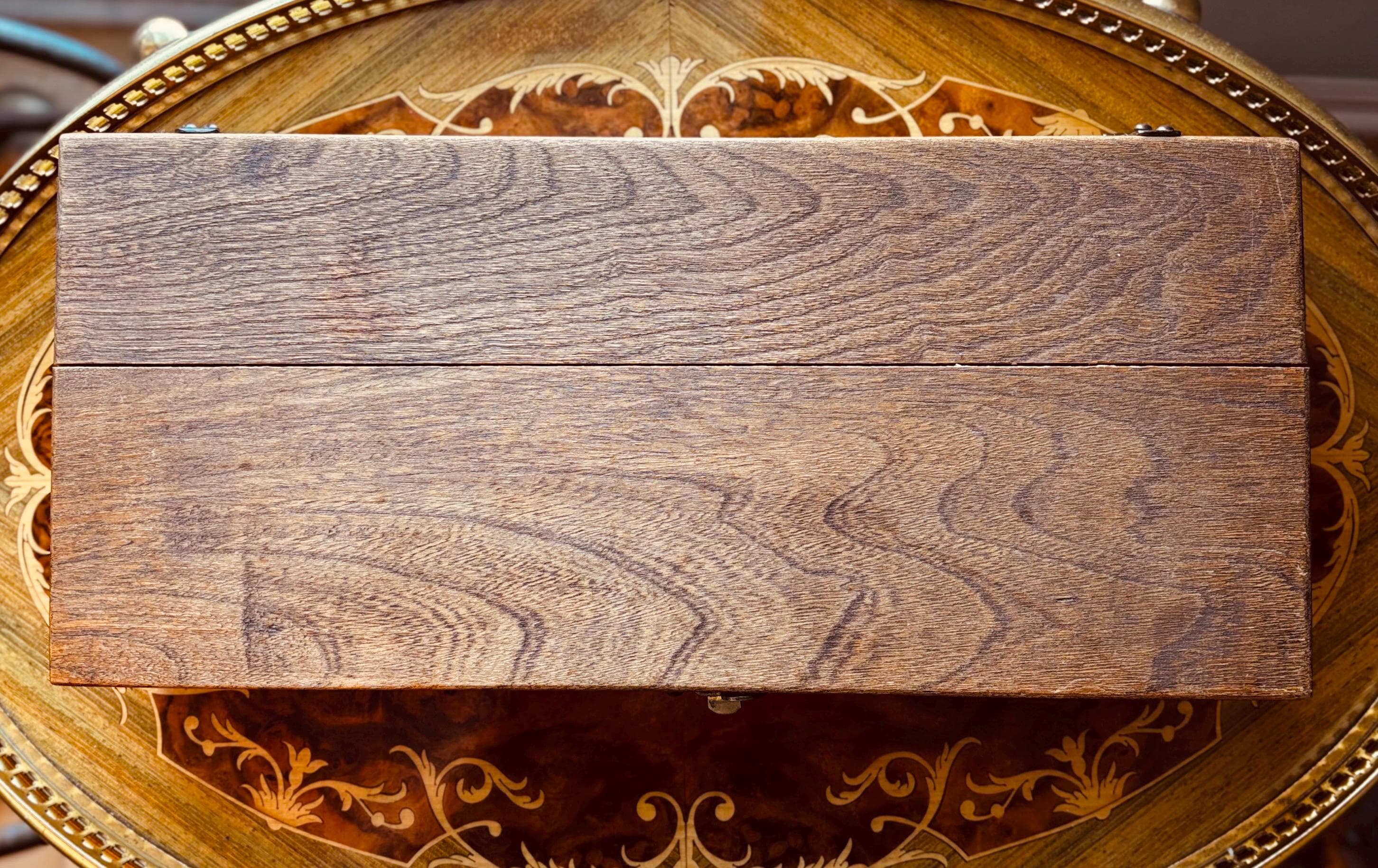 In beautiful condition, minimal wear noted. Original box is believed to be Walnut, with original brass toggle closure and hinges. Linear split on top noted, and shown.