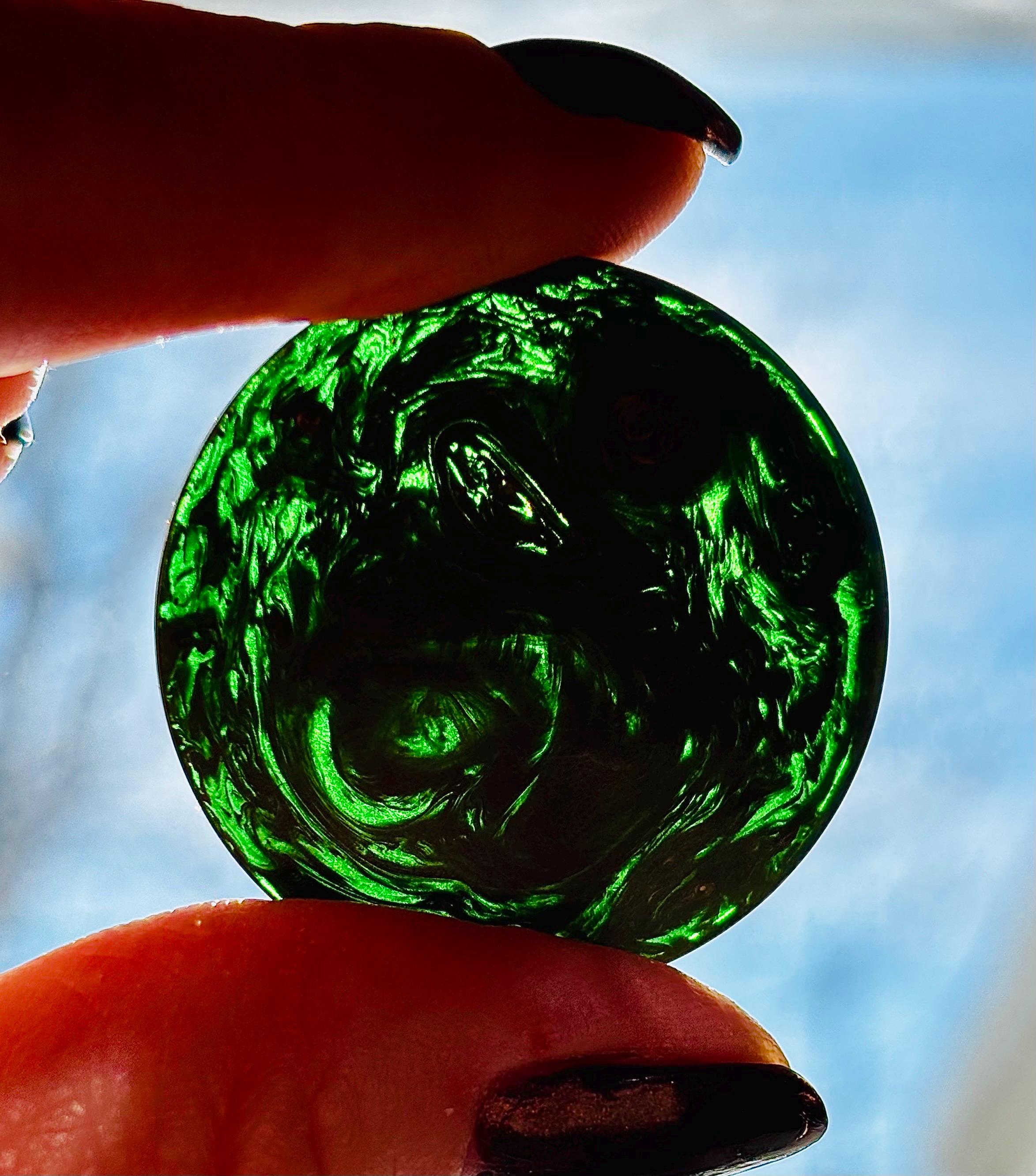 "Catalin" was used in jewelry, and other goods. Widely collectible today, for its gem like colors, translucency, and its Art Deco marbled design.