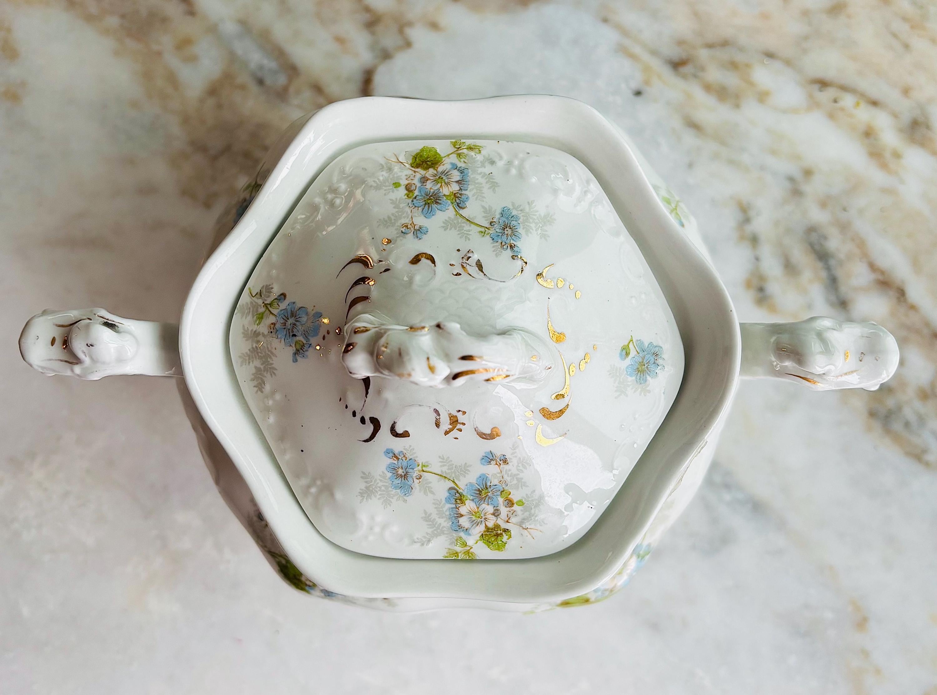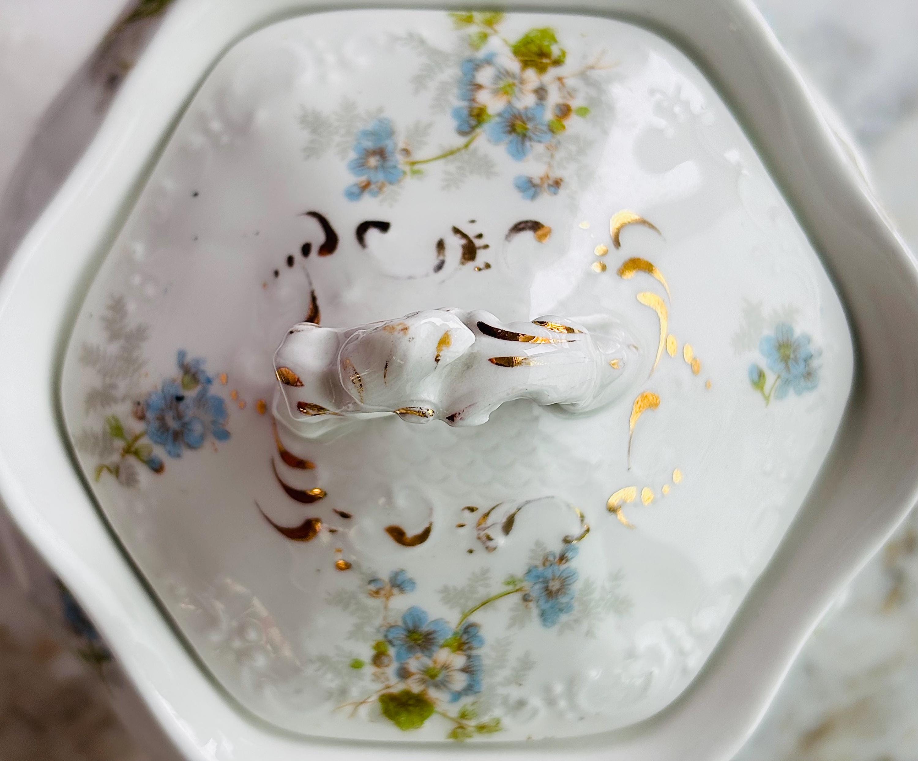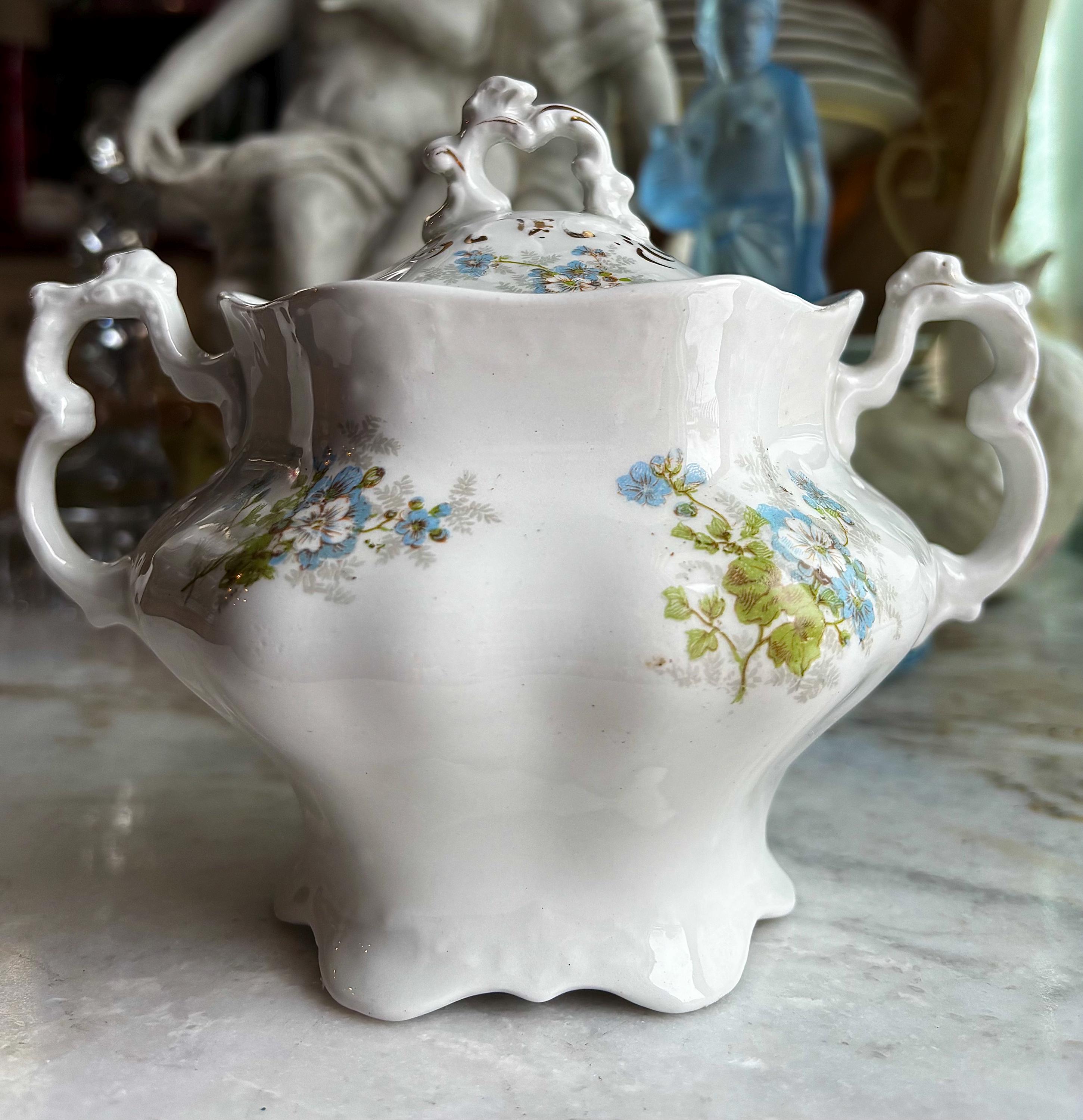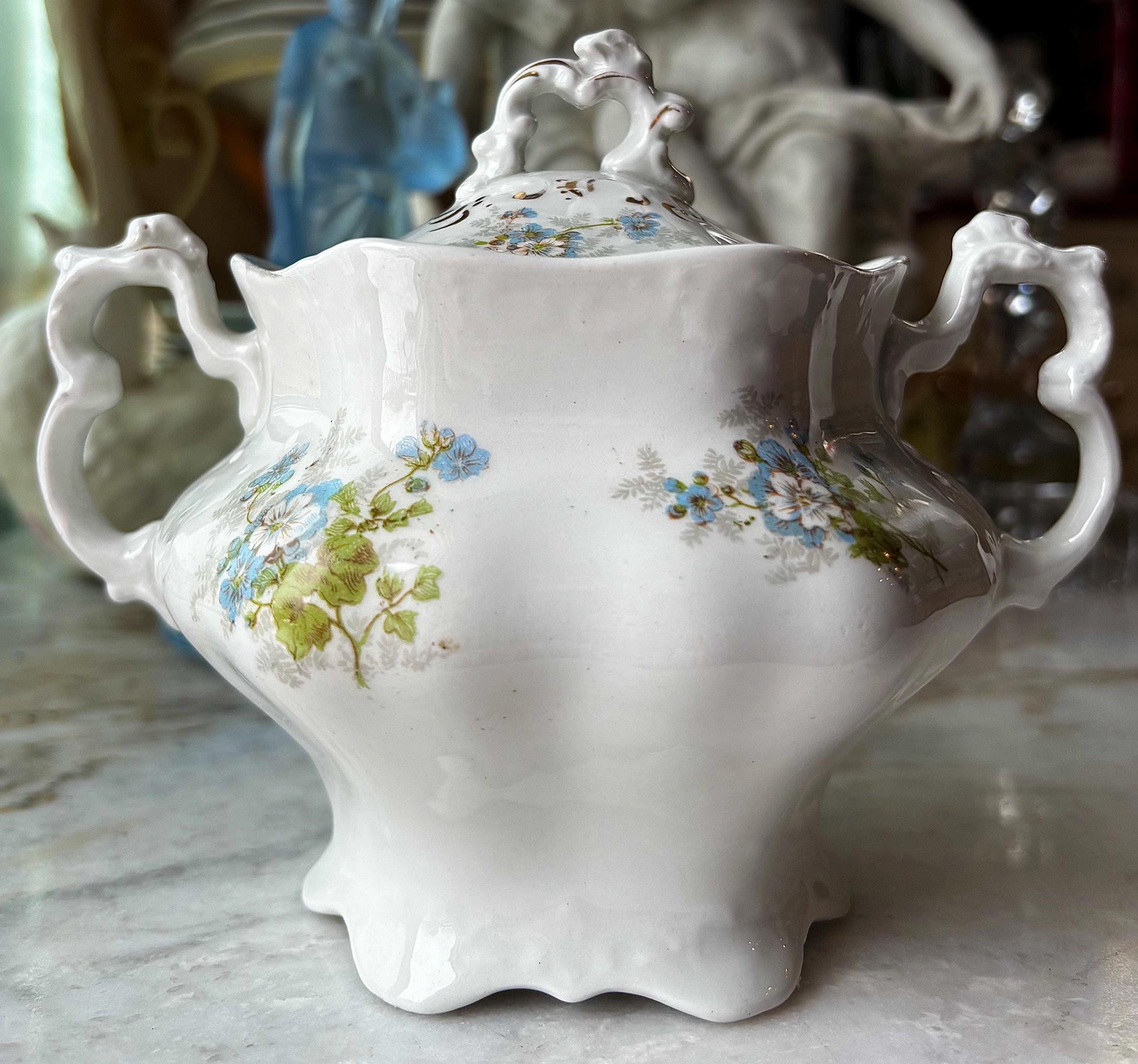 Circa 1920's, this highly ornate sugar bowl, has hand painted baby blue & white flowers, with green leaves trailing and rambling throughout. Highly embossed details of fish scales on lid and scrolling details everywhere!