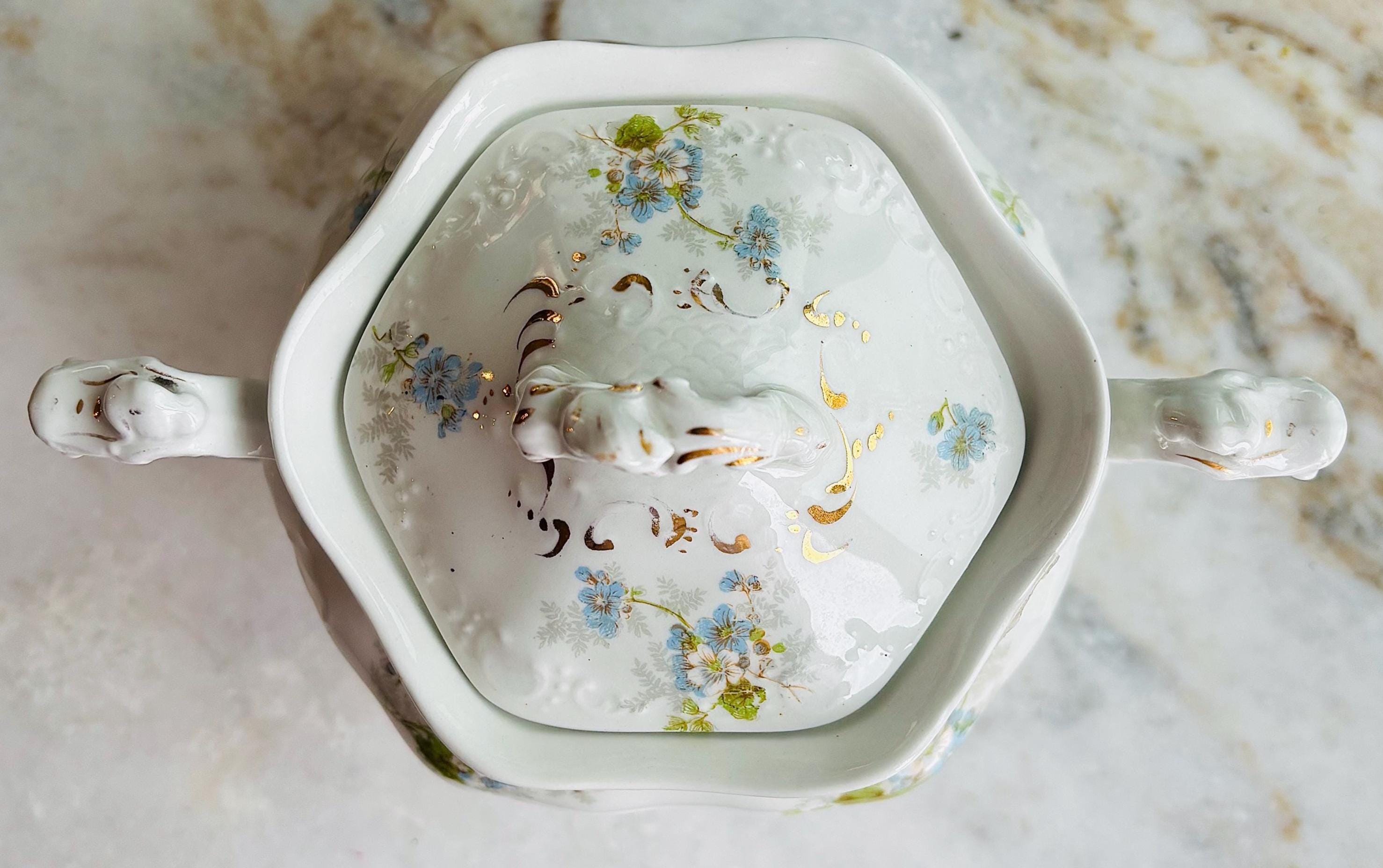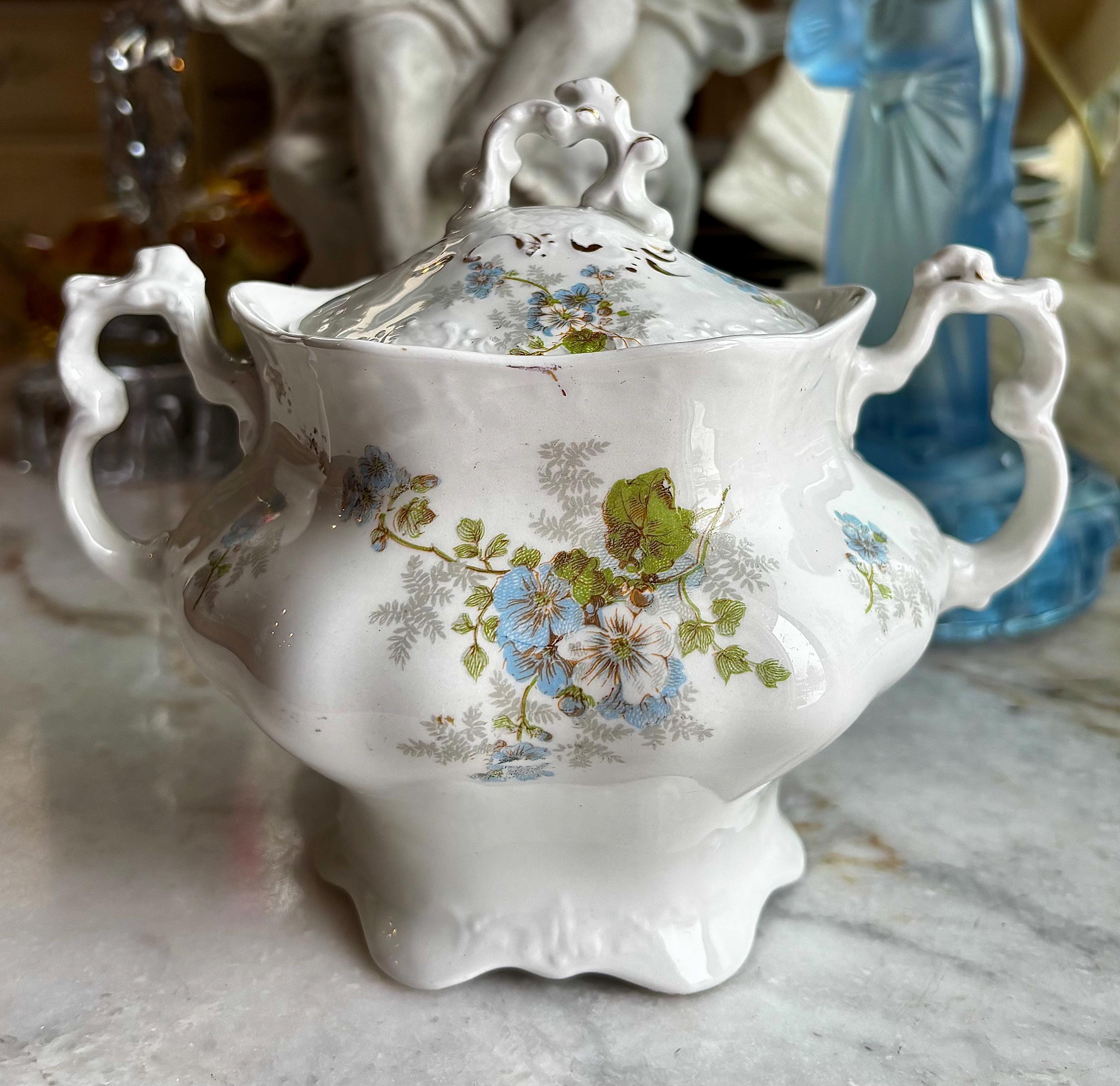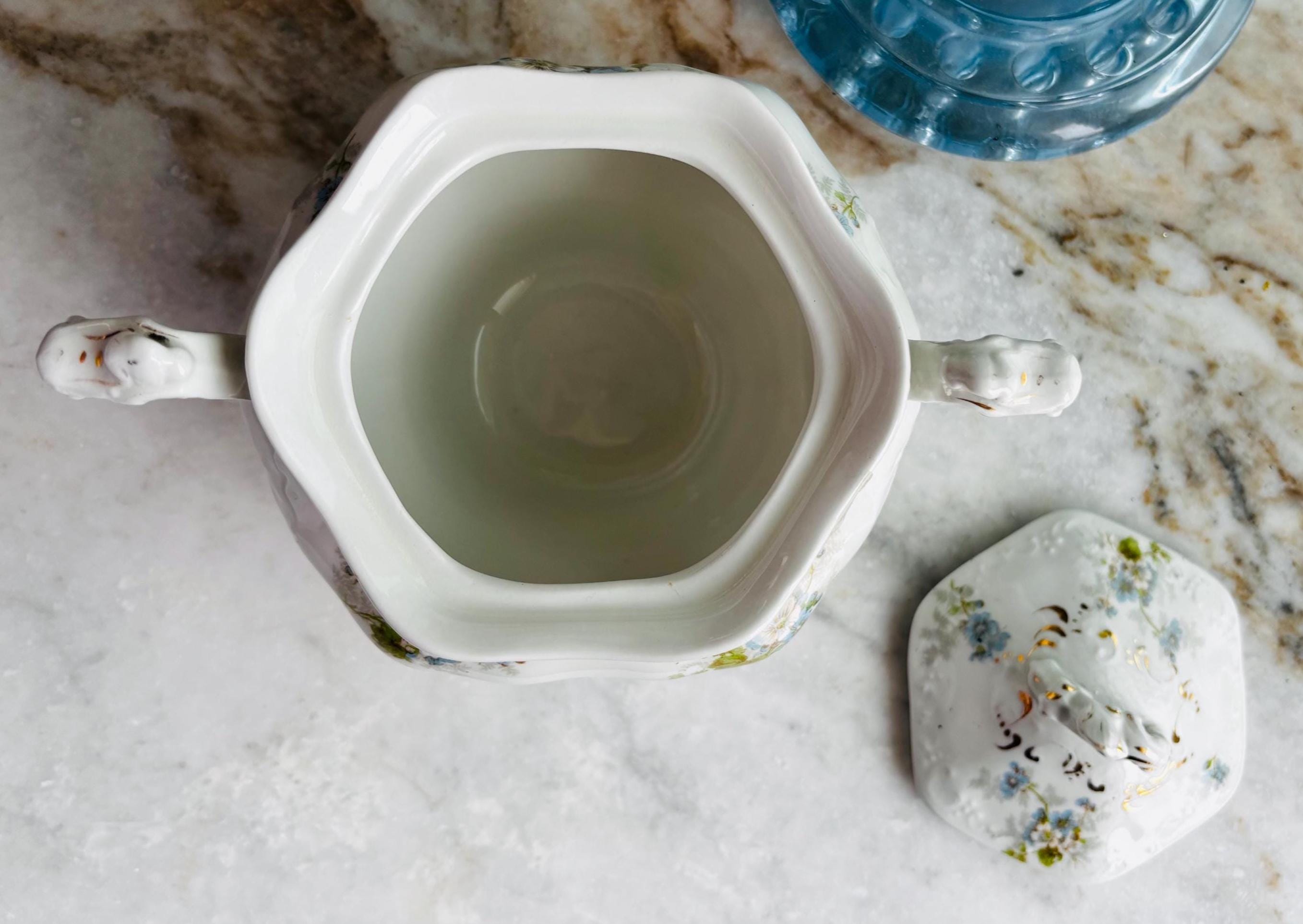 Circa 1920's, this highly ornate sugar bowl, has hand painted baby blue & white flowers, with green leaves trailing and rambling throughout. Highly embossed details of fish scales on lid and scrolling details everywhere!